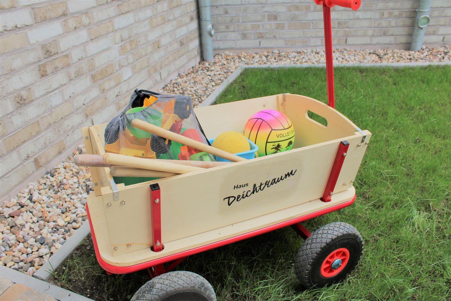 Zusätzliche Kinderausstattung: Kinderreisebett mit Matratze (Zustellbett), Kinderhochstuhl, Babyhochstuhl, mobile Bettgitter (2x), Kindertoilettensitz, Kindertritthocker in den Badezimmern, Steckdosenschutz, Treppenschutzgitter, Baby-Badewanne, Bollerwagen, Sandspielzeug