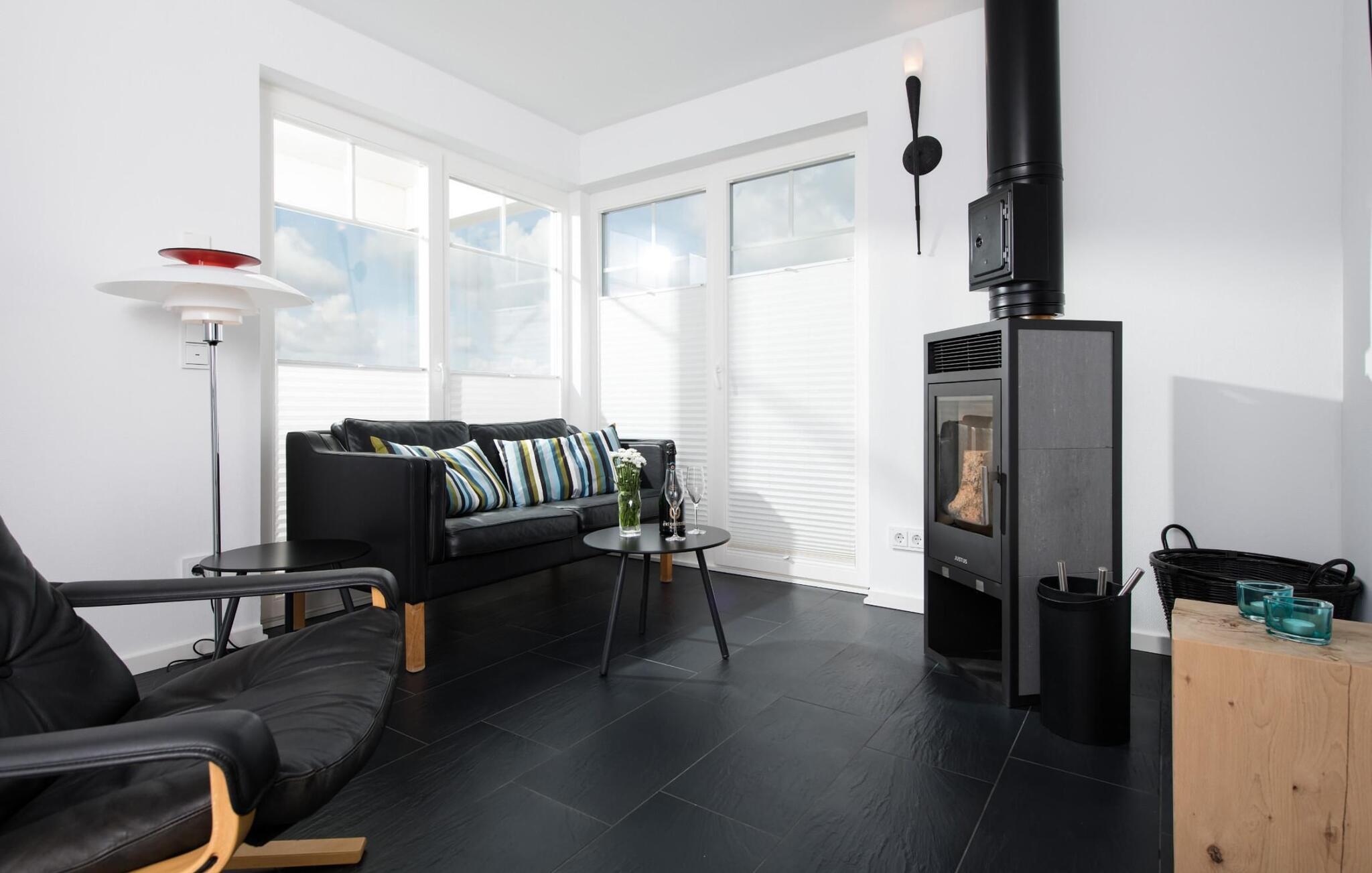 Über den Dingen verweilen lässt es sich im Studio des zweiten Obergeschosses, einem zusätzlichen Wohnbereich mit phänomenalem Ausblick: Zur einen Seite Strand und weite Ostsee, zur anderen Seite der Hafen und die Schlei. Die umlaufende Dachterrasse lädt zum Sonnenbaden und romantischen Sonnenuntergängen ein. Ob mit Buch und Wein, bei einem spannenden Film oder romantisch vor dem knisternden Feuer des Kamins, das Studio stellt das Highlight der Strandvilla dar, denn hier lässt sich die Seele baumeln lassen.