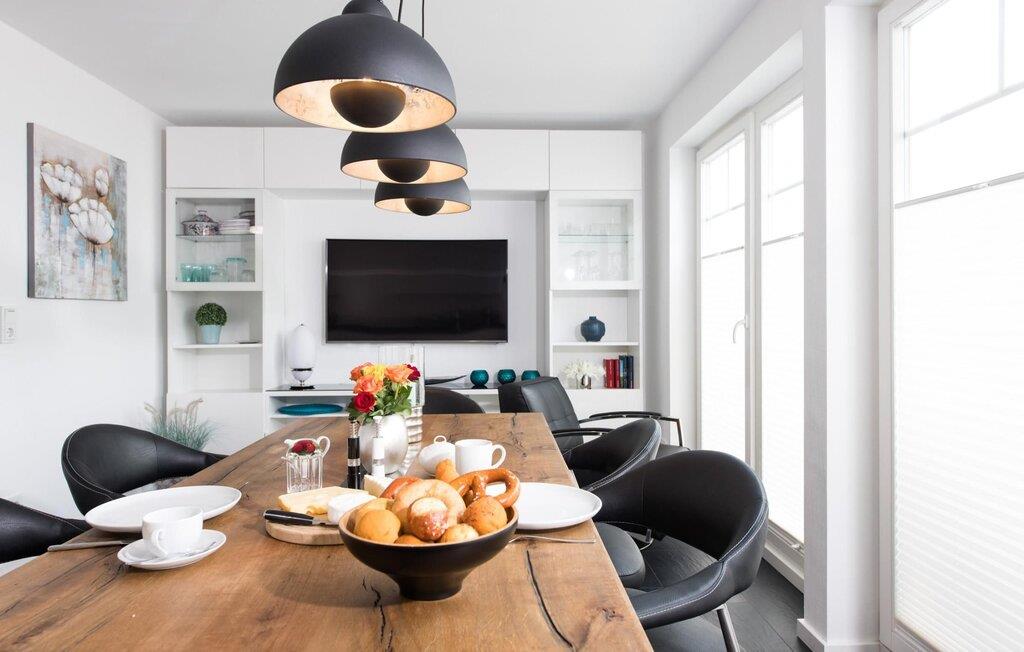 Lichtdurchflutet gestaltet sich der Wohn- /Essbereich des Ferienhauses. Durch die bodentiefe Fensterfront fällt der Blick auf die anliegende