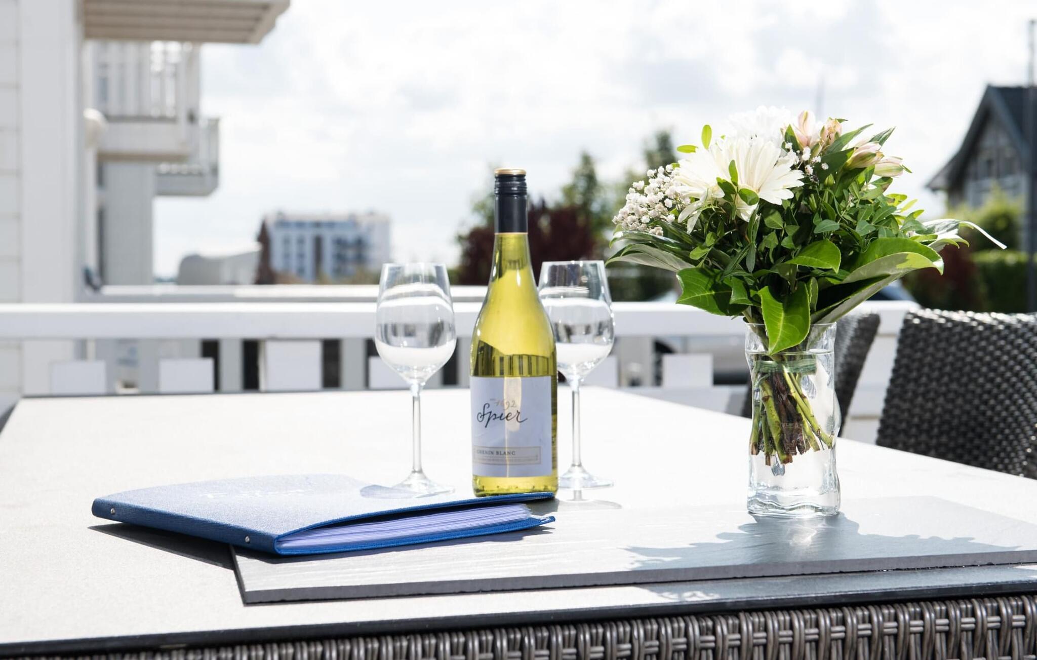 Unser Lieblingsplatz: Auf der Dachterrasse vor dem Studio die Füße hochlegen mit einem Buch in der Hand bei Hafen-, Strand- und Ostseeblick entspannt den Sonnenuntergang genießen.