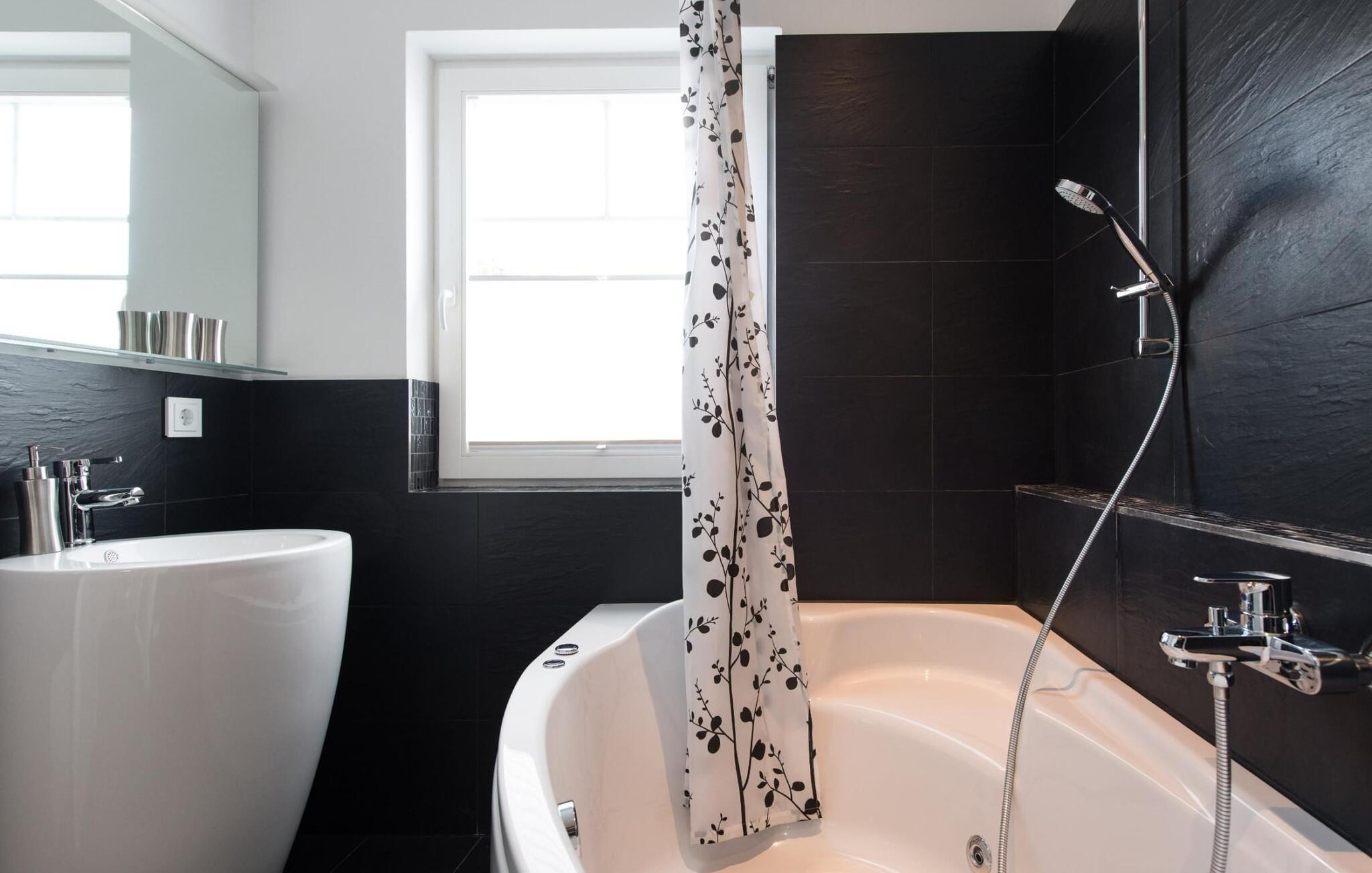 Für Wellnessmomente sorgt auf dieser Ebene zudem ein großes Badezimmer mit Eck- Whirlpool-Badewanne für zwei Personen.