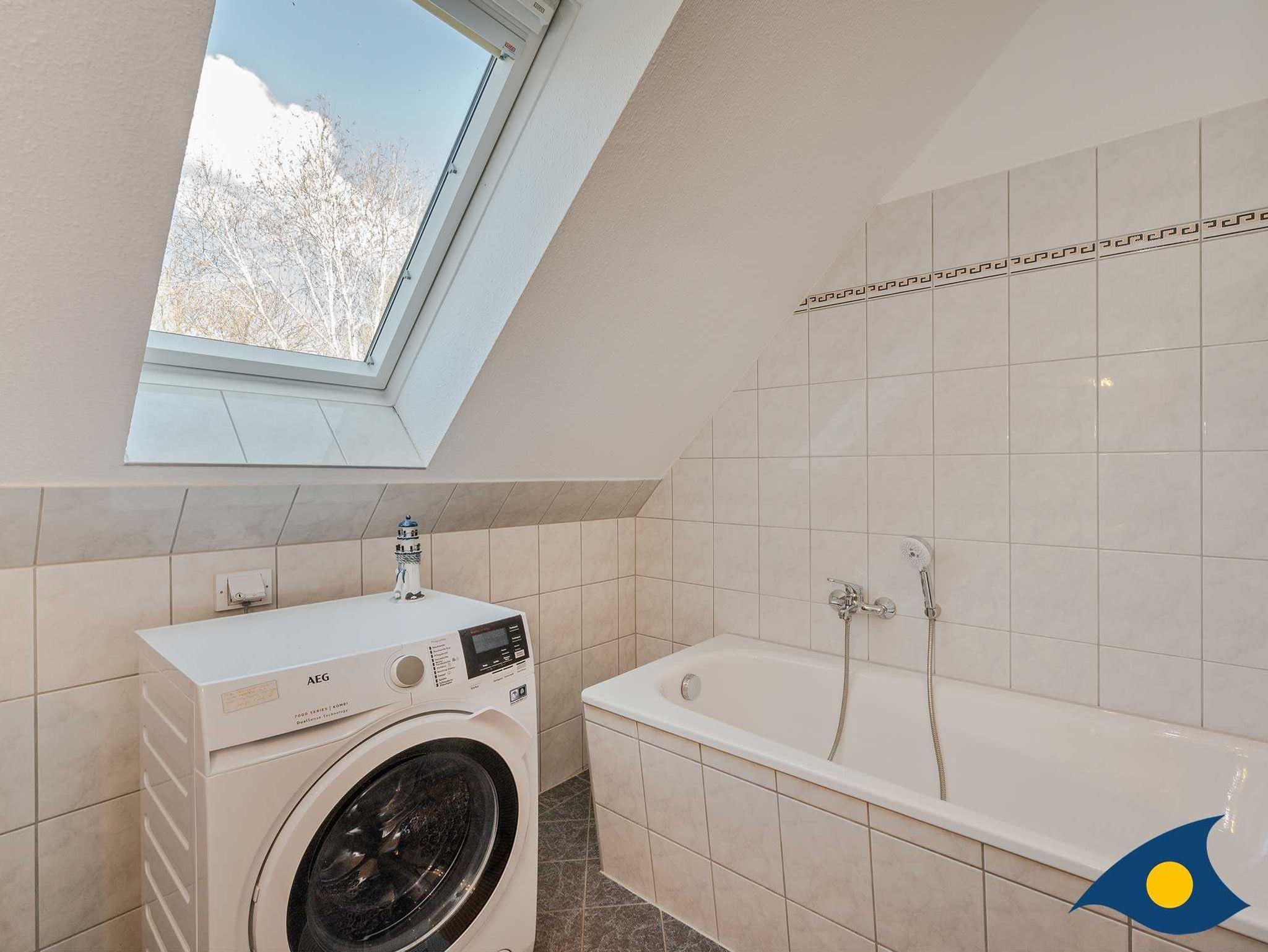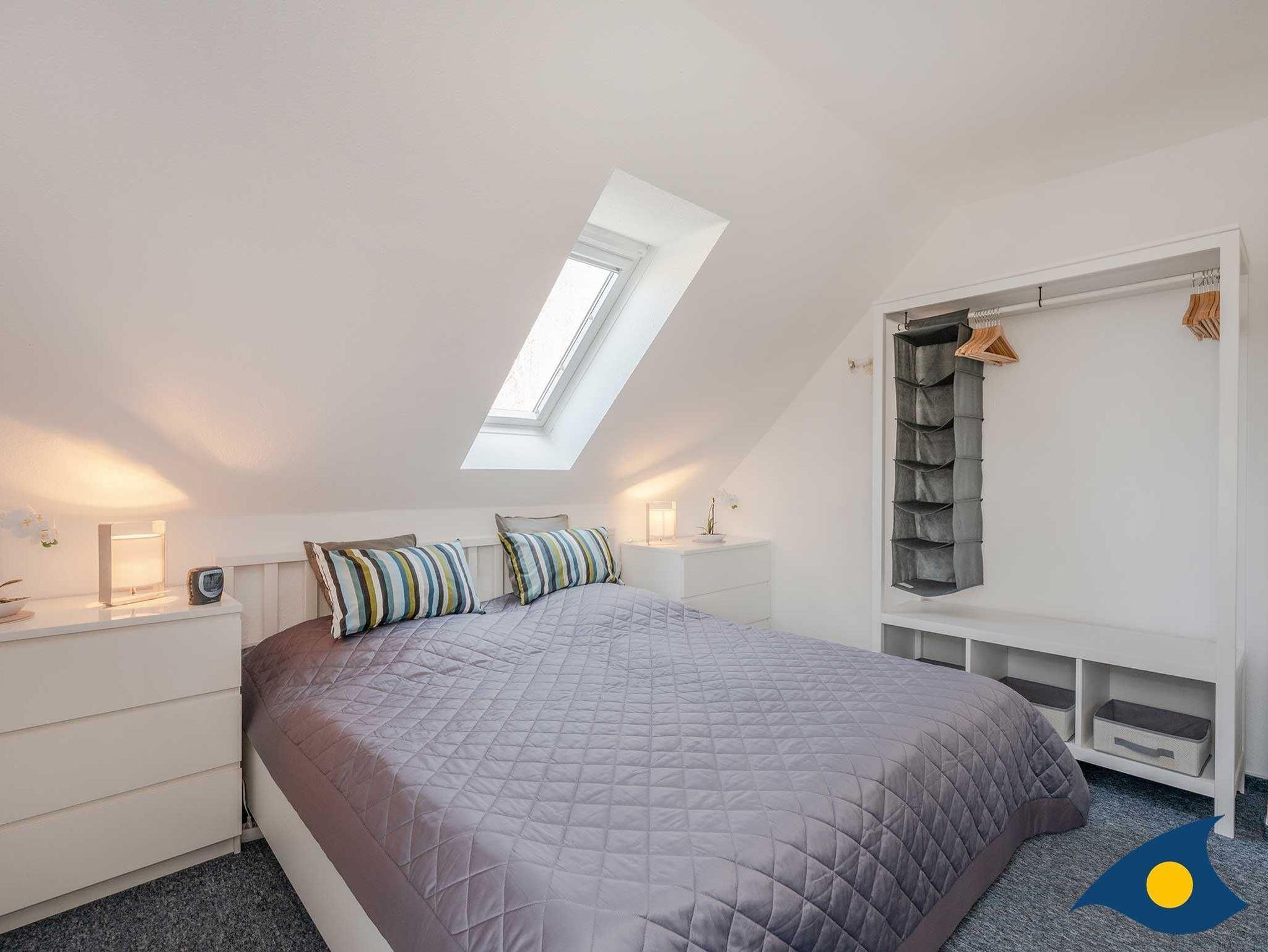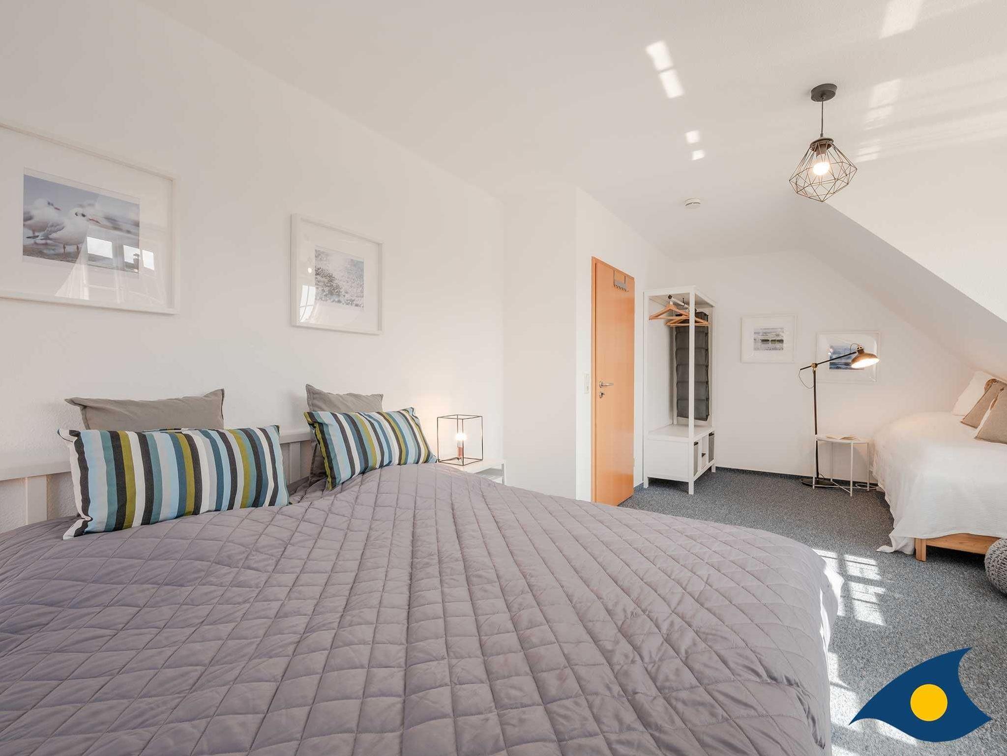 Im Obergeschoss stehen Ihnen zwei Schlafzimmer mit Doppelbetten zur Verfügung. Die Räume sind großzügig aufgeteilt, so dass auch die zwei stappelbaren Einzelbetten Raum finden. Wenn Sie diese nicht benötigen, dienen sie als bequemes Daybed. Das Badezimmer ist mit einer Badewanne ausgestattet und ein Waschtrockner steht kostenfrei für Sie bereit.