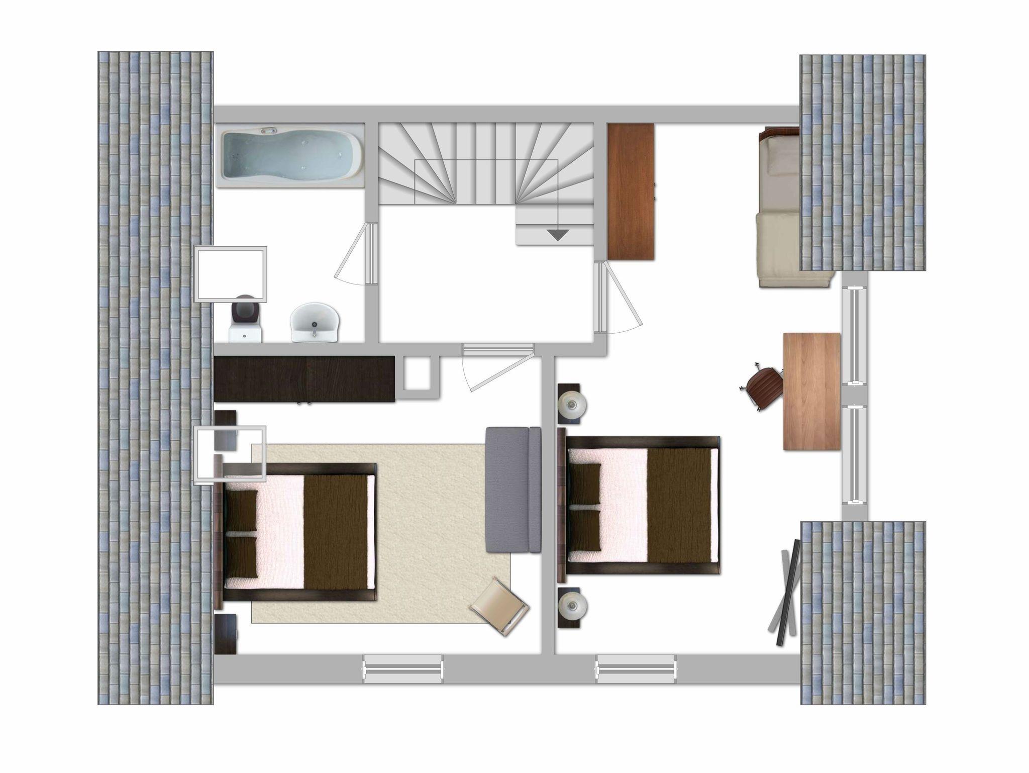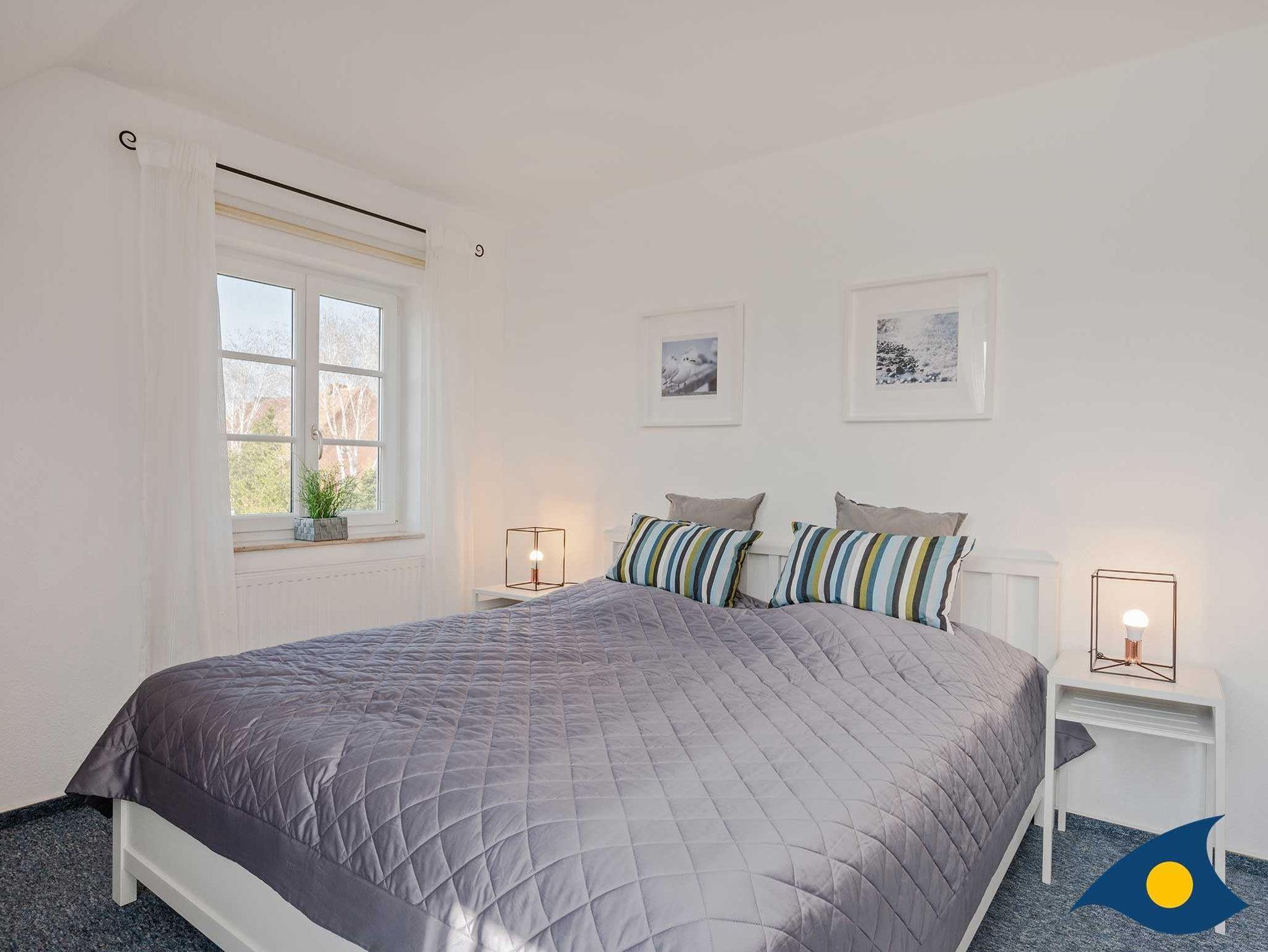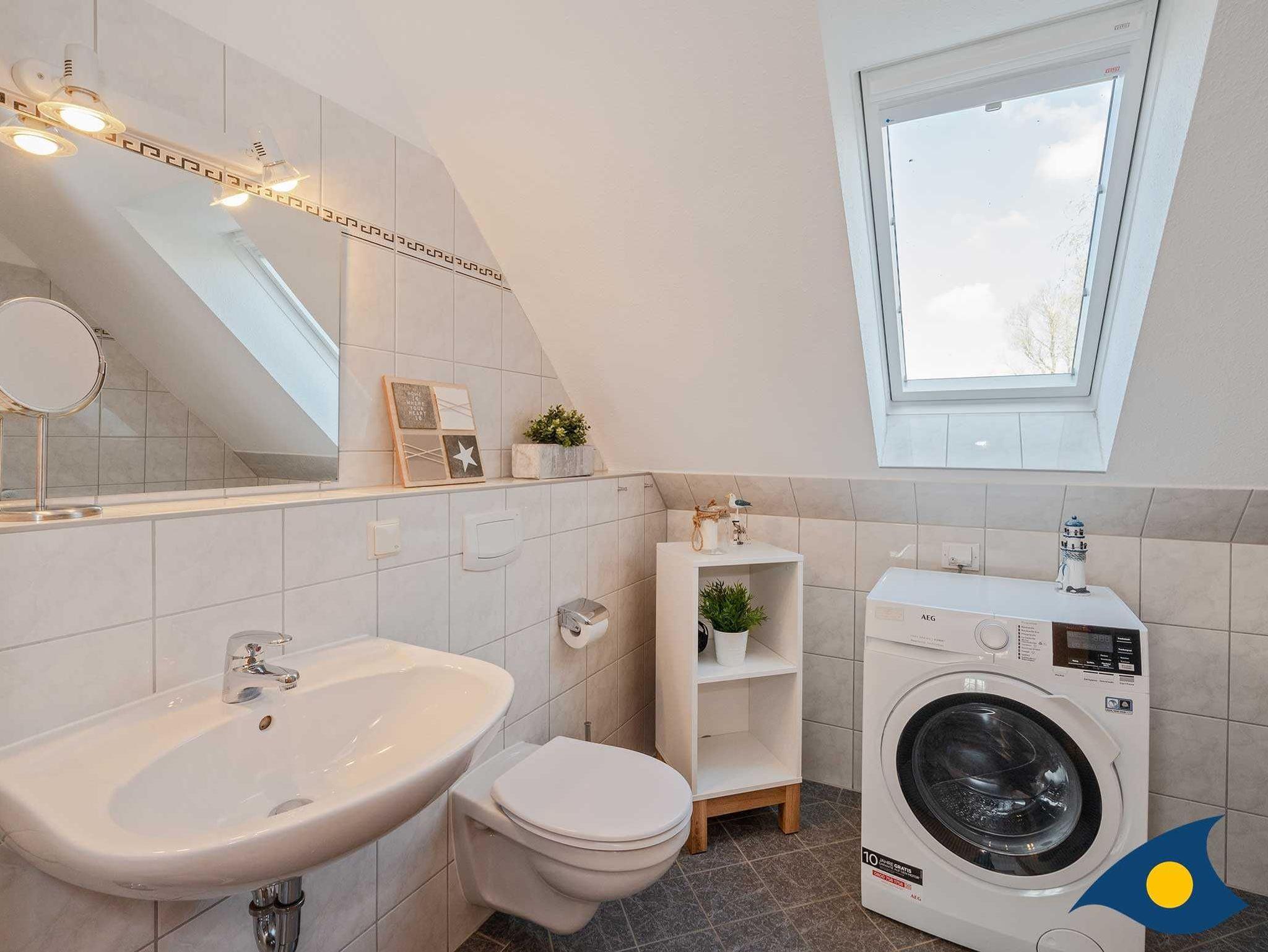 Im Obergeschoss stehen Ihnen zwei Schlafzimmer mit Doppelbetten zur Verfügung. Die Räume sind großzügig aufgeteilt, so dass auch die zwei stappelbaren Einzelbetten Raum finden. Wenn Sie diese nicht benötigen, dienen sie als bequemes Daybed. Das Badezimmer ist mit einer Badewanne ausgestattet und ein Waschtrockner steht kostenfrei für Sie bereit.