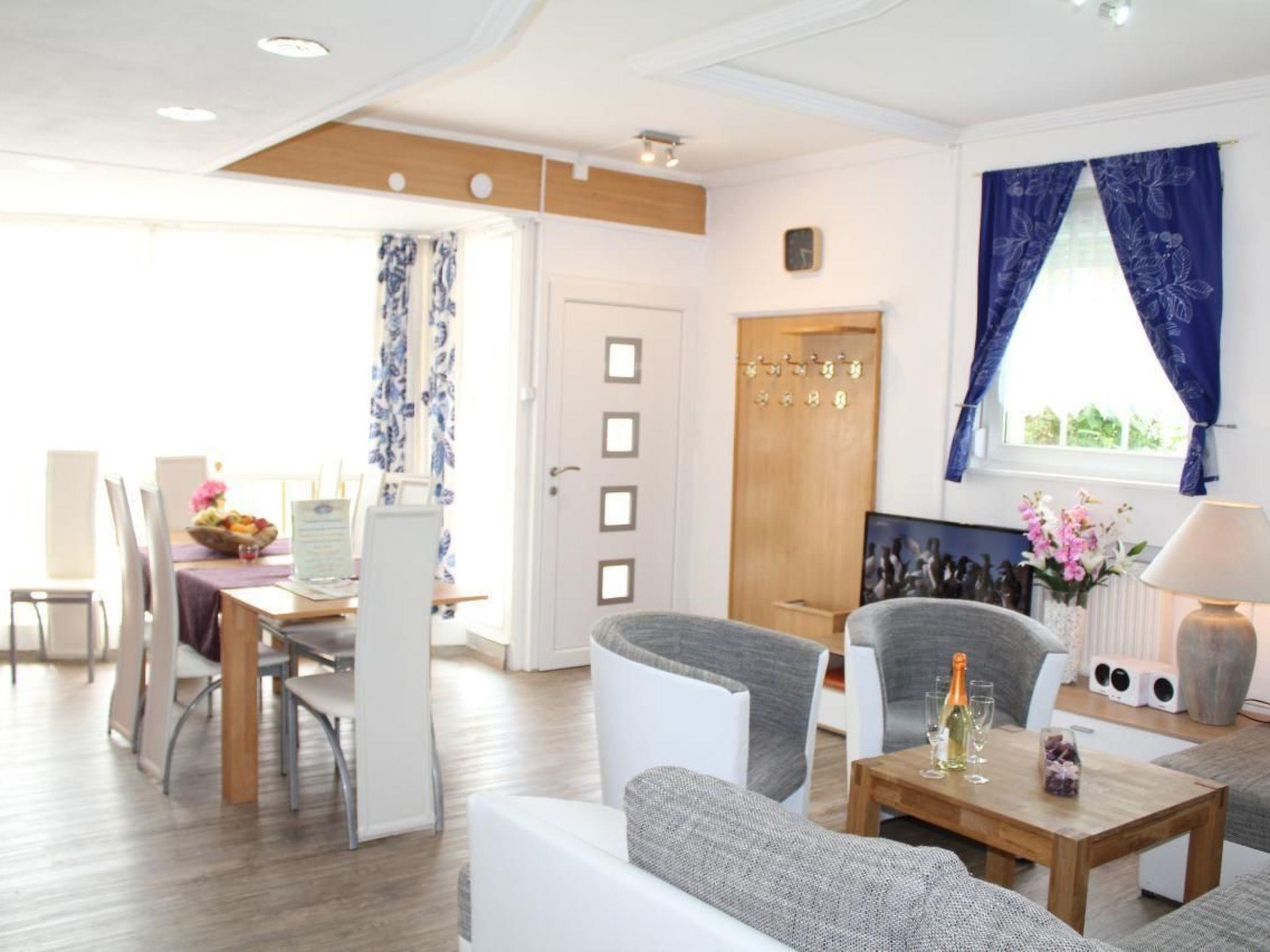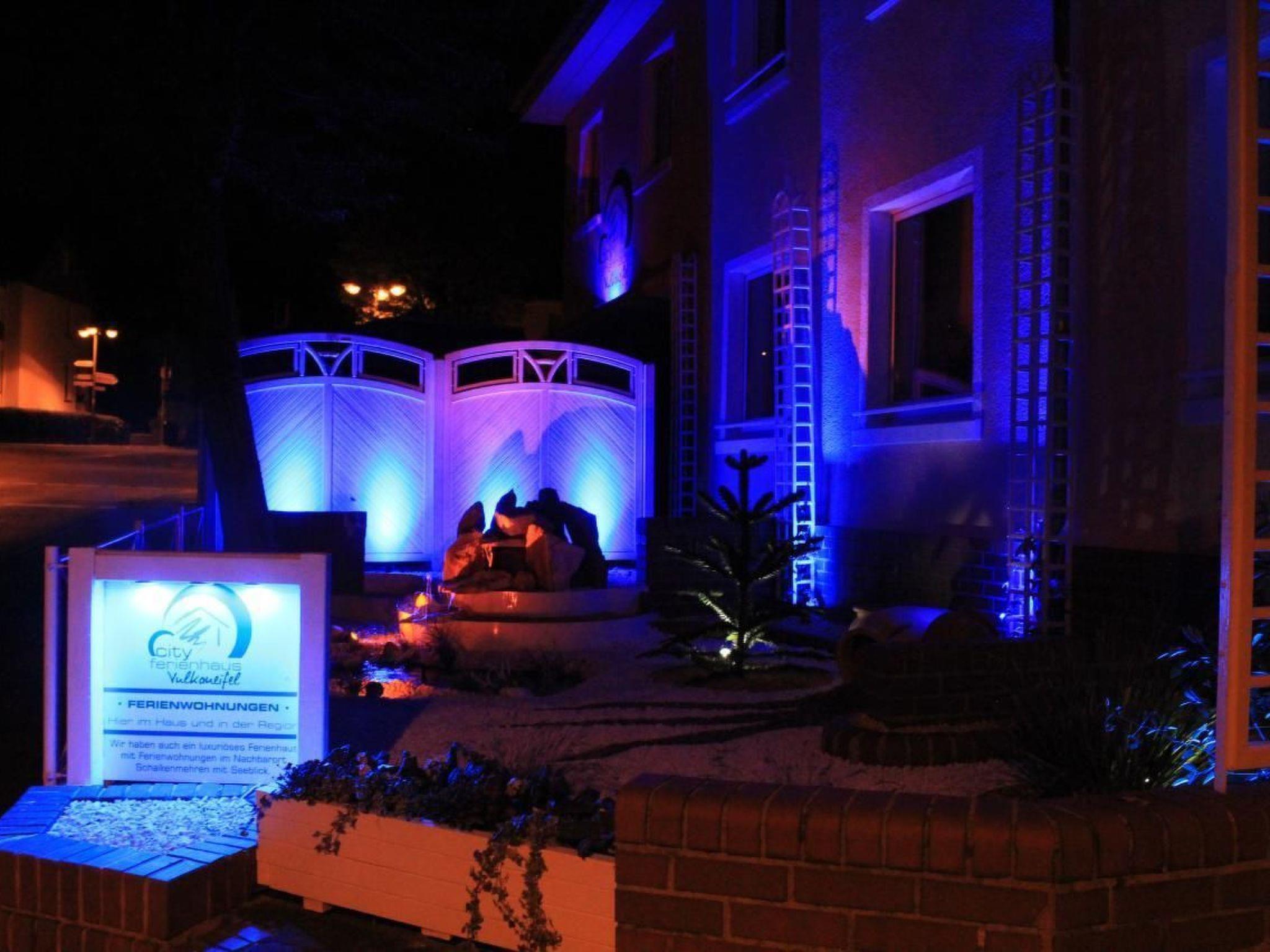 Vulkaneife holiday apartmentThe Vulkaneifel holiday flat is bright and modernly furnished. It is located in the centre of the beautiful holiday resort, the small town of Daun, and the outdoor area of the house includes an approx. 45 m² terrace with garden furniture and a barbecue. The terrace borders the busy street to the front and a small park to the side. Due to the central location of the house (road traffic), the terrace is enclosed by a fence and hedges. The separate entrance to the house leads into the house from the street via the terrace. New: Sauna in the basement (for exclusive use, free of charge)! Behind the house there is also a well-kept and quiet garden with lawn, additional seating area, 2nd barbecue, fountain and children's play tower with 2 swings, sandpit and slide. This outdoor area can also be used. The outdoor area has been lovingly and lavishly furnished with an ornamental gravel area and a small waterfall with fountain, and a special atmosphere is created in the evening with the colour-coordinated LED lighting of the house and the outdoor facilities. the Vulkaneifel holiday flat is approx. 90 sqm in size and extends over 2 floors in the Vulkaneifel City Holiday Home. on the ground floor there is a kitchen-living room and 2 separate bedrooms. In the basement there are 2 bathrooms and a toilet and the flat is suitable for 2 to 6 persons. In the living room there is also a double sofa bed with 2 additional beds. The holiday flat has a kitchen-cum-living room, dishwasher, electric cooker with 4-plate ceramic hob and oven, large fridge with fridge-freezer combination. 2 coffee machines (1 x pod, Bosch Tassimo and 1 x filter machine). The dining area is located in the living area. Decorative electric fireplace in the living area.Internet with WLAN / Wireless is available (free of charge). In the living room: HD TV (107 cm), digital TV with many German and international channels (2 satellites: Astra and Hotbird), digital radio, DVD player, radio, CD player (can also be used with USB stick), ceiling fan, games etc. Wardrobe. In the basement there are 2 bathrooms, 1 x bathtub and sep. shower, washing facilities, WC and 1 x shower, washing facilities. Both bathrooms have a large illuminated LED mirror with time and date display and a large full-length mirror and a hotel hairdryer, 2 modern countertop washbasins with LED-lit fittings. In addition, a music system with CD/radio and USB connection is installed in each bathroom. New: Sauna in the basement (for exclusive use, free of charge)! Microwave, coffee machine, toaster and kettle. Pots and pans as well as cutlery and crockery for the maximum possible number of people are of course available. A cot and high chair can be provided free of charge and there is a washing machine and tumble dryer in the basement of the house. The appliances can be used for a small fee (including detergent).the holiday flat has parking spaces behind the house.many sights and leisure facilities are only a few minutes' walk away. Shopping, restaurants, cafes, cinema, wellness or indoor hot water pool etc. are just around the corner. A large supermarket and 3 bakeries (also with Sunday sales) are only about 100 to 150 metres away and the 3 lakes are only 2 to 3 km away. Visit the beautiful spa gardens in Daun.the hiking area Wehrbüsch with connection to the Maaren is only about 600 to 700 m away.a large children's playground is only 100 m away.short descriptionOther : Non smoking houseShort description 1Number of kitchens : 1SurroundingsLeisure facilities : Boat hireSports facilities in the area : FishingGarden and outdoor facilitiesRecreational facilities at the property : SaunaGarden equipment : Barbecue