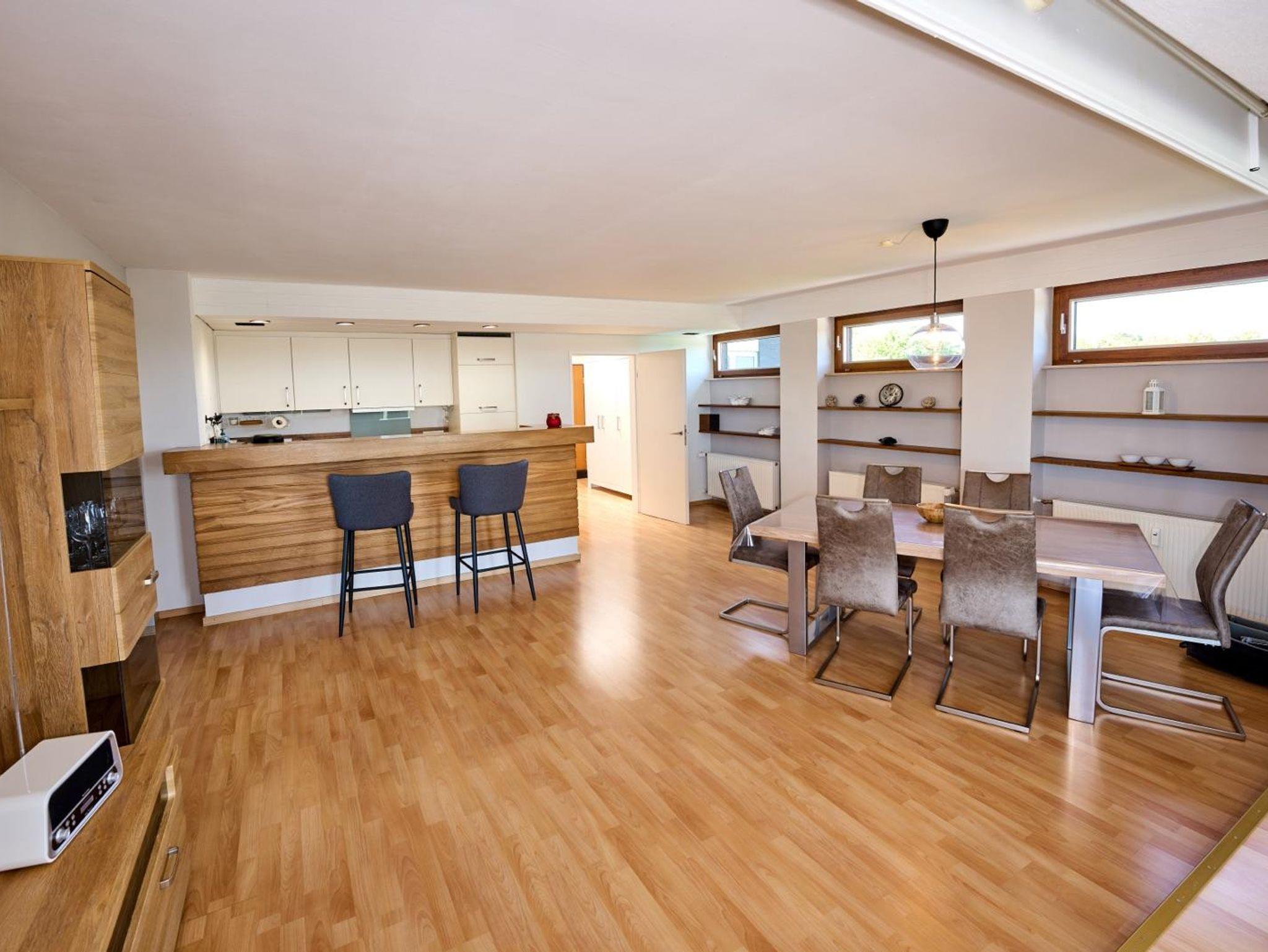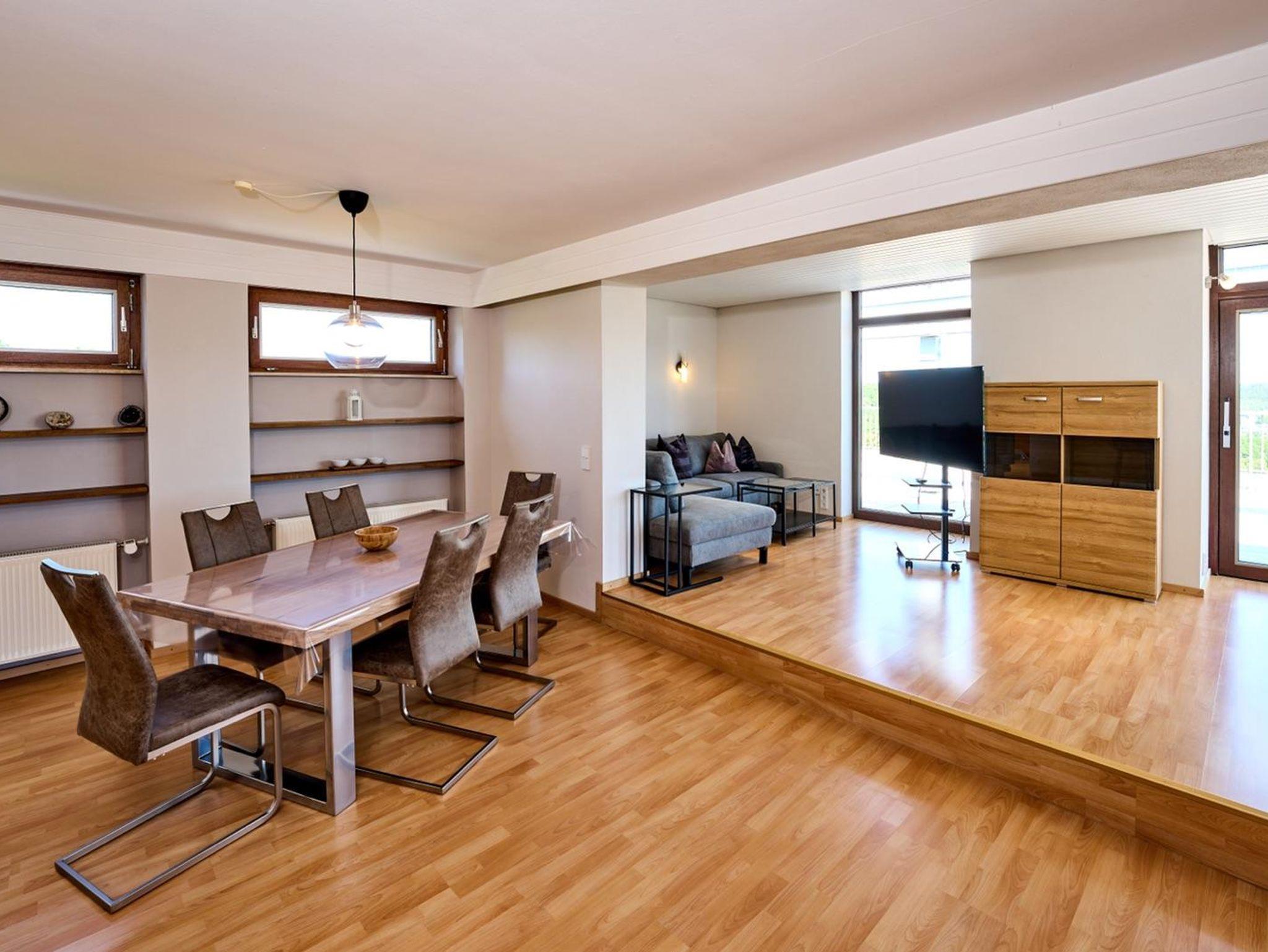 Für das gemütliche Zusammensein steht ein Tisch mit sechs Stühlen zur Verfügung.