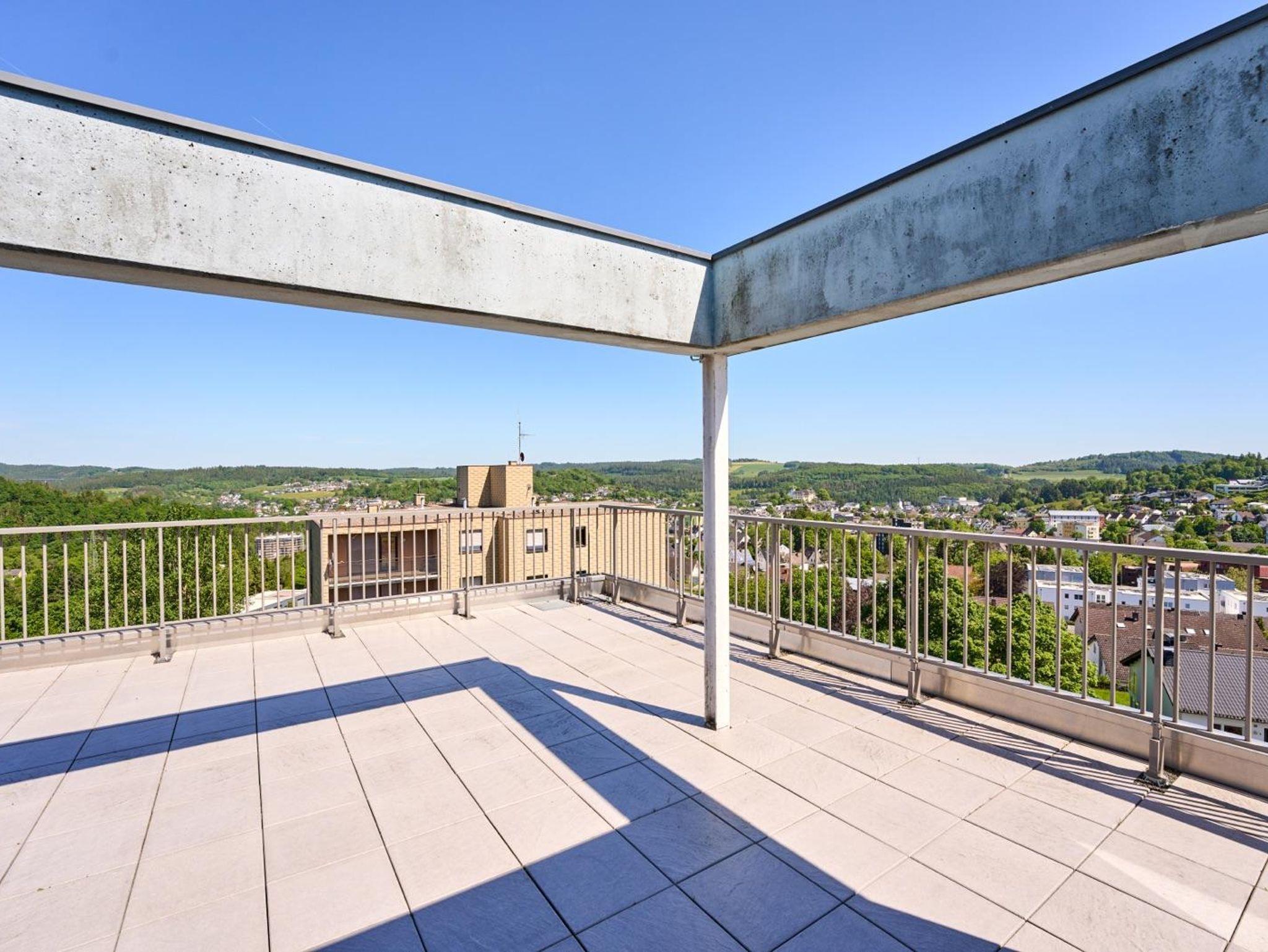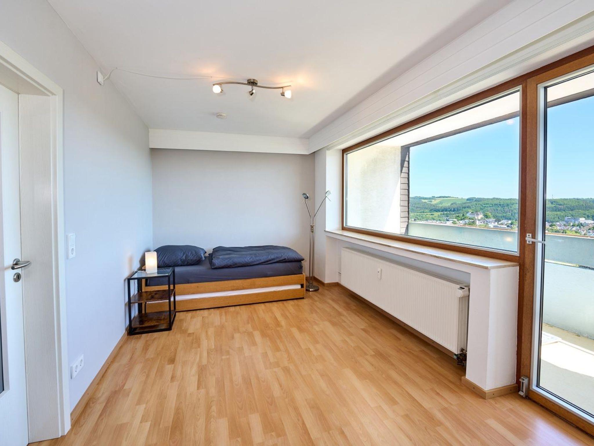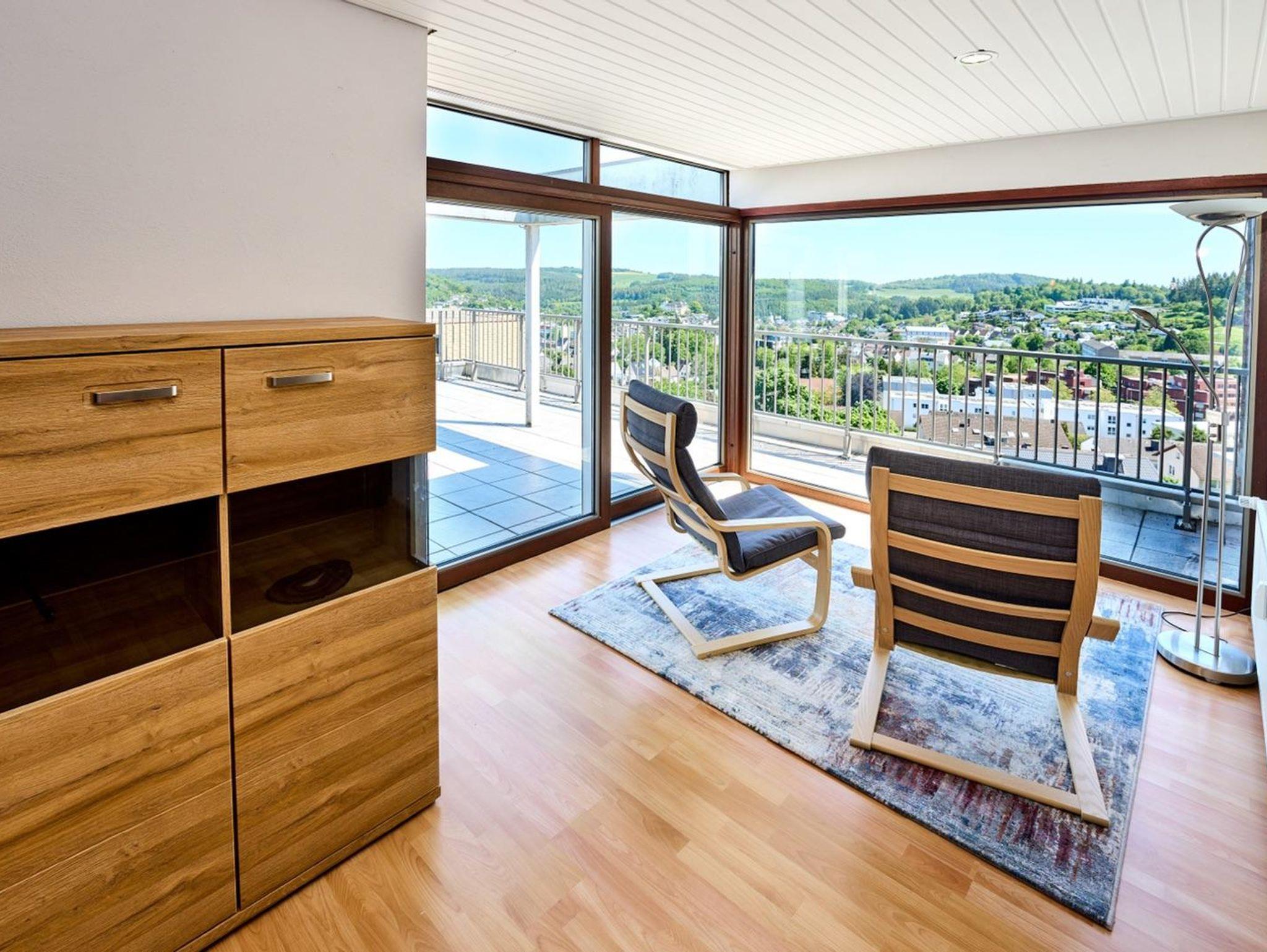 Die Ferienwohnung mit ca. 95 qm Wohnfläche liegt in der obersten 6. Etage eines Mehrfamilienhauses und bietet einen unvergleichbaren Blick auf Daun.