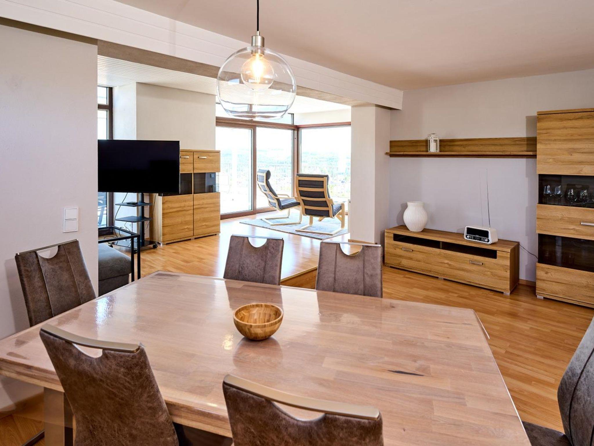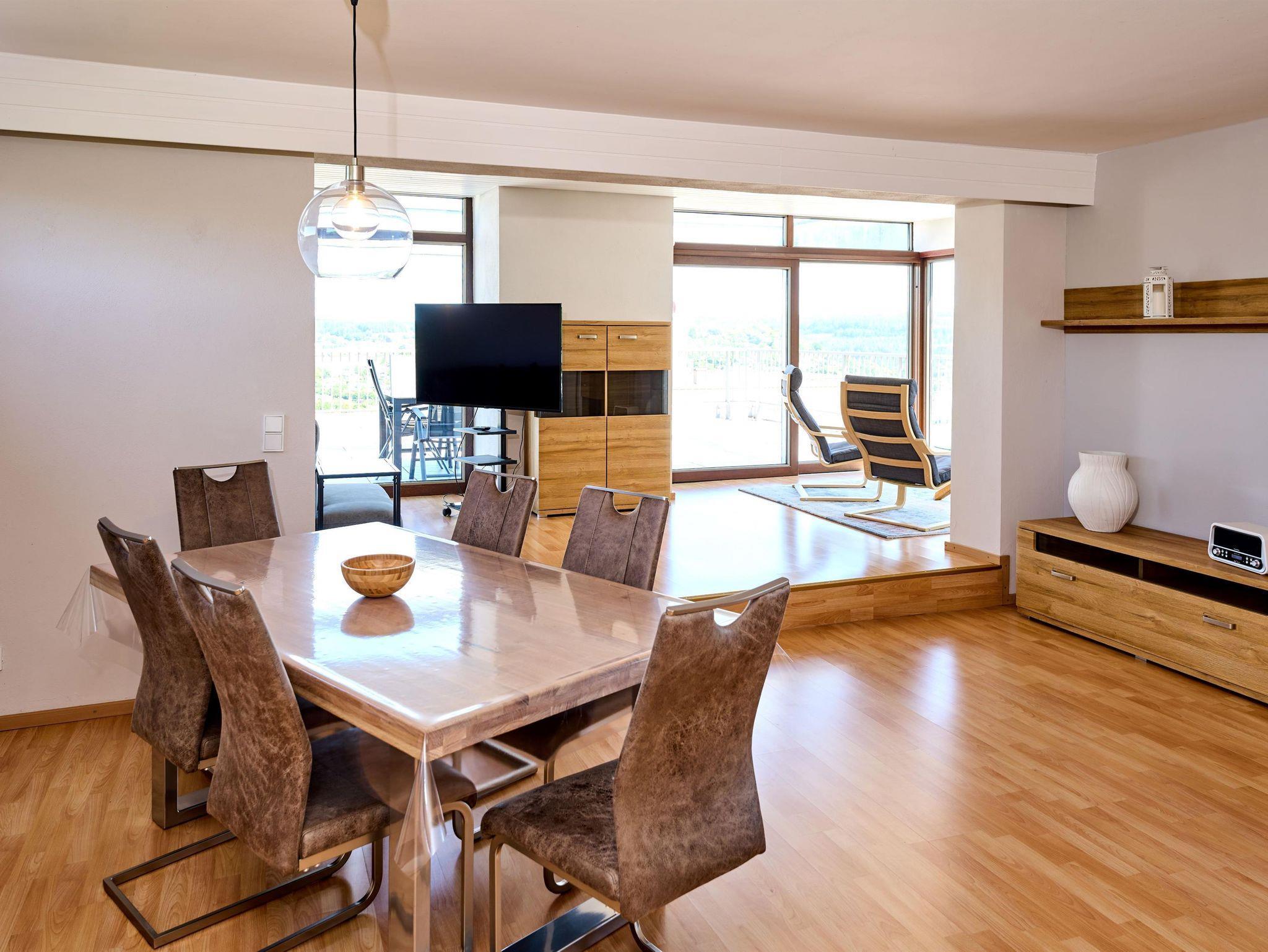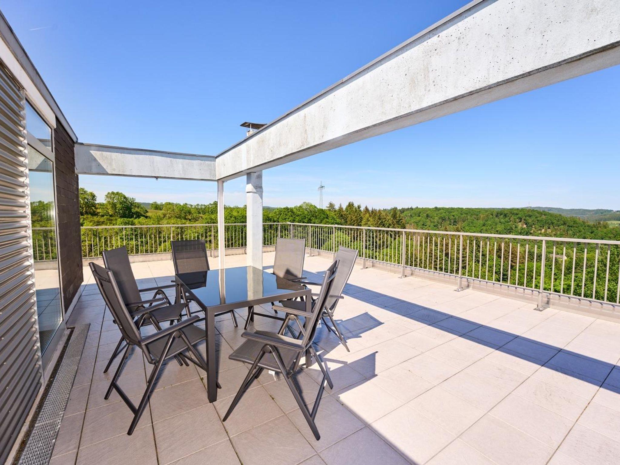 Die Ferienwohnung mit ca. 95 qm Wohnfläche liegt in der obersten 6. Etage eines Mehrfamilienhauses und bietet einen unvergleichbaren Blick auf Daun.