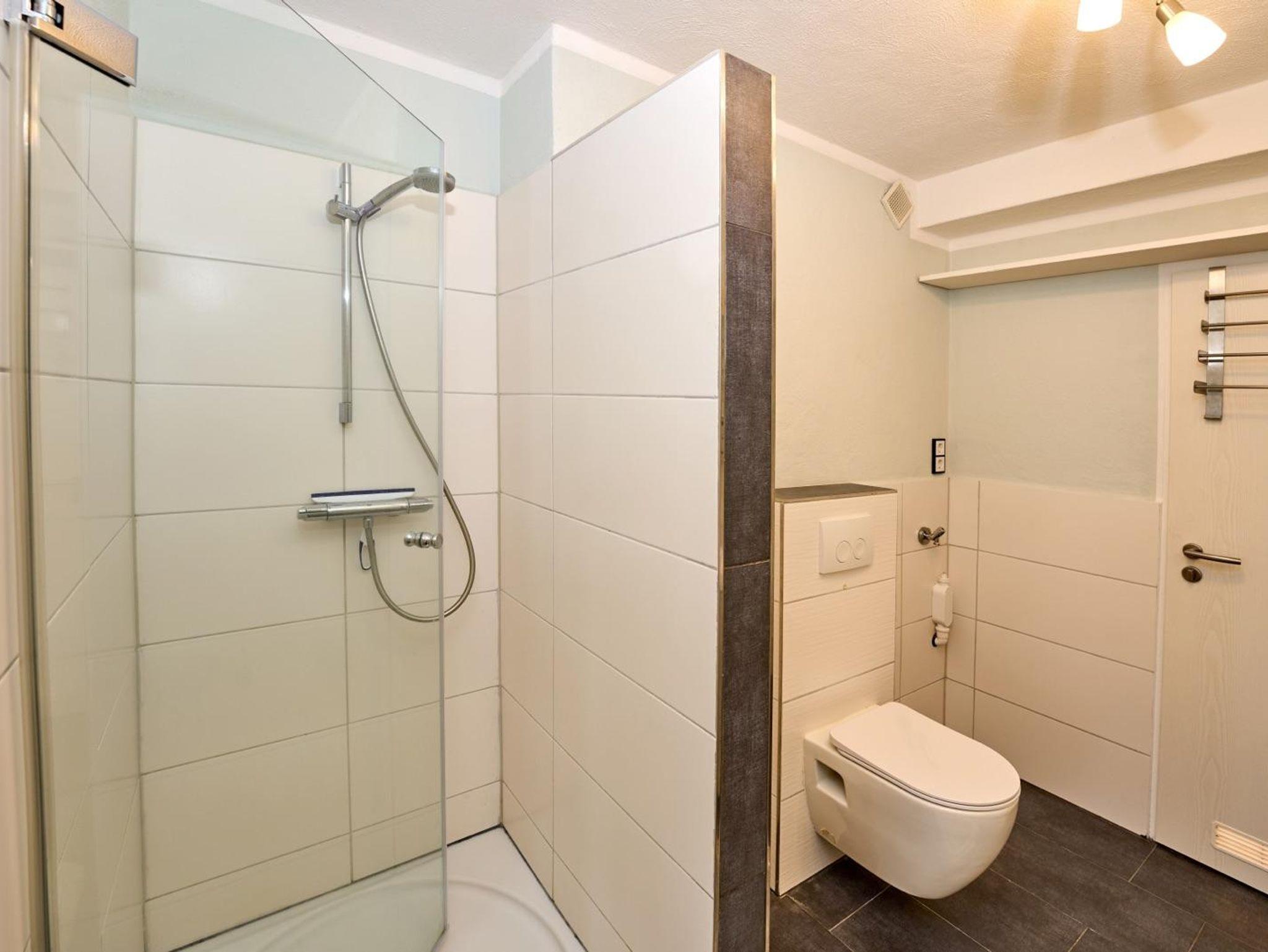 Das Bad verfügt über WC, eine Dusche und ein Doppelwaschbecken.