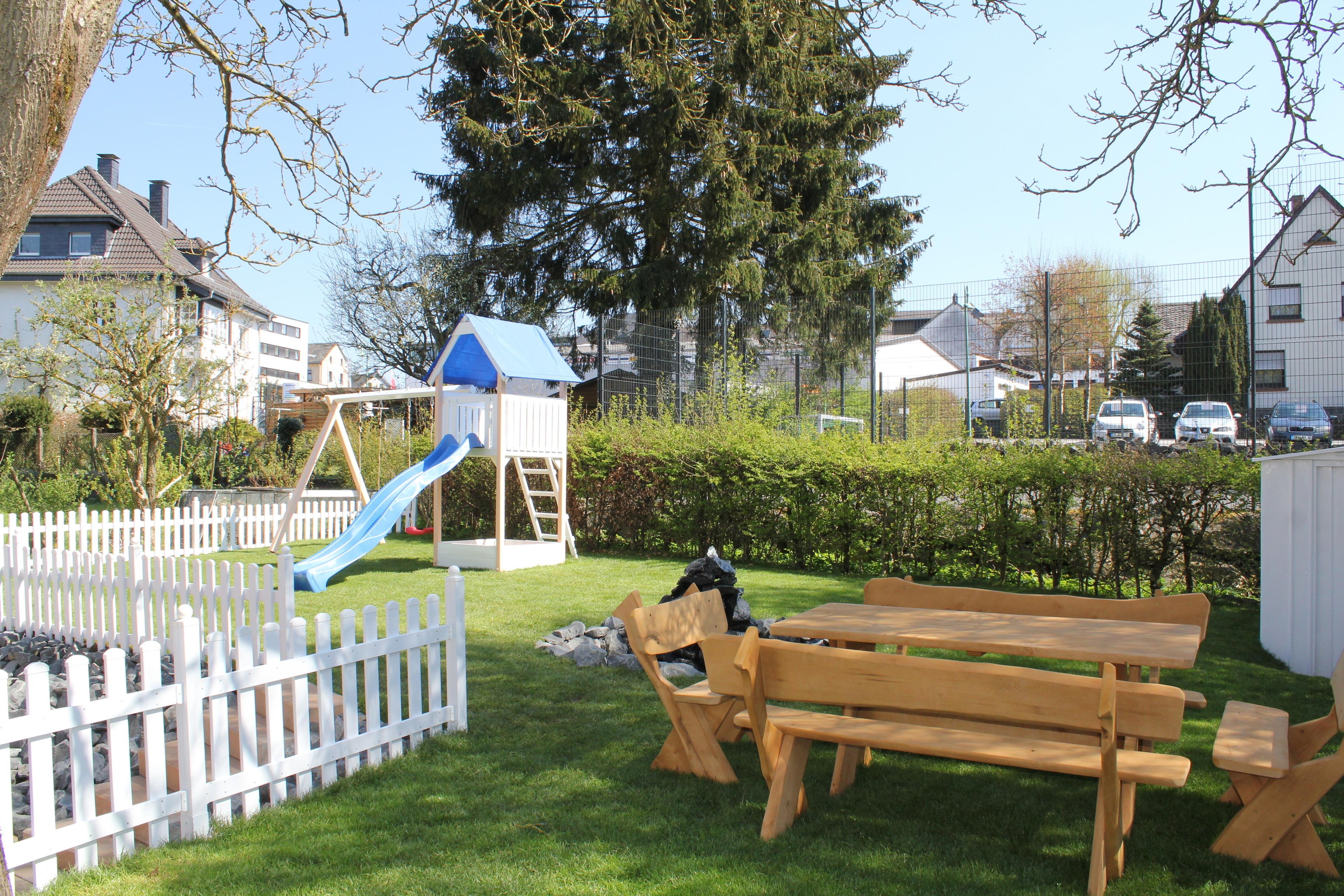 Eine ruhig gelegene Gartenanlage mit Wiese, Sitzgruppe, 2. Grill, Springbrunnen und einem Kinderspielturm (2 Schaukeln, Rutsche, Sandkasten) befindet sich zusätzlich hinter dem Haus und kann mit genutzt werden.