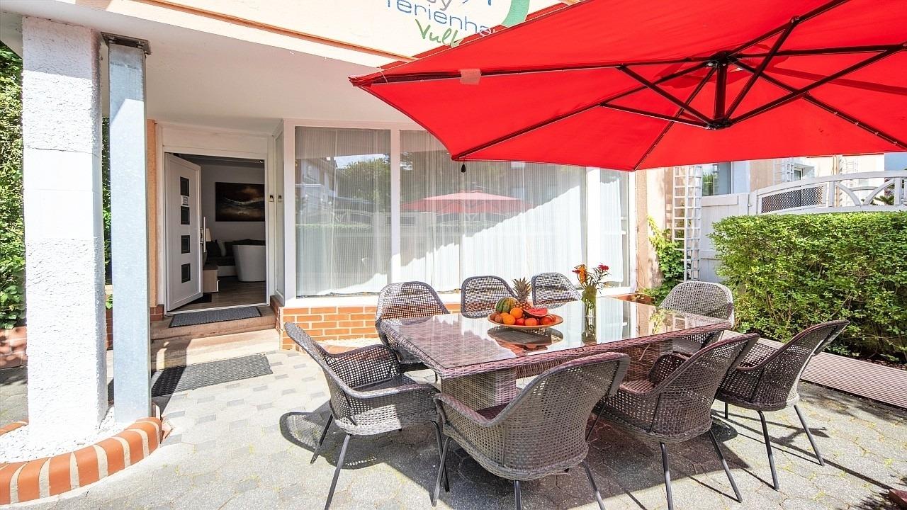 Zum Außenbereich des Hauses gehört eine ca. 45 qm große Terrasse mit Gartenmöbeln. Die Terrasse grenzt zur Vorderseite an die belebte Straße und den Gehweg und seitlich an eine kleine städtische Parkanlage. Aufgrund der zentralen Lage des Hauses wurde die Terrasse mit einem Zaun und Hecken umfriedet. Der separate Eingang des Hauses führt von der Straße über die Terrasse ins Haus.