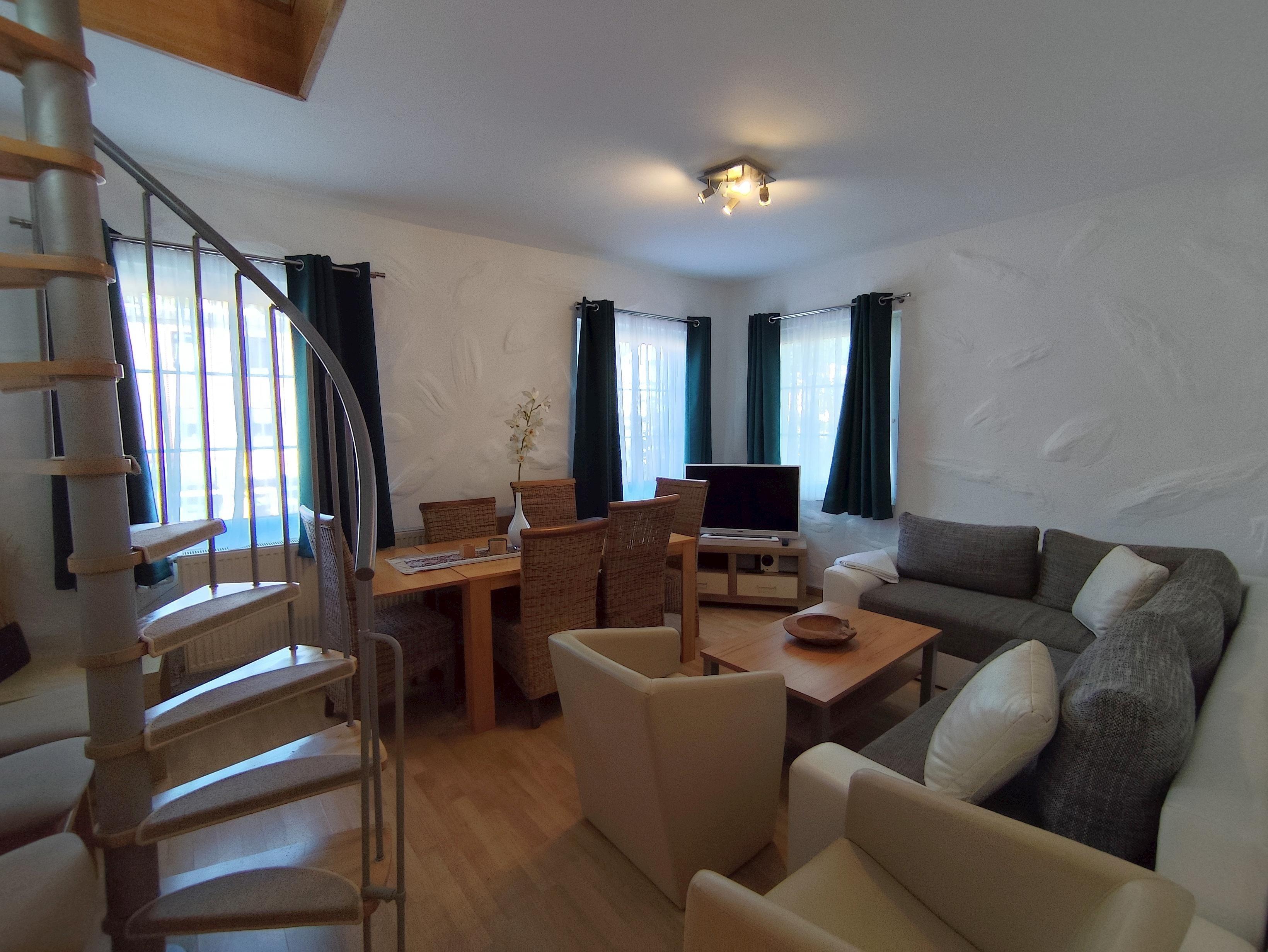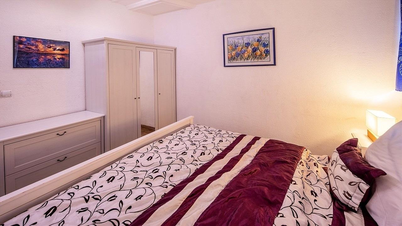Das Ferienhaus erstreckt sich über 4 Etagen und bietet bis zu 14 Personen Platz. Es verfügt über 5 sep. Doppelschlafzimmer, davon ein kleines Zusatzapartment über eine Wendeltreppe ins Obergeschoss erreichbar, 3 Wohn-Schlafräume mit 3 Doppelschlafsofas. Essecke im unteren Bereich mit vergrösserbarem Esstisch für alle Personen, dekorativer Elektrokamin im Wohnraum unten 2. Essecke zusätzlich im Obergeschoß, 4 x HD TV in jedem Wohnraum und im oberen Bad, 4 x DVD-Player, CD-Player, Radio und USB-Anschluß in 3 Wohnräumen und in den 3 Bädern, Deckenventilator, Spiele etc. 2 Küchen, davon eine neue im Obergeschoss, beide Küchen mit Spülmaschinen, 2 x Badewanne und Dusche, 2 x WC (1 x im Obergeschoß und 1 x im Untergeschoß) und noch eine zusätzliche Dusche mit Waschgelegenheit (im Untergeschoß).