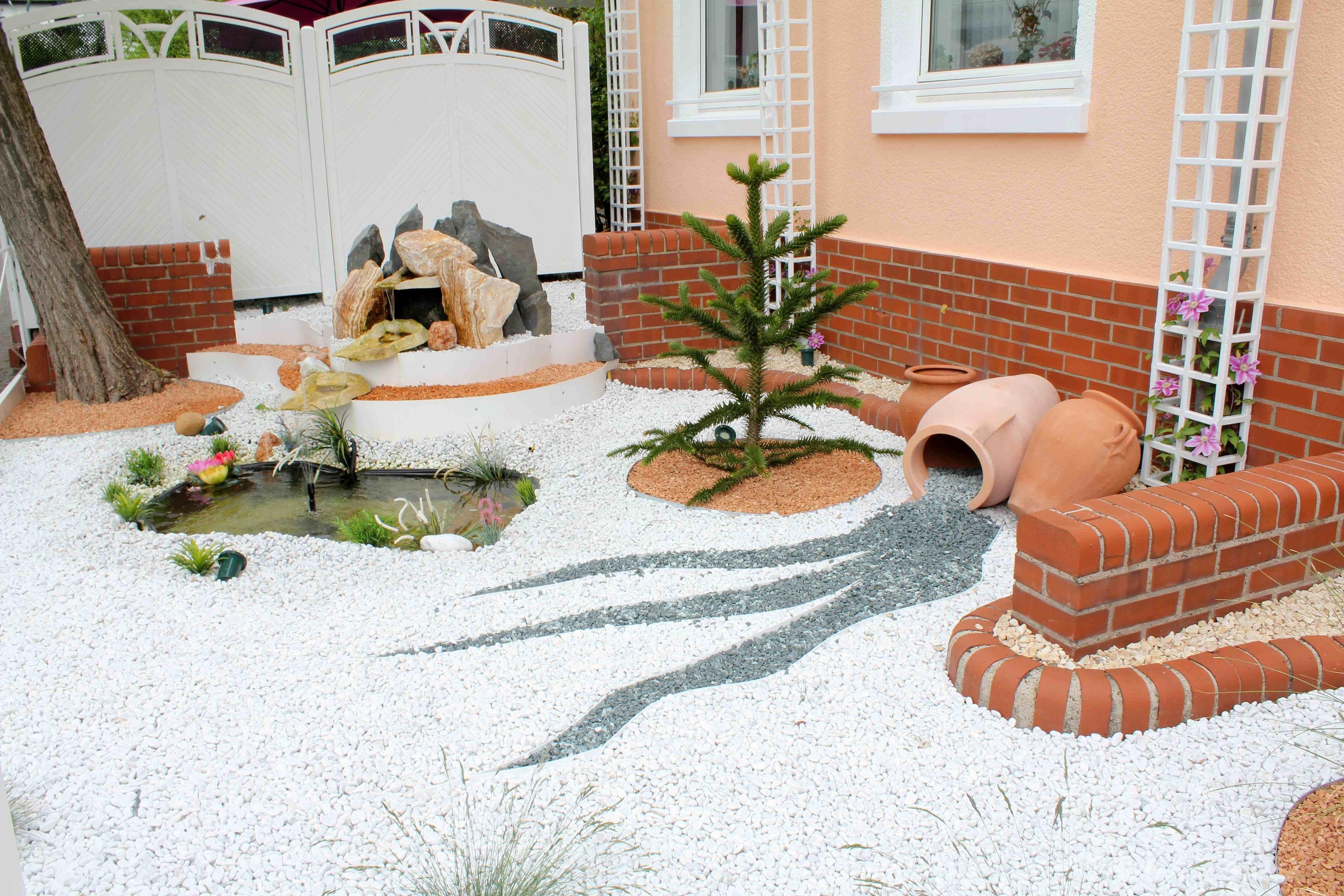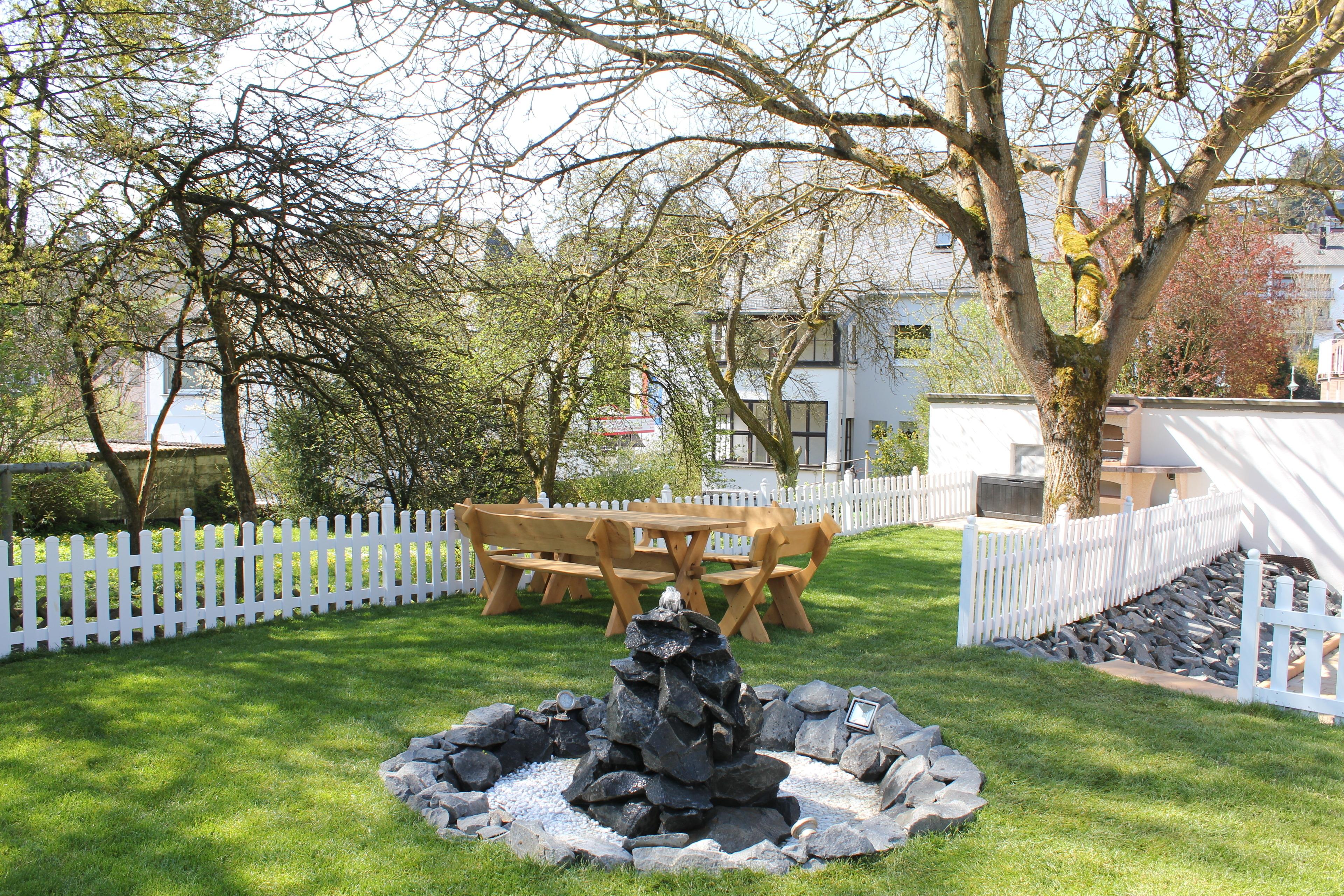 Am Außenbereich des Hauses ist liebevoll und aufwendig ein Zierkiesbereich angelegt worden. Mit Springbrunnen und einem kleinen Wasserfall.