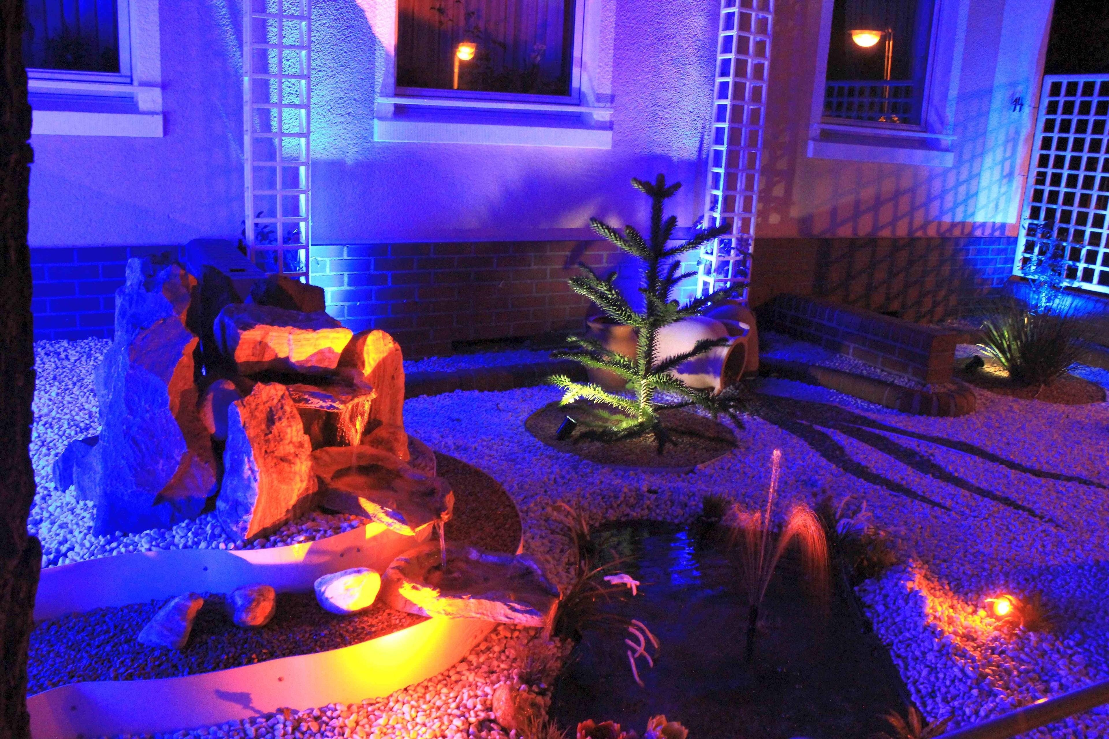 Das Haus und die Außenalagen sind am Abend und nachts sehr attraktiv in einem Farbenspiel mit LED Strahlern angestrahlt.