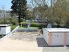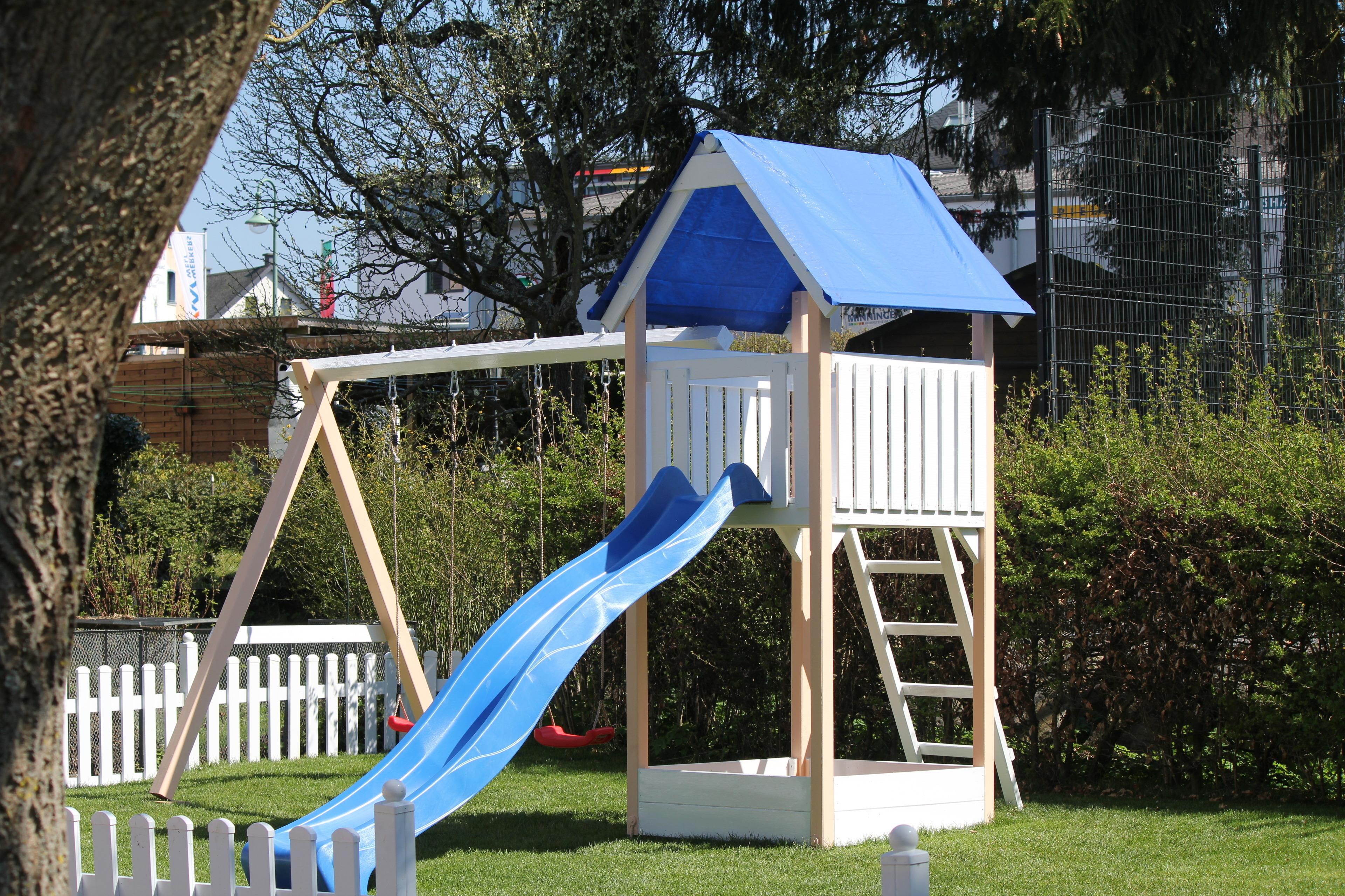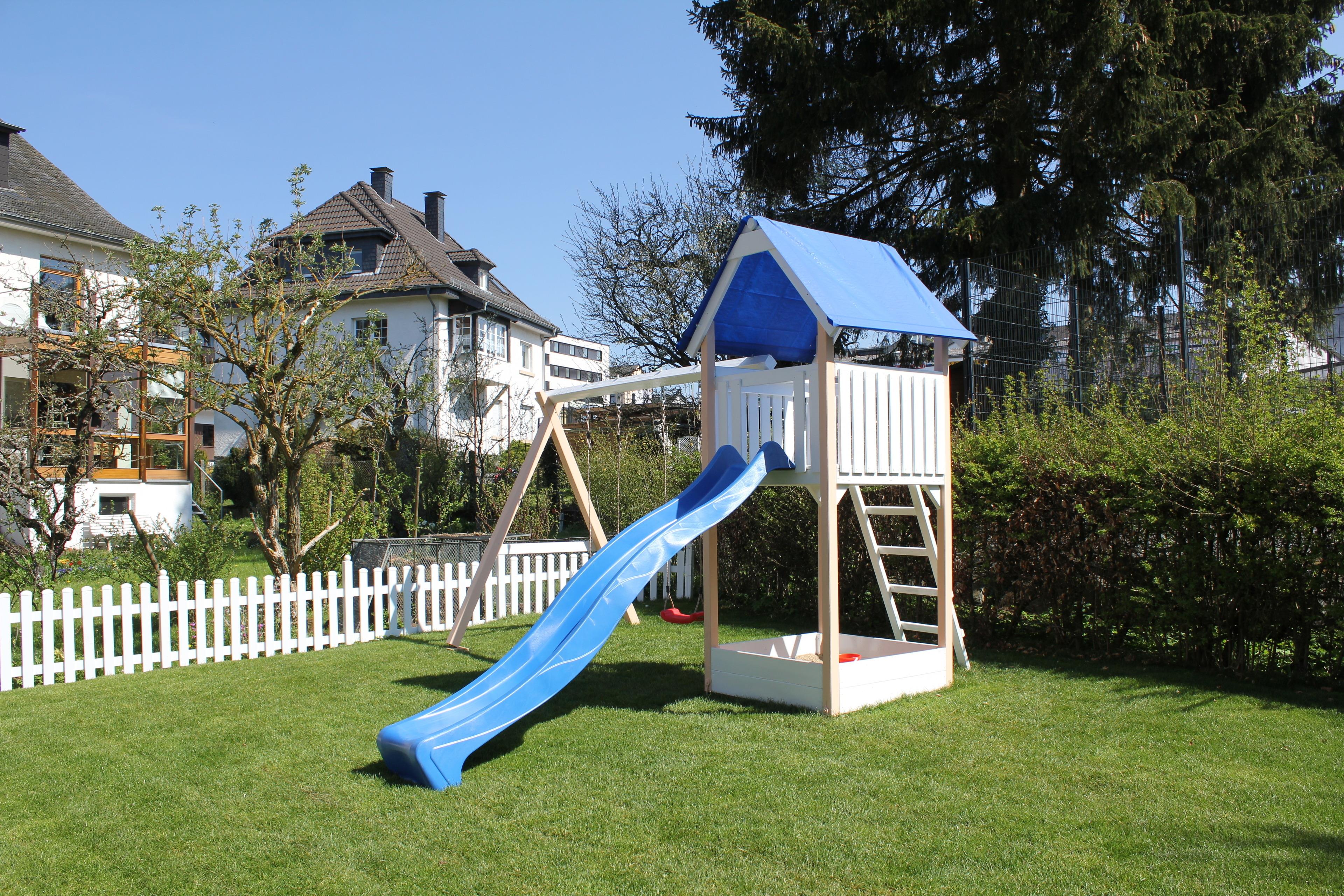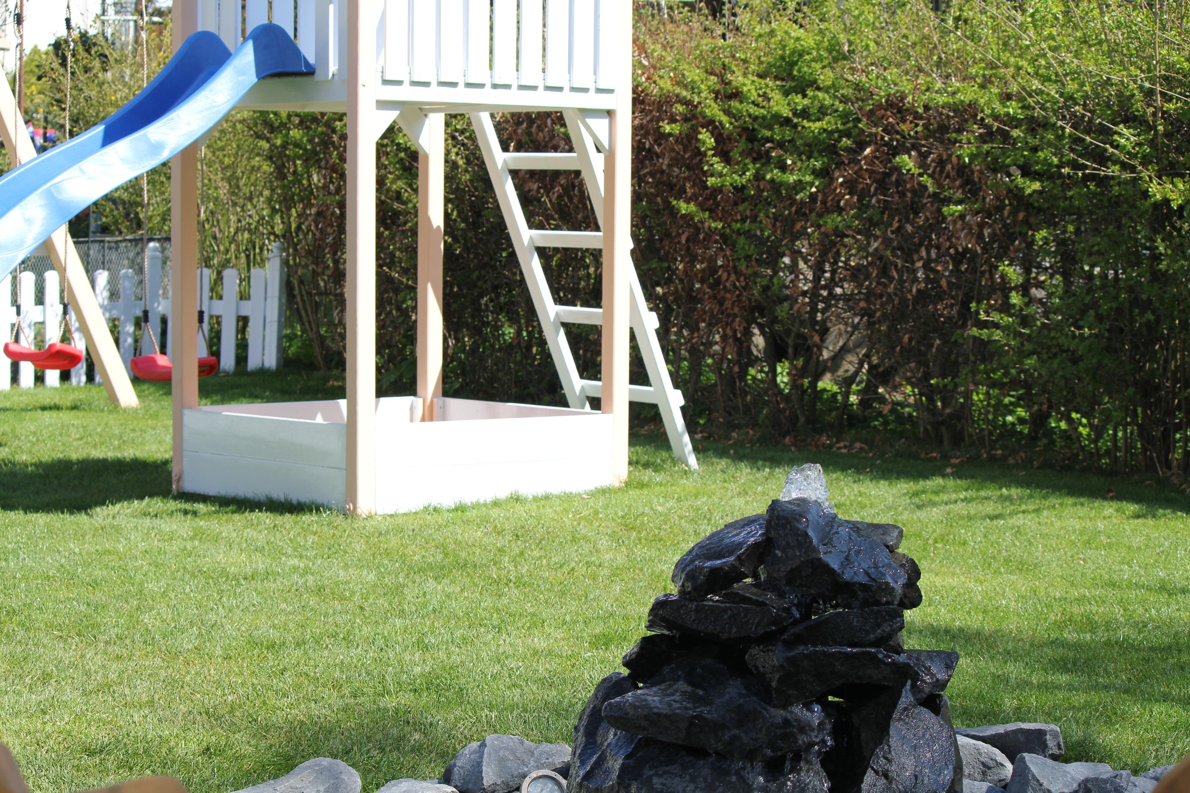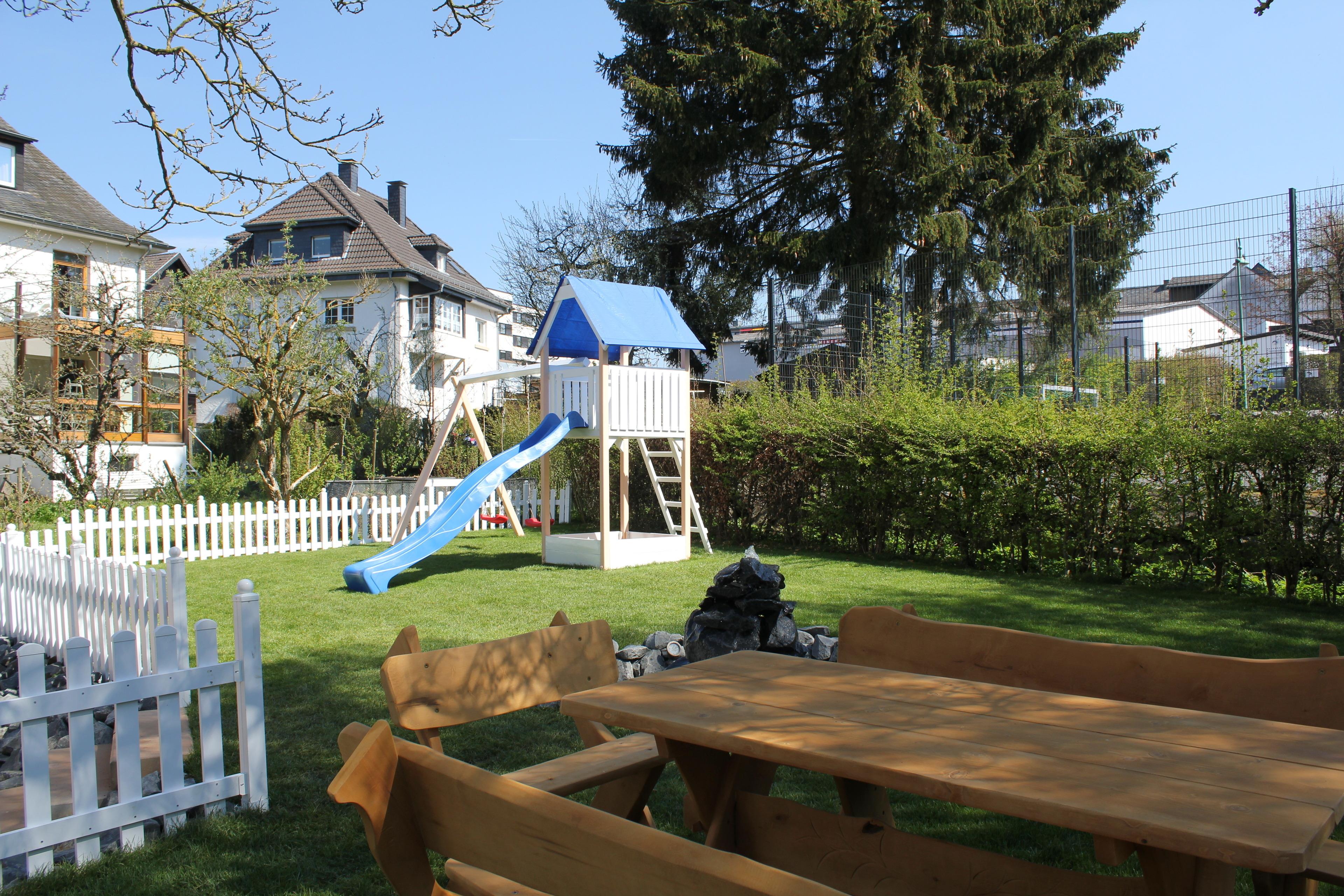 Hinter dem Haus befindet sich eine ruhig gelegene Gartenanlage mit Wiese, Aussensitzgarnitur, Springbrunnen, Grill und Kinderspielturm mit Rutsche, Sandkasten und 2 Schaukeln.
