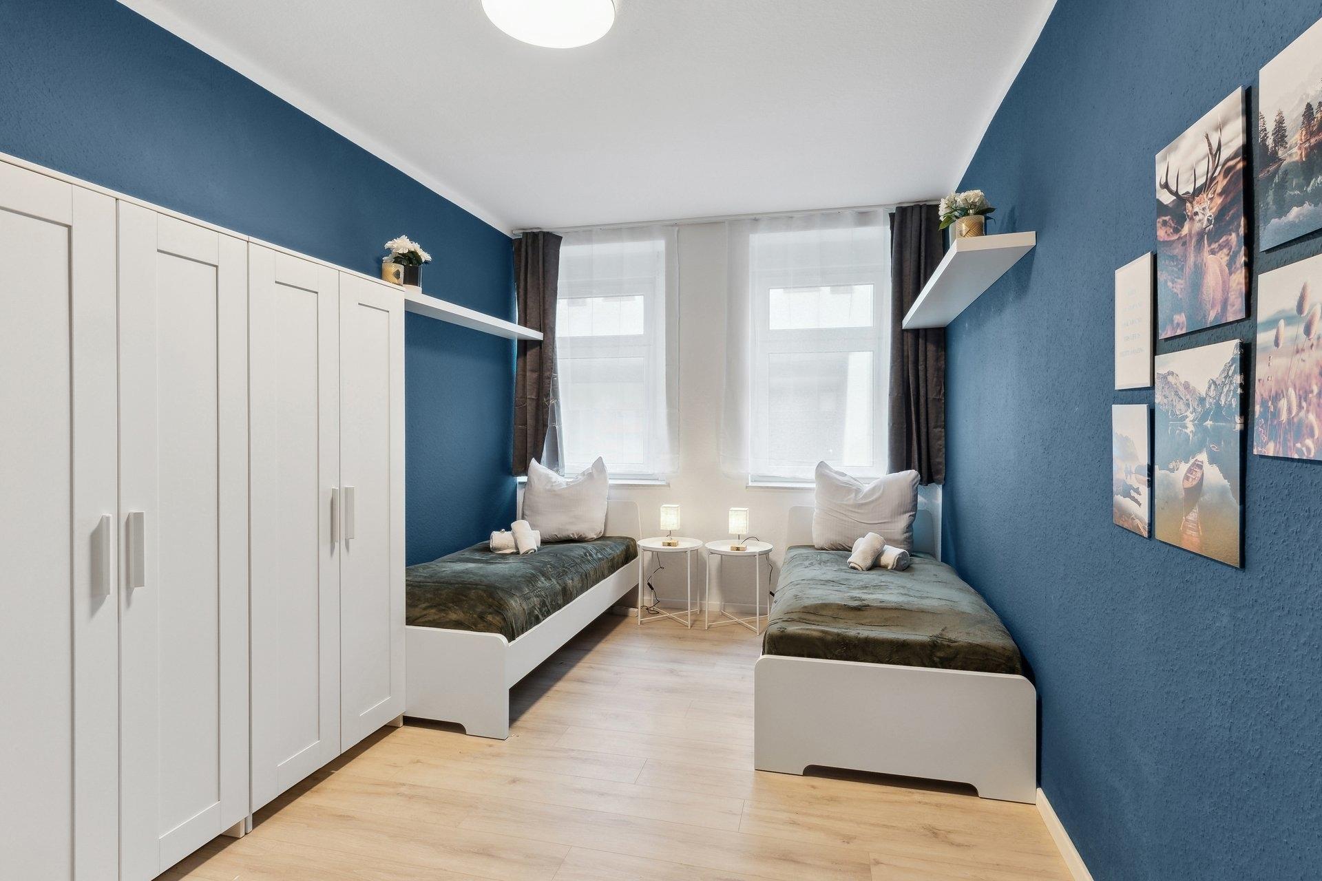 In unserer zentralen großen Wohnung finden bis zu 6 Personen Platz zum Übernachten im schönen Delitzsch. Im Winter warm dank Fußbodenheizung, im Sommer angenehm durch die Lage im Erdgeschoss. Jeder Schlafraum verfügt über zwei Einzelbetten mit EmmaOne Matratzen, viel Stauraum und einen Arbeitsplatz. Für eine gemeinsame schöne Zeit gibt es, neben dem Essbereich in der voll ausgestatteten Küche, eine Sitzecke mit Smart-TV. Im Bad gibt es neben Dusche und Wanne eine Waschmaschine +Waschtrockner.