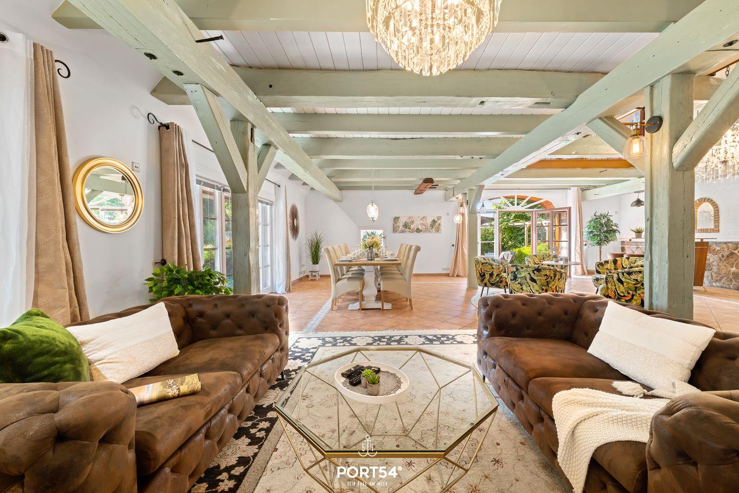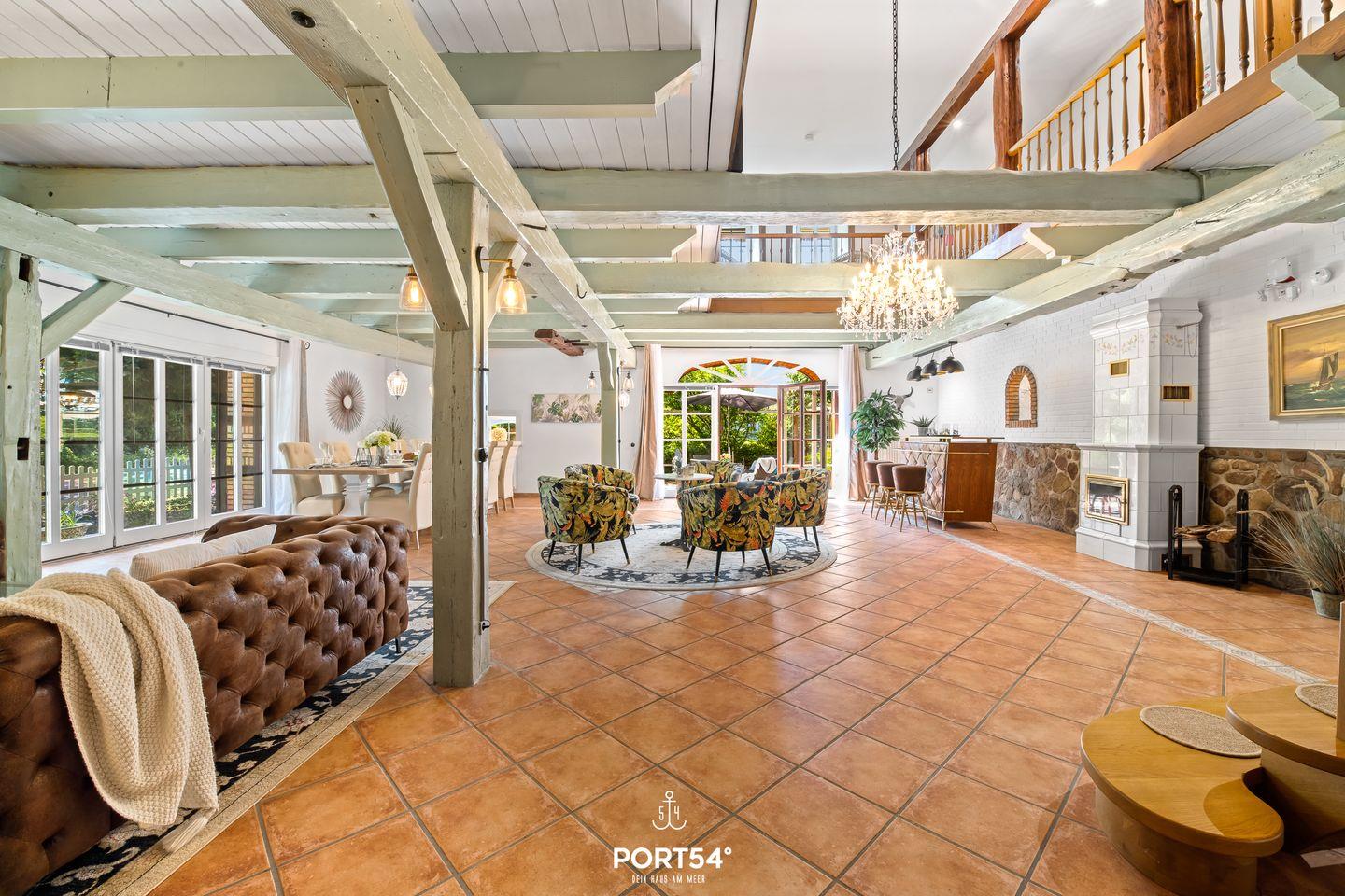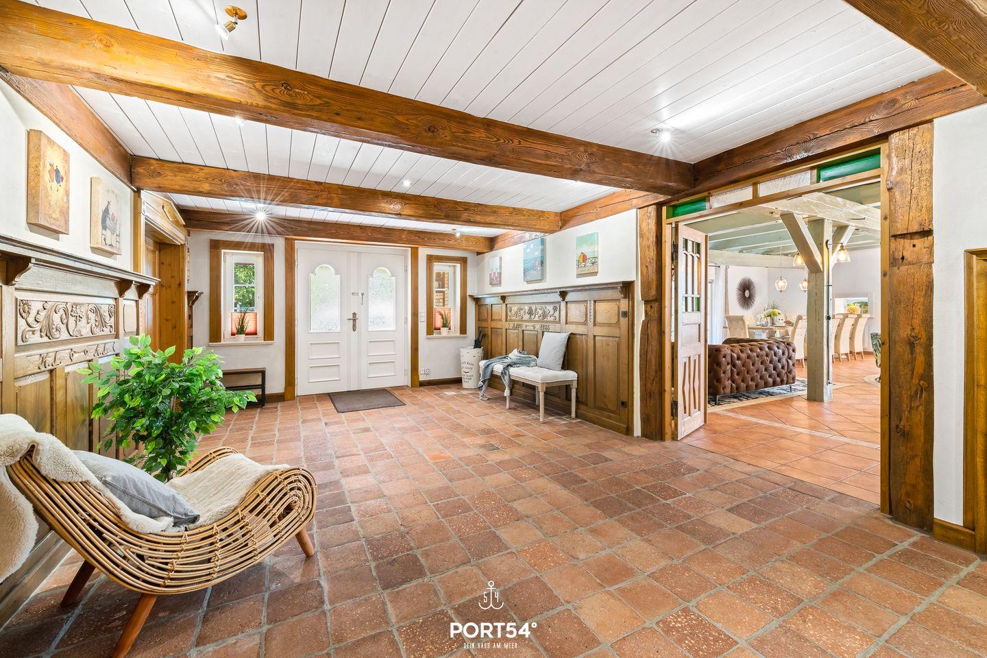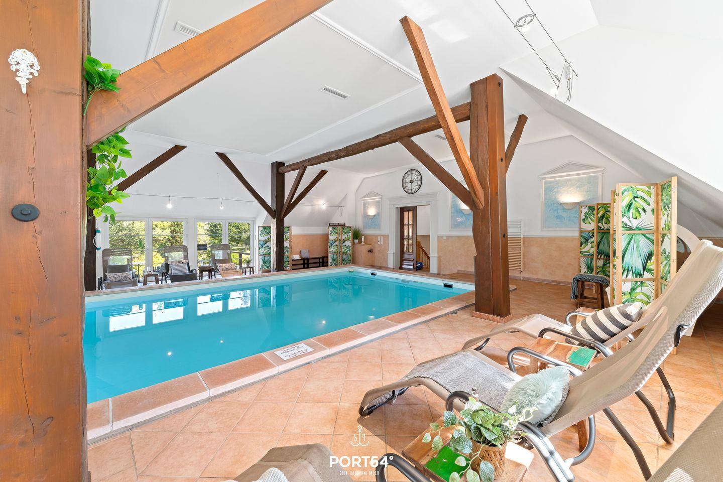 Die Schwimmhalle mit Panoramafenstern im ehemaligen Kuhstall. Über die etwas erhöhte Poolterrasse betreten Sie die 10 x 12 m große und 4 m hohe Schwimmhalle. Vom ehemaligen Stallgebäude zeugen noch die vier mächtigen, verstrebten Stützbalken, ein echtes optisches Highlight. Der Pool ist 9 x 4 m groß und mit einer Gegenstromanlage ausgestattet, hier kann man sich perfekt auspowern. Die Wassertiefe beträgt 1,20 m. Die Schwimmhalle ist mit einer Fußbodenheizung ausgestattet und durch die Panoramafenster können Sie in den Garten schauen und die Wolken am Himmel betrachten. Und wenn Sie frische Luft brauchen.- die Poolterrasse liegt direkt vor Ihnen. Außerdem gibt es in der Schwimmhalle ein WC und eine separate Dusche.