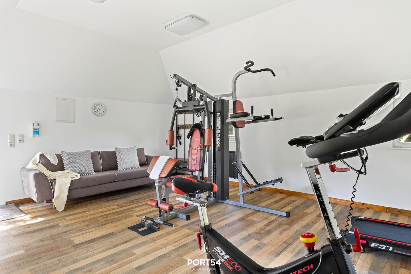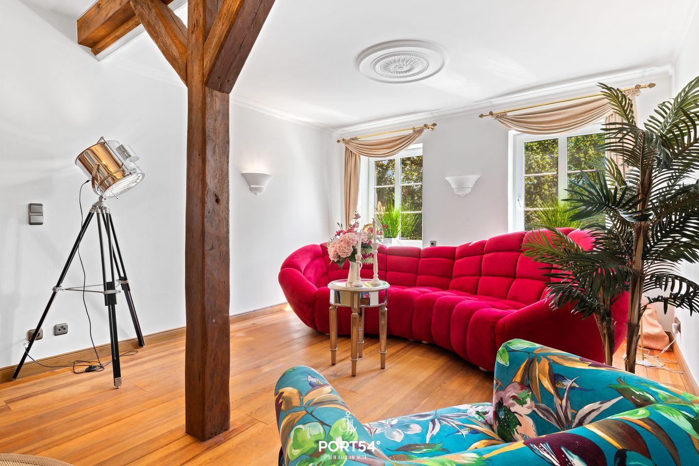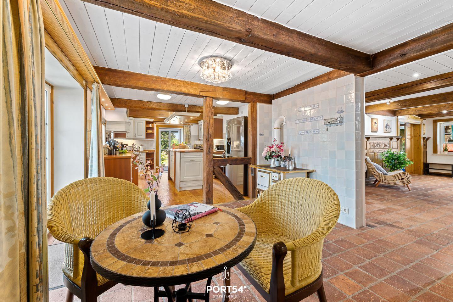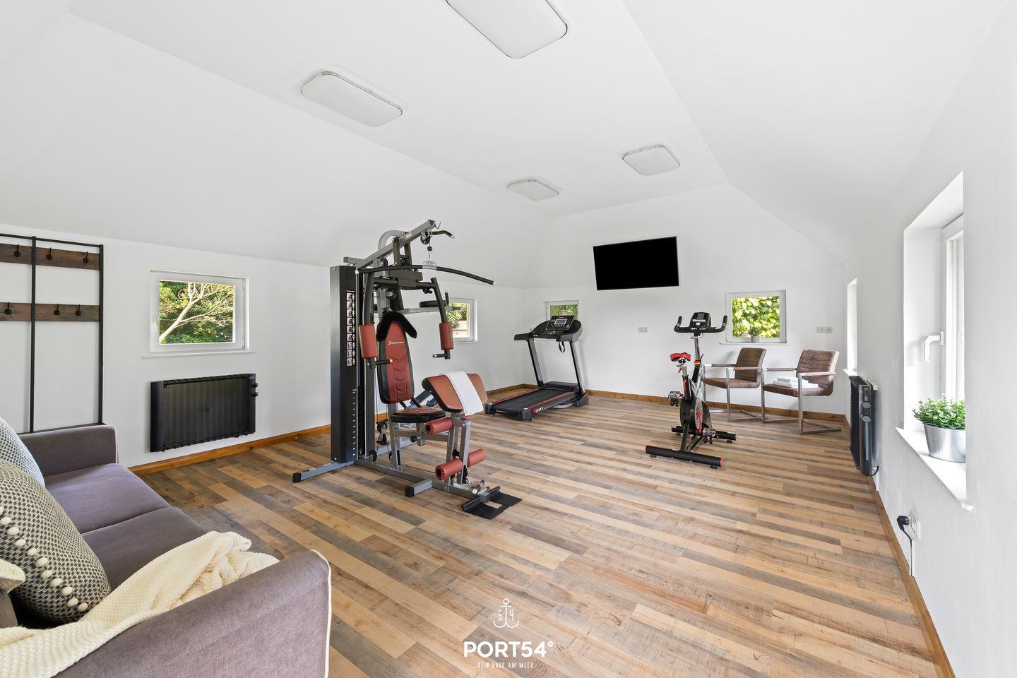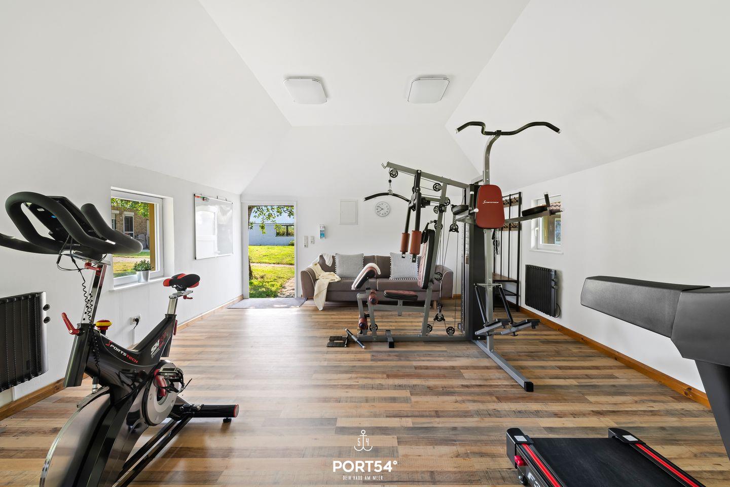 Die Schwimmhalle mit Panoramafenstern im ehemaligen Kuhstall. Über die etwas erhöhte Poolterrasse betreten Sie die 10 x 12 m große und 4 m hohe Schwimmhalle. Vom ehemaligen Stallgebäude zeugen noch die vier mächtigen, verstrebten Stützbalken, ein echtes optisches Highlight. Der Pool ist 9 x 4 m groß und mit einer Gegenstromanlage ausgestattet, hier kann man sich perfekt auspowern. Die Wassertiefe beträgt 1,20 m. Die Schwimmhalle ist mit einer Fußbodenheizung ausgestattet und durch die Panoramafenster können Sie in den Garten schauen und die Wolken am Himmel betrachten. Und wenn Sie frische Luft brauchen.- die Poolterrasse liegt direkt vor Ihnen. Außerdem gibt es in der Schwimmhalle ein WC und eine separate Dusche.