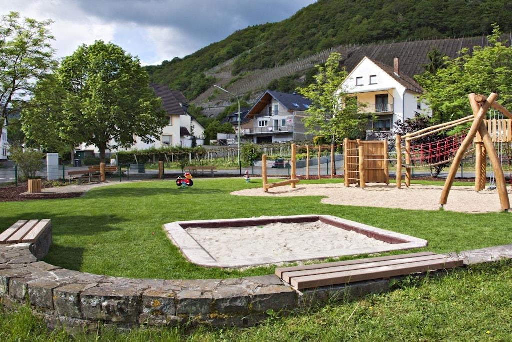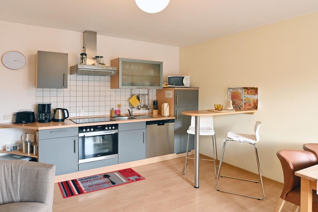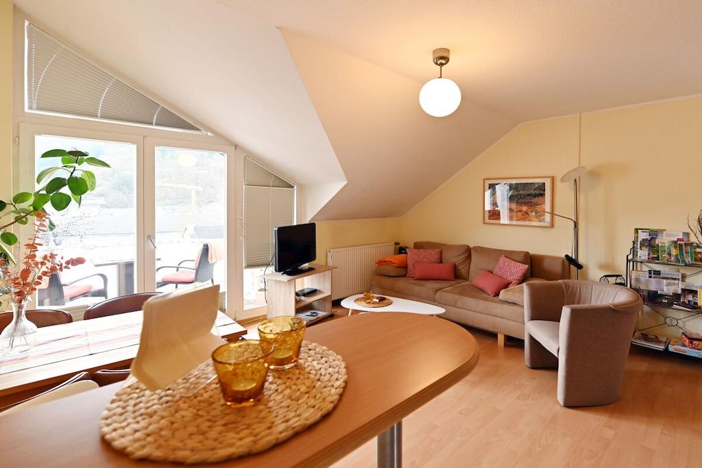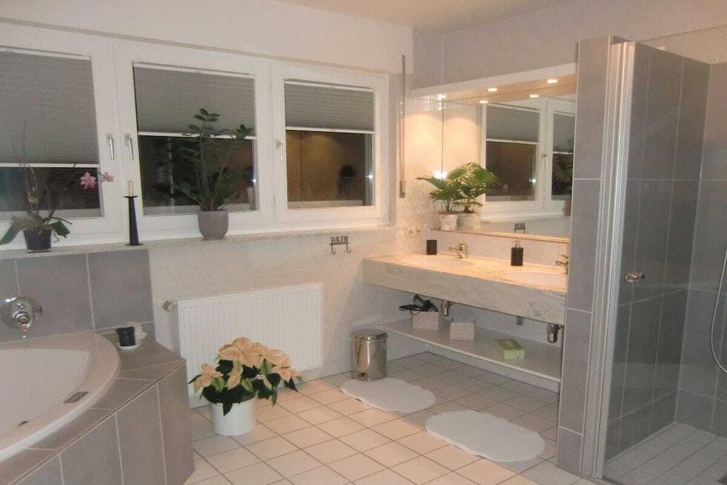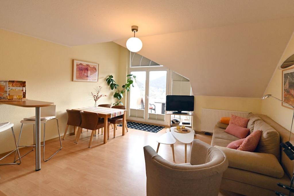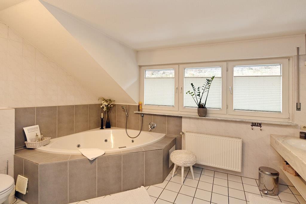 Romantisk wellness-ferielejlighed, lys og indbydende i eksklusive omgivelser, med spabad til to personer i det luksuriøse badeværelse, inviterer dig til at forkæle dig selv og slappe af. Badeværelse (brusepanel med regnbruser, massagedyser, dobbelt håndvask). Køkkenet er udstyret med topmoderne apparater, krydderier, kaffe, te osv. Til afslappende aftener kan du nyde vine fra Meyer-Näkel-vingården (vinkælderpris). Rigelige håndklæder og friskredte senge er inkluderet. Der er også bløde badekåber (babyseng og højstol). Drømmeagtig udsigt over Dernau. Näkel-ferievillaen i Dernau ligger i Pfarrwingert-vingården og består af tre lejligheder: Sonnenberg (45 kvm), Pfarrwingert (75 kvm) og Hardtberg (55 kvm) (maks. 14 personer).