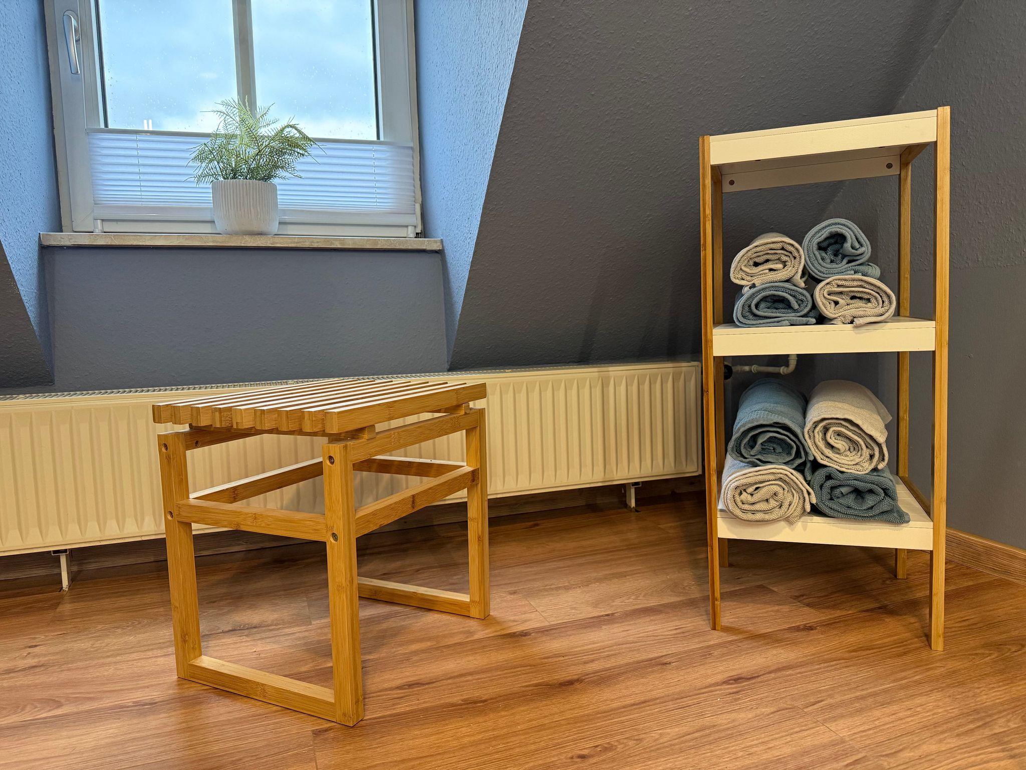 Die Ferienwohnung befindet sich im Dachgeschoss in der 3. Etage und ist über ein Treppenhaus ohne Fahrstuhl erreichbar. Zum Teil gibt es schräge Wände. Im nach Norden und zur Straße zeigenden Wohnzimmer befindet sich die Küchenzeile, ein Esstisch und der Wohnbereich mit Eckcouch und TV sowie ein Schrankbett (1,60 x 2 m).