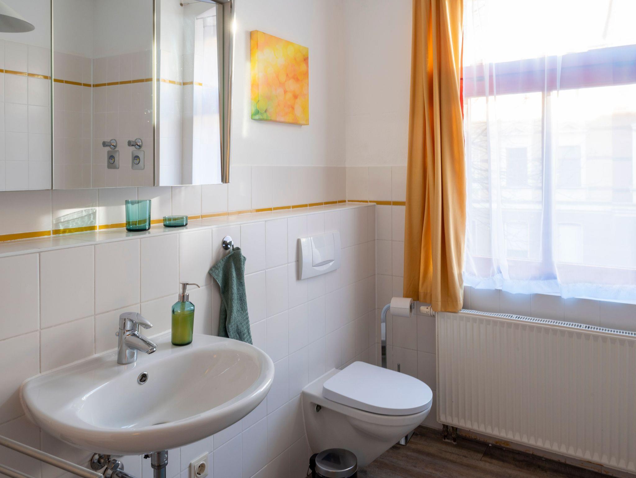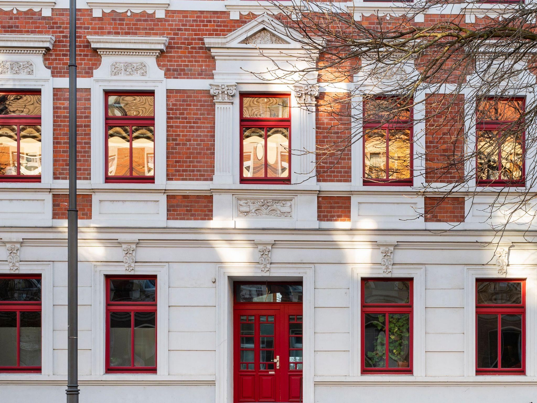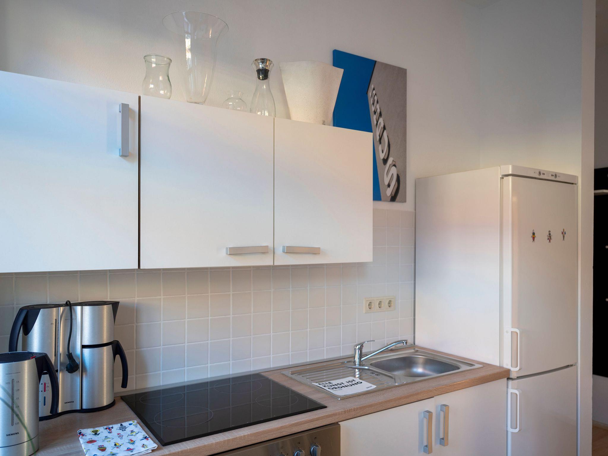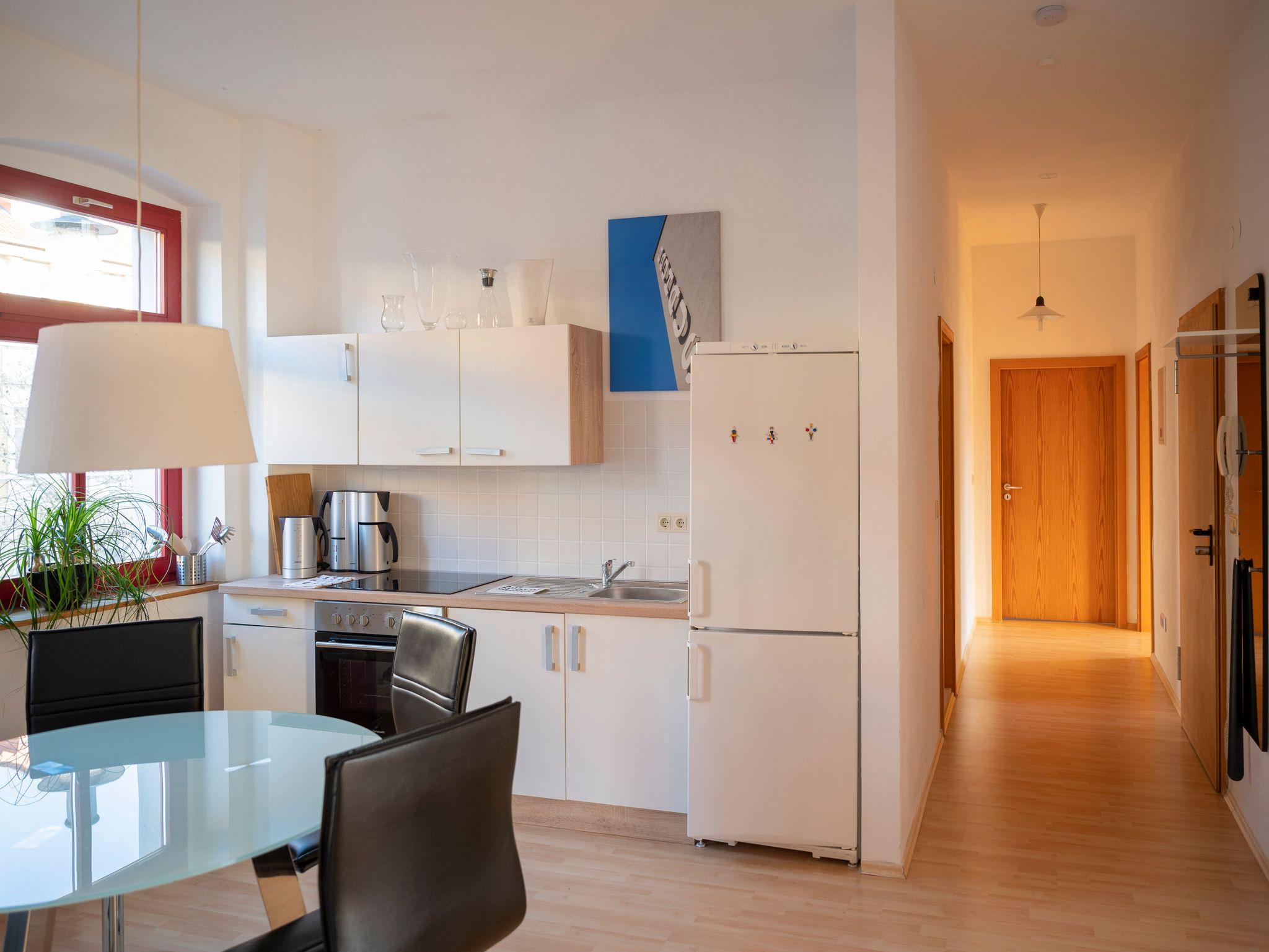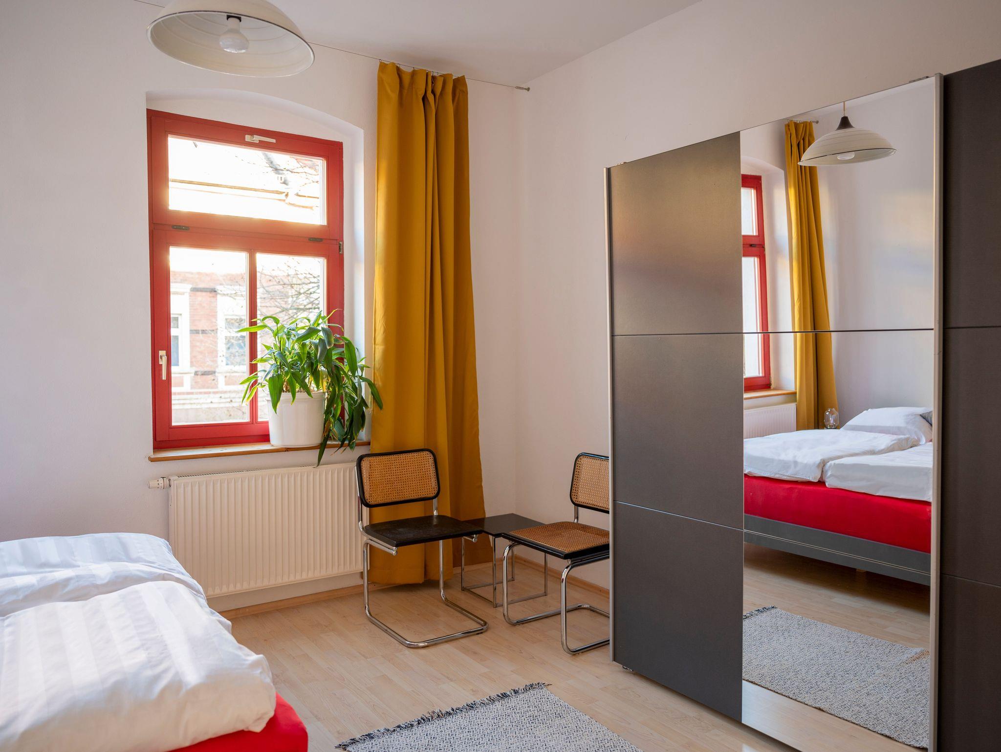 Die geräumige Ferienwohnung im Gründerzeitviertel umfasst mit zwei Schlafzimmern, Wohnzimmer und Küche mit Essbereich das gesamte 1. Obergeschoss. Das Wohnzimmer ist auch als drittes Schlafzimmer buchbar. Die Küche ist mit Herd, Backofen, Kühlschrank mit Gefrierteil, Wasserkocher und KaffeemaschineHerd, Backofen, Kühlschrank mit Gefrierteil, Wasserkocher und Kaffeemaschine ausgestattet.