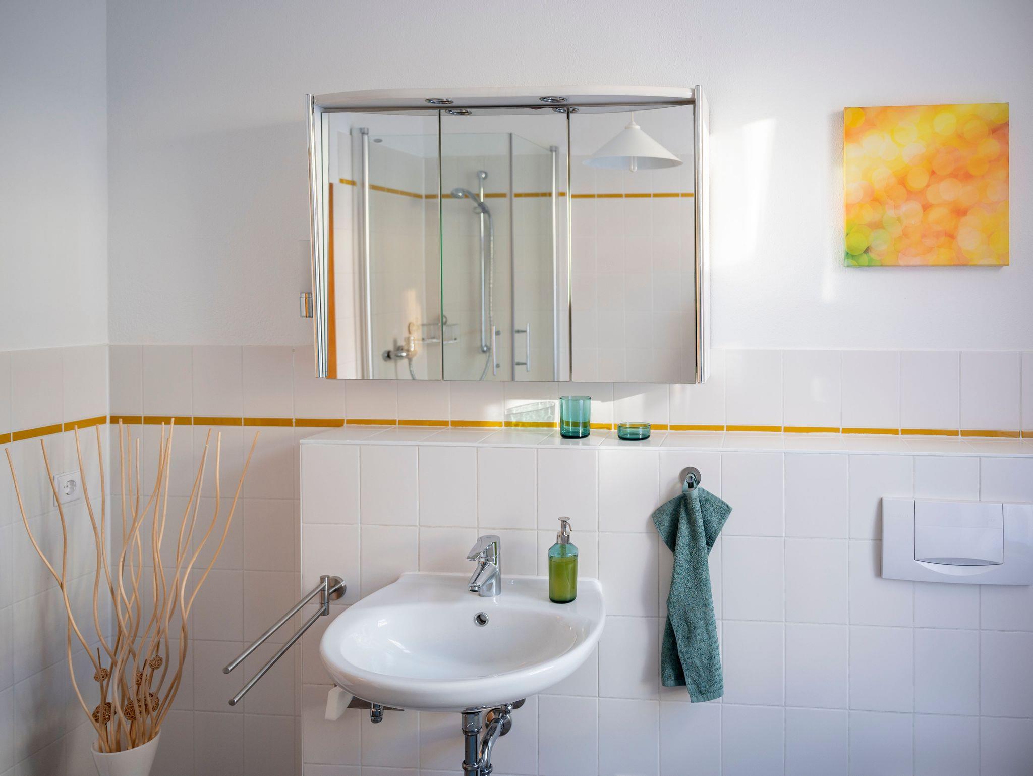 Die Ferienwohnung umfasst das gesamte 1. Obergeschoss. Durch die Eingangstür wird ein kleiner Flur betreten, der offen in den Essbereich für bis zu sechs Personen führt. Hier ist auch die Küchenzeile mit Herd, Backofen, Kühlschrank mit Gefrierteil, Wasserkocher und Kaffeemaschine zu finden. Vom Esszimmer aus ist das Wohnzimmer zu erreichen, welches auch als Doppelzimmer nutzbar ist. Hier steht eine kleine Literaturauswahl und der Flachbild-TV zur Unterhaltung zur Verfügung, eine Auswahl an Spielen ist im Esszimmer zu finden. Über den Flur sind die zwei Schlafräume und das Bad zu erreichen. Ein Schlafzimmer ist mit Doppelbett und Spiegelschrank ausgestattet., das zweite Schlafzimmer hat zwei Einzelbetten einen Schrank und einen Schaukelstuhl. Alle Betten haben extradicke und sehr bequeme Matratzen. Im Bad finden Sie eine Badewanne mit Duschmöglichkeit und eine separate Duschkabine, ein Waschbecken und ein WC. Das W-LAN ist in der gesamten Ferienwohnung nutzbar.