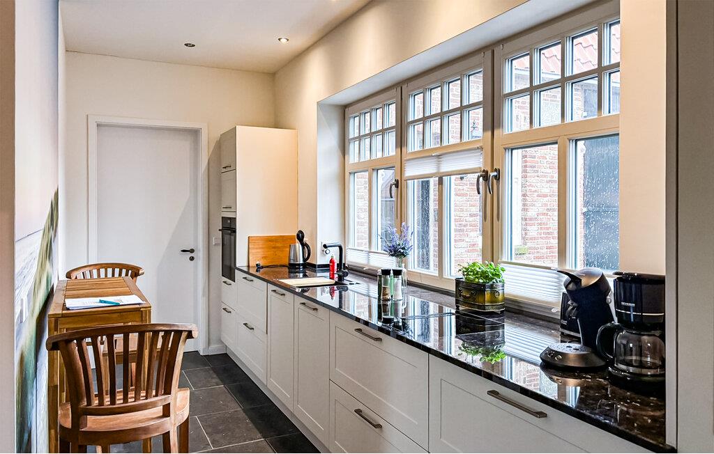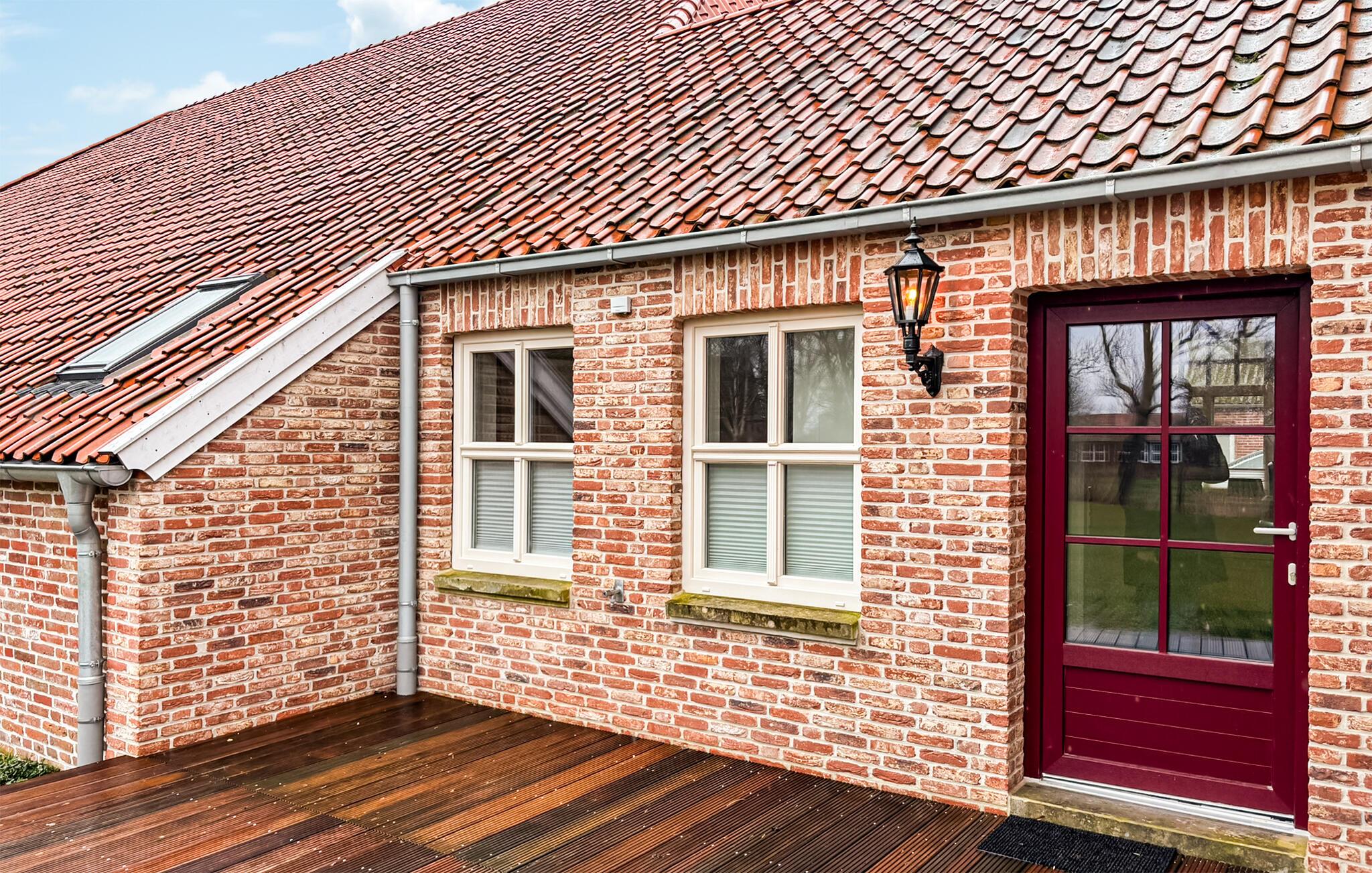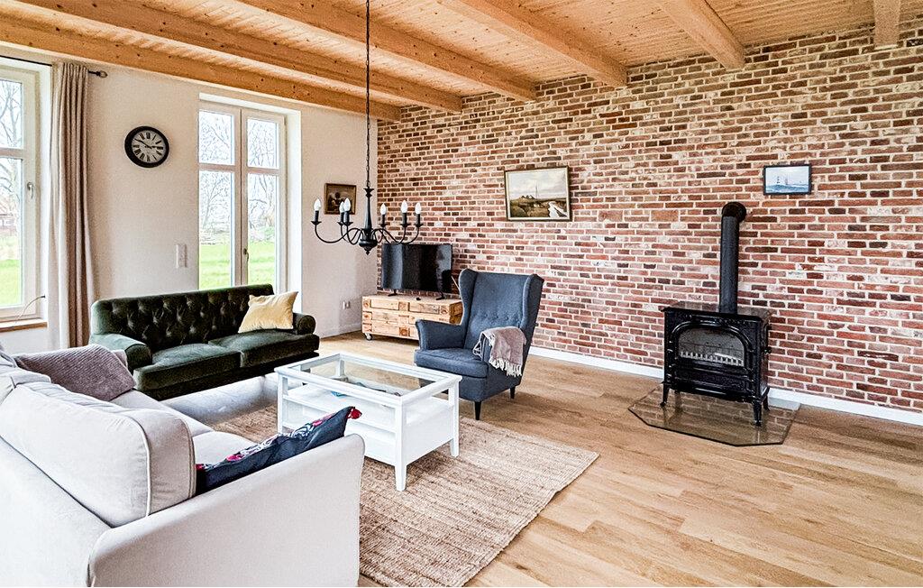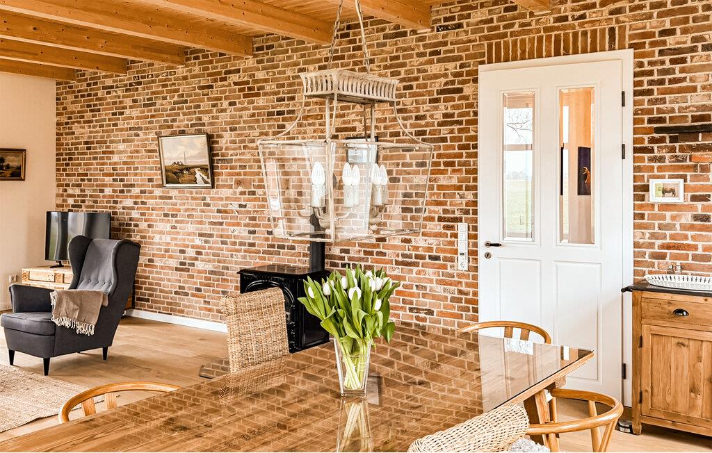 Nyd den åbne stue med synlige træbjælker og varme murstensvægge. Store vinduer lukker masser af naturligt lys ind og skaber en indbydende atmosfære. Sæt jer til rette i de komfortable sofaer eller læs i lænestolen ved siden af ??brændeovnen. Tilbered måltider i det moderne køkken med rigelig bordplads, og find sammen derefter omkring det massive træbord. Tag jer tid til jer selv og nyd jeres fritid fuldt ud.