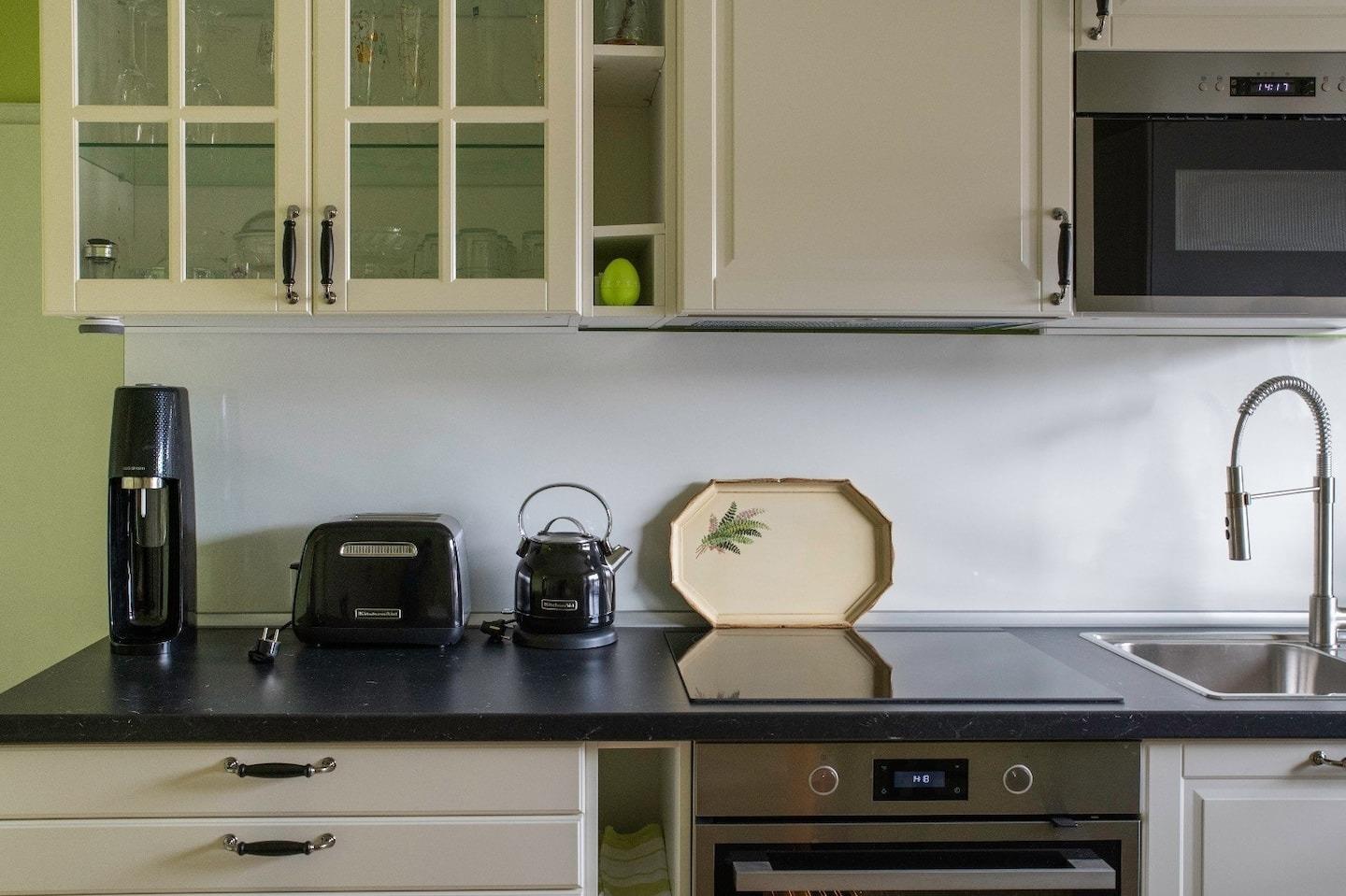 Kaffeemaschine, Toaster, Wasserkocher, Mikrowelle, Umluftofen, Herd, Kühlschrank mit kleinem Gefrierfach, Geschirrspüler
