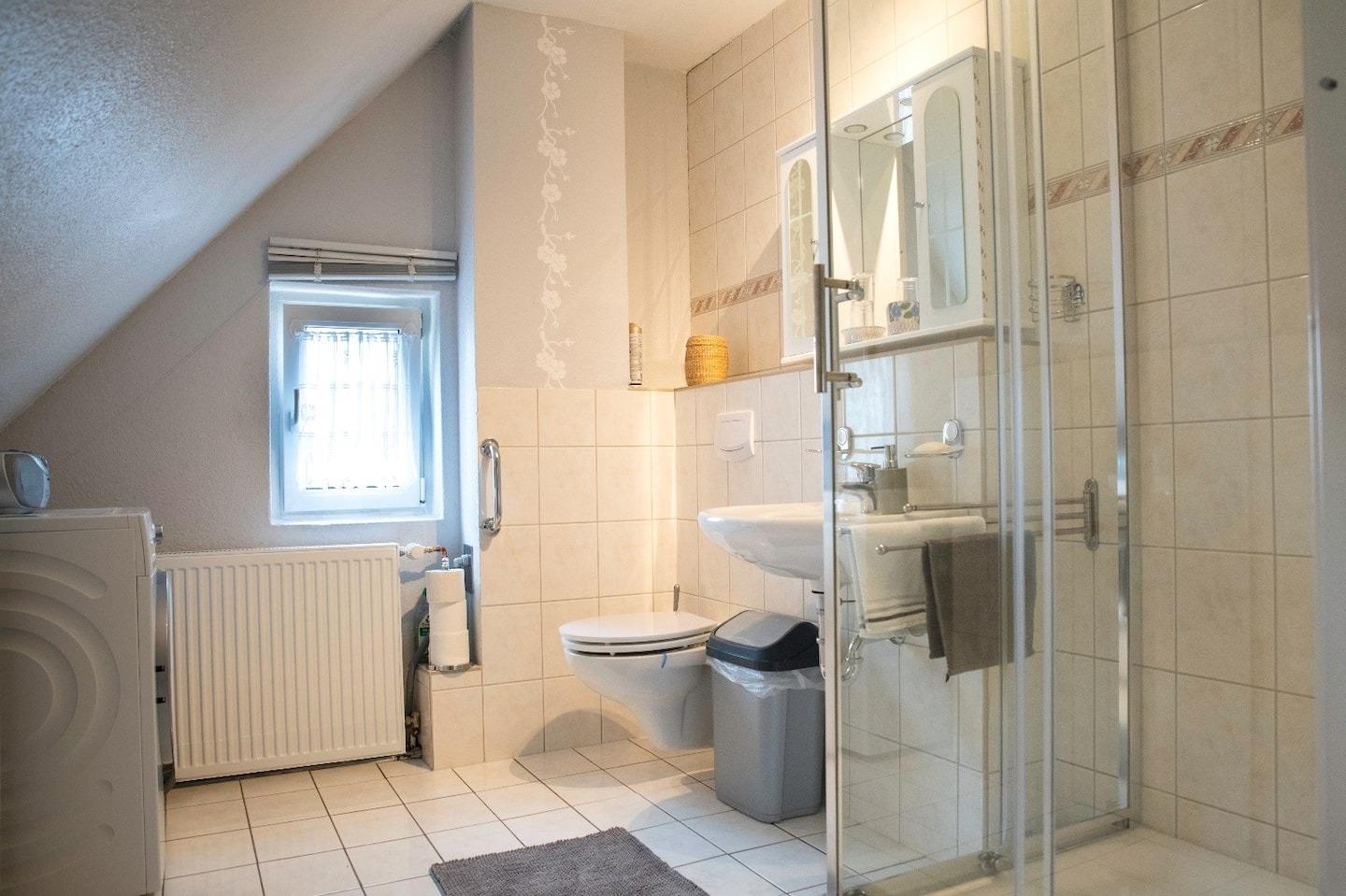 Im Badezimmer ist eine Waschmaschine, die zusätzlich gebucht werden muss (bitte nicht nach 22:00 verwenden), ein WC, Waschbecken und eine Duschkabine sowie Handtuchhalter. Ein kleines Fenster im Badezimmer ist mit einem Rollo versehen. Dort befindet sich auch ein Handtuchtrockner, der bei Bedarf eingeschaltet werden kann.