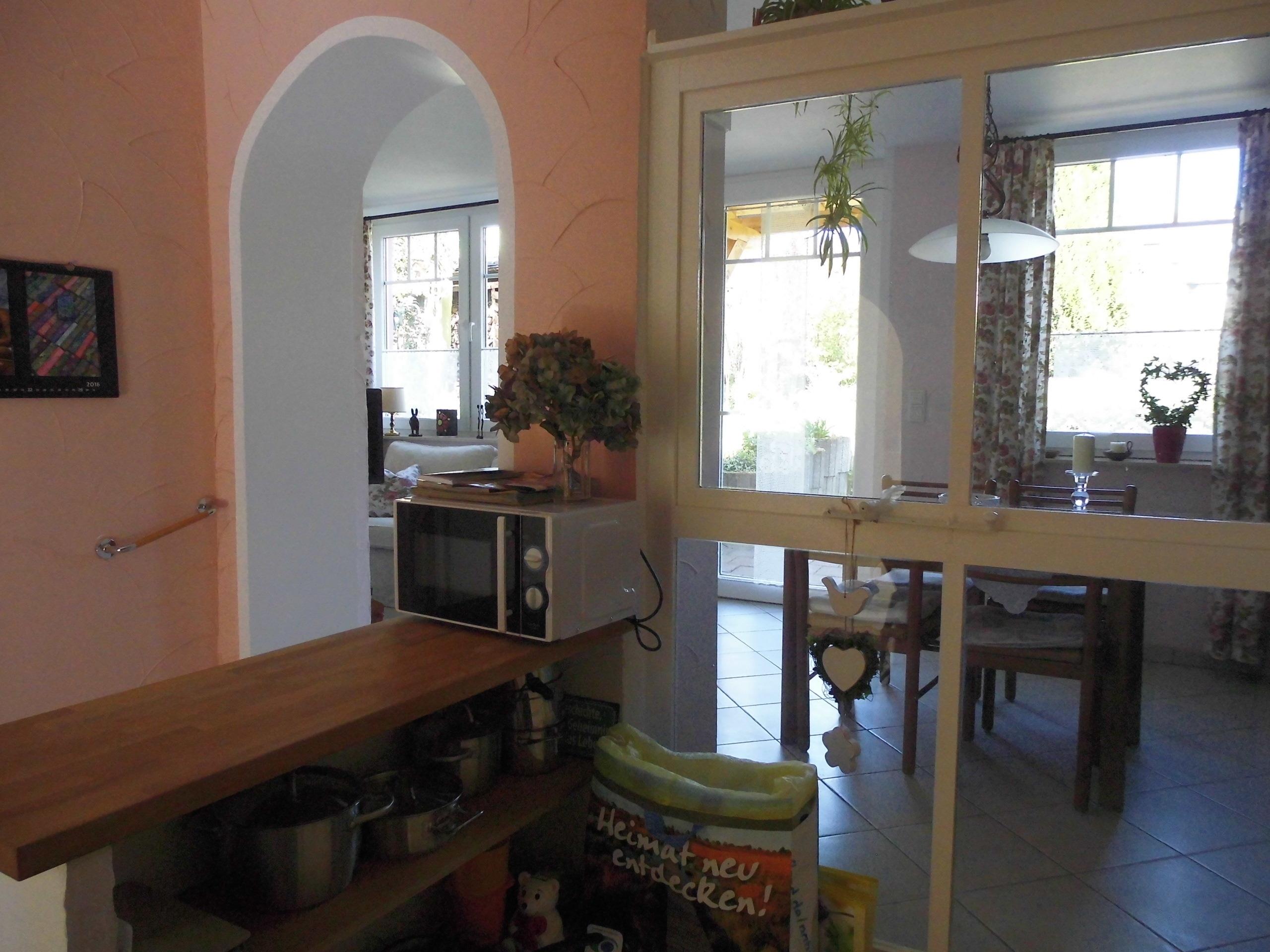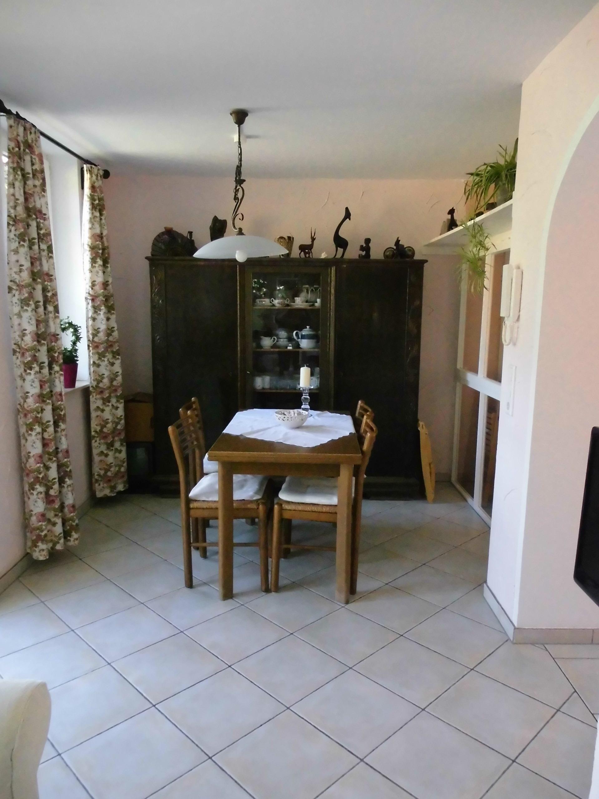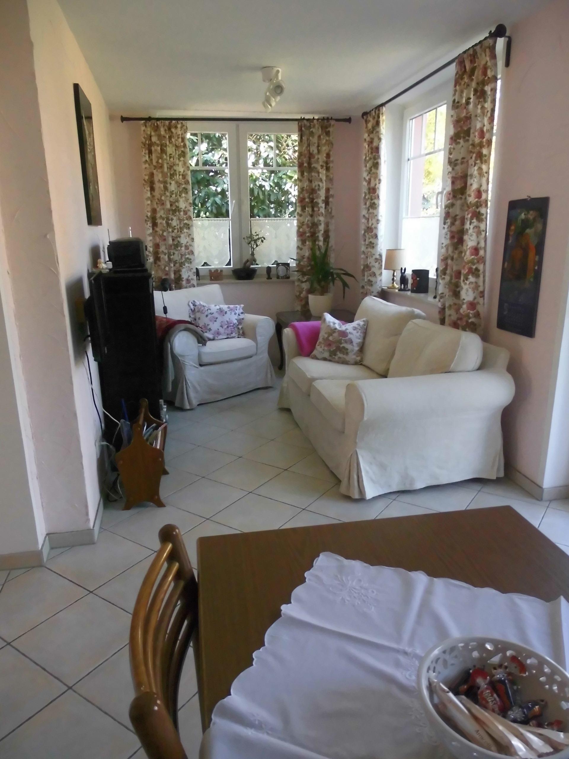 Zurück in der Küche führen zwei Stufen in den Wohn- und Essbereich. Hier ist ein ausziehbarer Tisch mit vier Stühlen, ein Wohnzimmerschrank mit weiterem Geschirr und auch Spielen sowie ein Fernseher, ein 2er Sofa, ein Sessel und ein Bücherregal. Im Wohnzimmer ist auch die Tür die in den Außenbereich führt. Dort steht ein Holztisch mit 5 Stühlen den Sie auch nutzen können. Natürlich gehen wir davon aus, dass Sie Rücksicht nehmen auf die Nachbarn und auf Ihre Lautstärke achten.