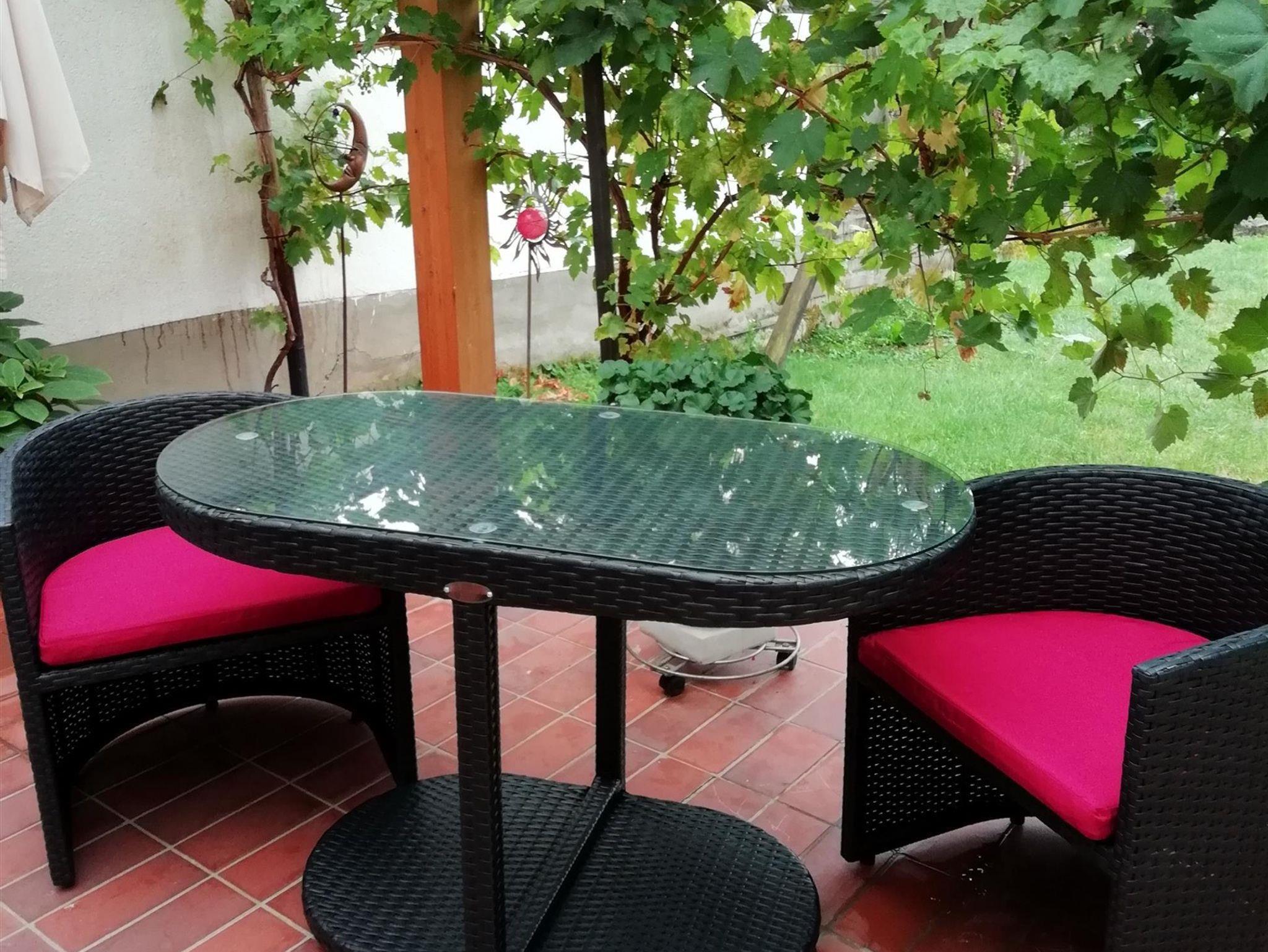 Zu unserem Haus zählen eine große überdachte Terrasse, die zum geselligen Beisammensein einlädt. Ihnen stehen Wiese, Grillplatz sowie hauseigene Parkplätze zur Verfügung.