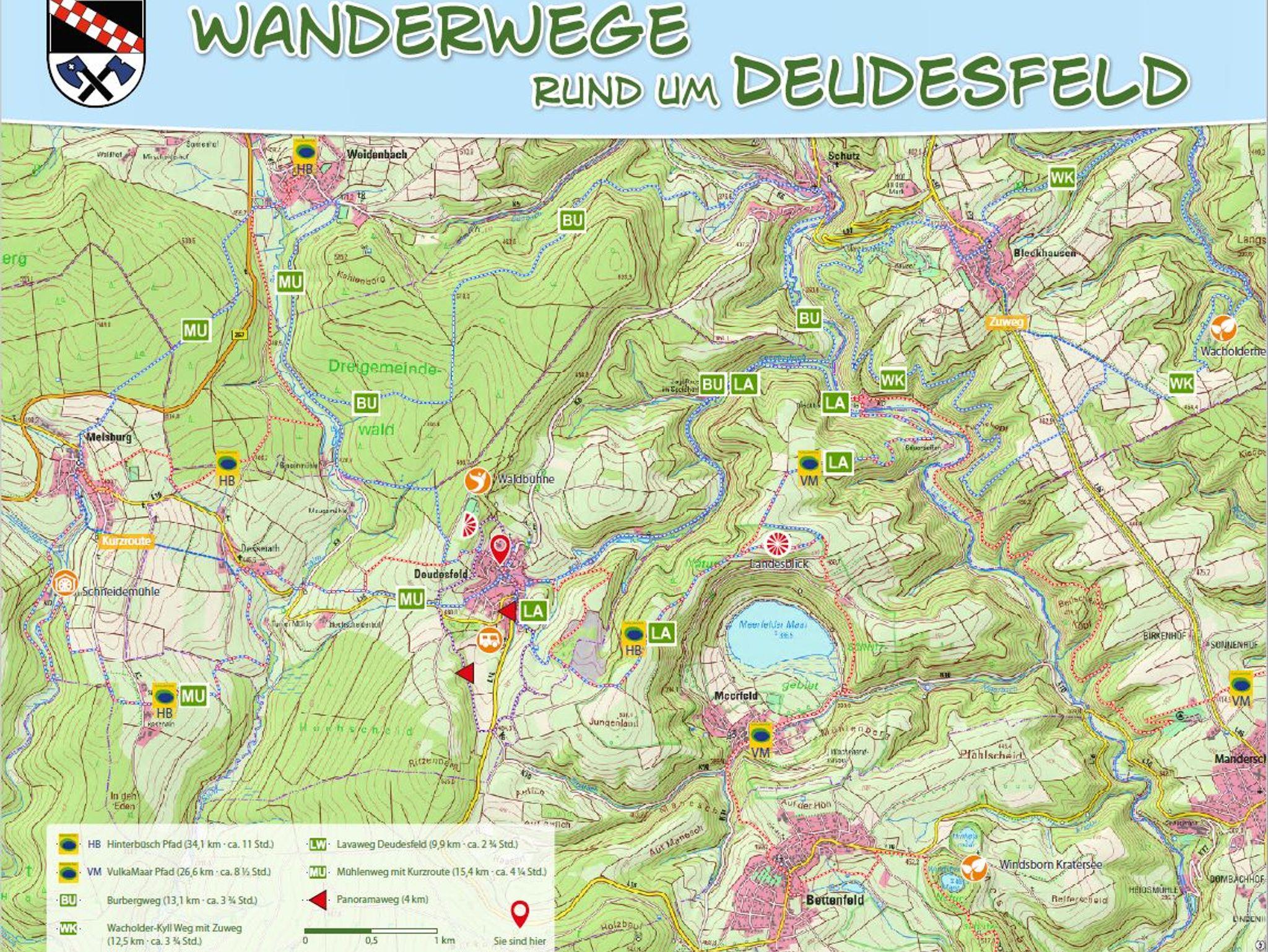 Unser inhabergeführtes Ferienhaus liegt im Ortskern von Deudesfeld, einem kleinen Ort im Herzen der Vulkaneifel. Reizende Wanderwege laden zu kleinen und großen Wanderungen ein. Die direkte Lage am Vulkanbike-Trailpark macht es zu einem perfekten Ausgangspunkt für Mountainbiker. In unmittelbarer Nähe zu unserem Ferienhaus gibt es einen kleinen Gemischtwarenladen sowie einen Metzger der Regionalmarke Eifel. Auf Vorbestellung gibt es dort auch frische Brötchen. Ein Restaurant mit großem Biergarten in der direkten Nähe bietet Ihnen eine gut bürgerliche Küche. In unmittelbarer Nähe zum Ort Deudesfeld gibt es eine große Anzahl von Sehenswürdigkeiten.