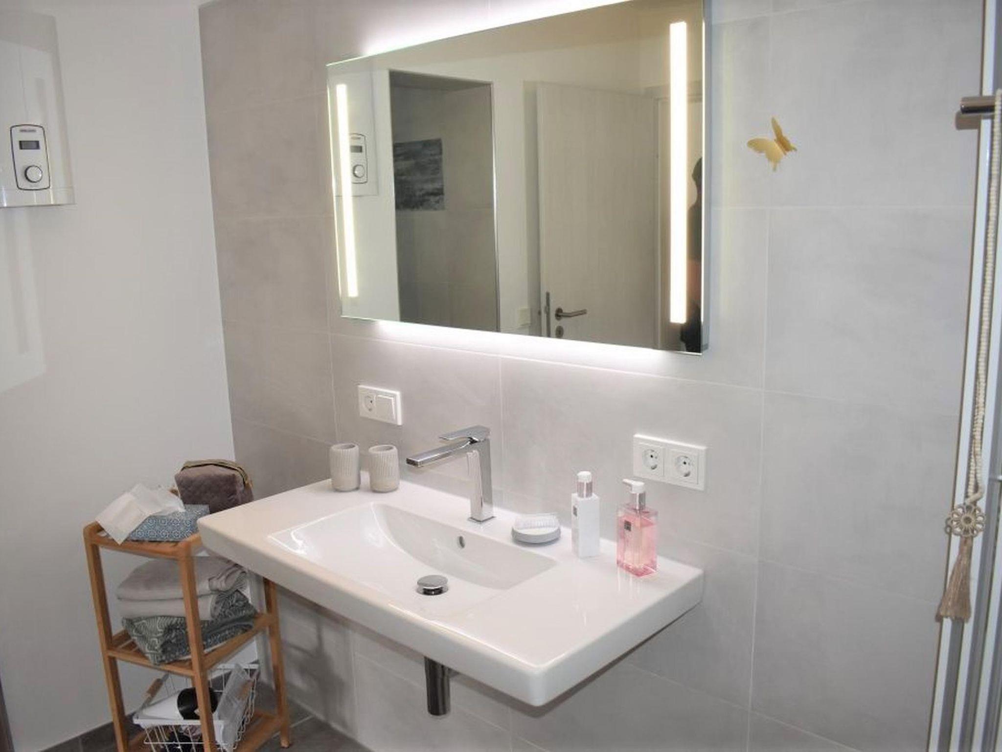 Im Erdgeschoss befindet sich das geräumige Bad mit ebenerdig begehbarer Rainshower-Dusche sowie einem räumlich getrennten Gäste-WC. Außerdem finden Sie dort das erste Schlafzimmer mit Doppelbett, einer gemütlichen Schlafcouch und einen Haushaltsraum mit Waschmaschine und Trockner.