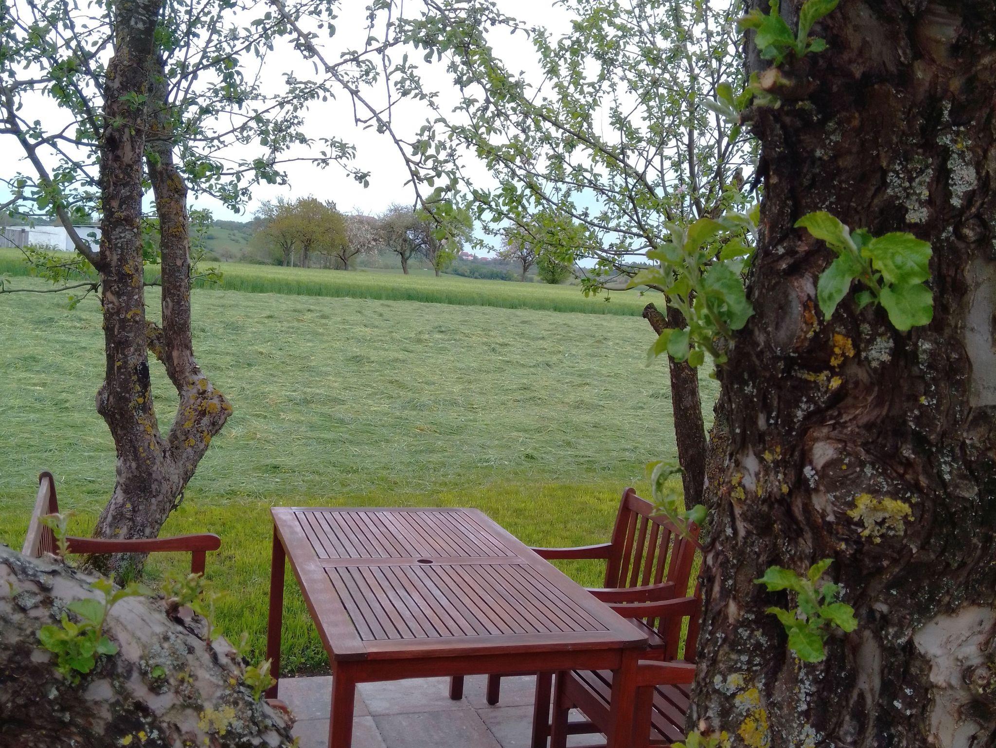 Unter schattigen Bäumen gibt es eine zweite Sitzmöglichkeit mit einer genialen Aussicht.