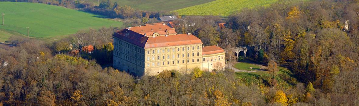 Der rund 10 m² große Balkon bietet einen atemberaubenden Ausblick auf das nächtlich beleuchtete Barockschloss der Fürsten zu Hohenlohe Schillingsfürst.