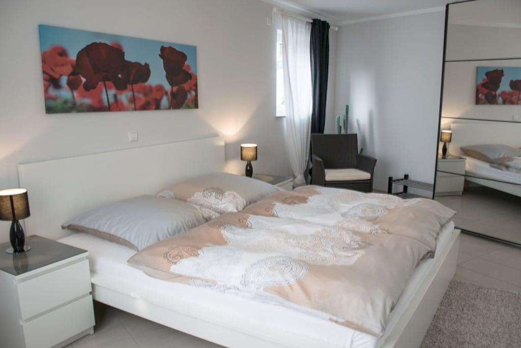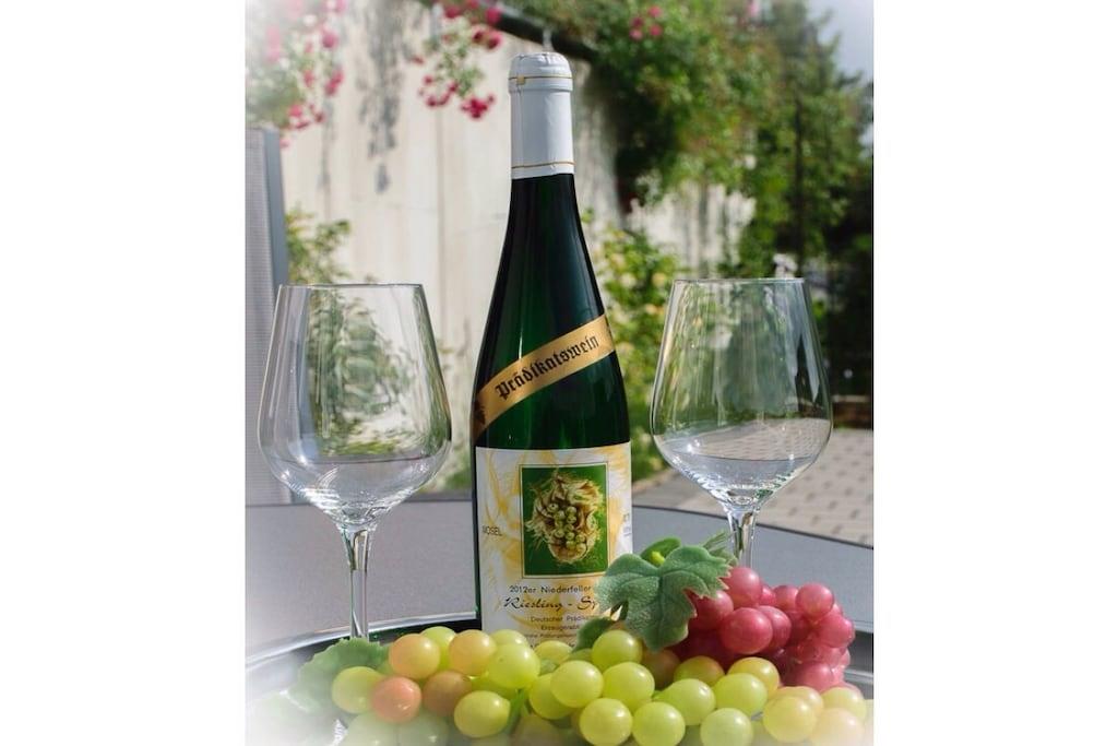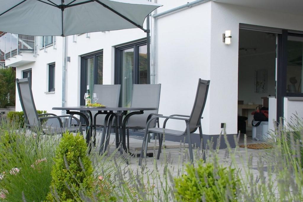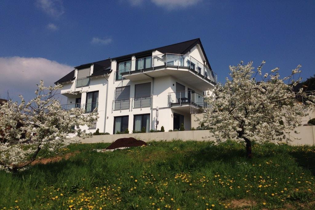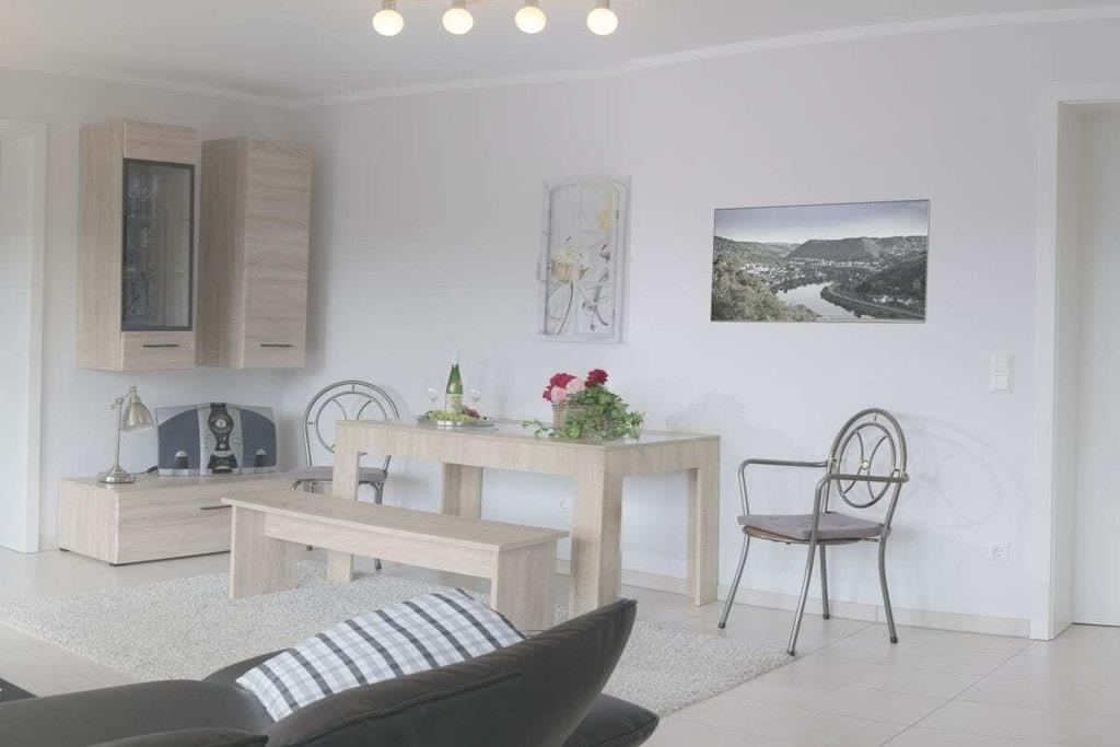 For en afslappende ferie tilbyder vi vores komfortabelt og moderne møblerede ferielejlighed (75 kvm) med en stor solterrasse til 2-4 personer. Lejligheden har en åben stue/spisestue, to soveværelser, hver med en dobbeltseng (180x200 cm og 160x200 cm), en entré og et badeværelse med bruseniche og badekar. Feriehuset ligger i en rolig og idyllisk beliggenhed i udkanten af landsbyen med uhindret udsigt fra terrassen over Mosel-floden, dens vinmarker og slottet. For at sikre, at du kan sove længe, er alle vinduer udstyret med elektriske skodder. Der er også en gratis parkeringsplads med direkte adgang til lejligheden. Et vaskerum med vaskemaskiner og tørretumblere er placeret i kælderen.