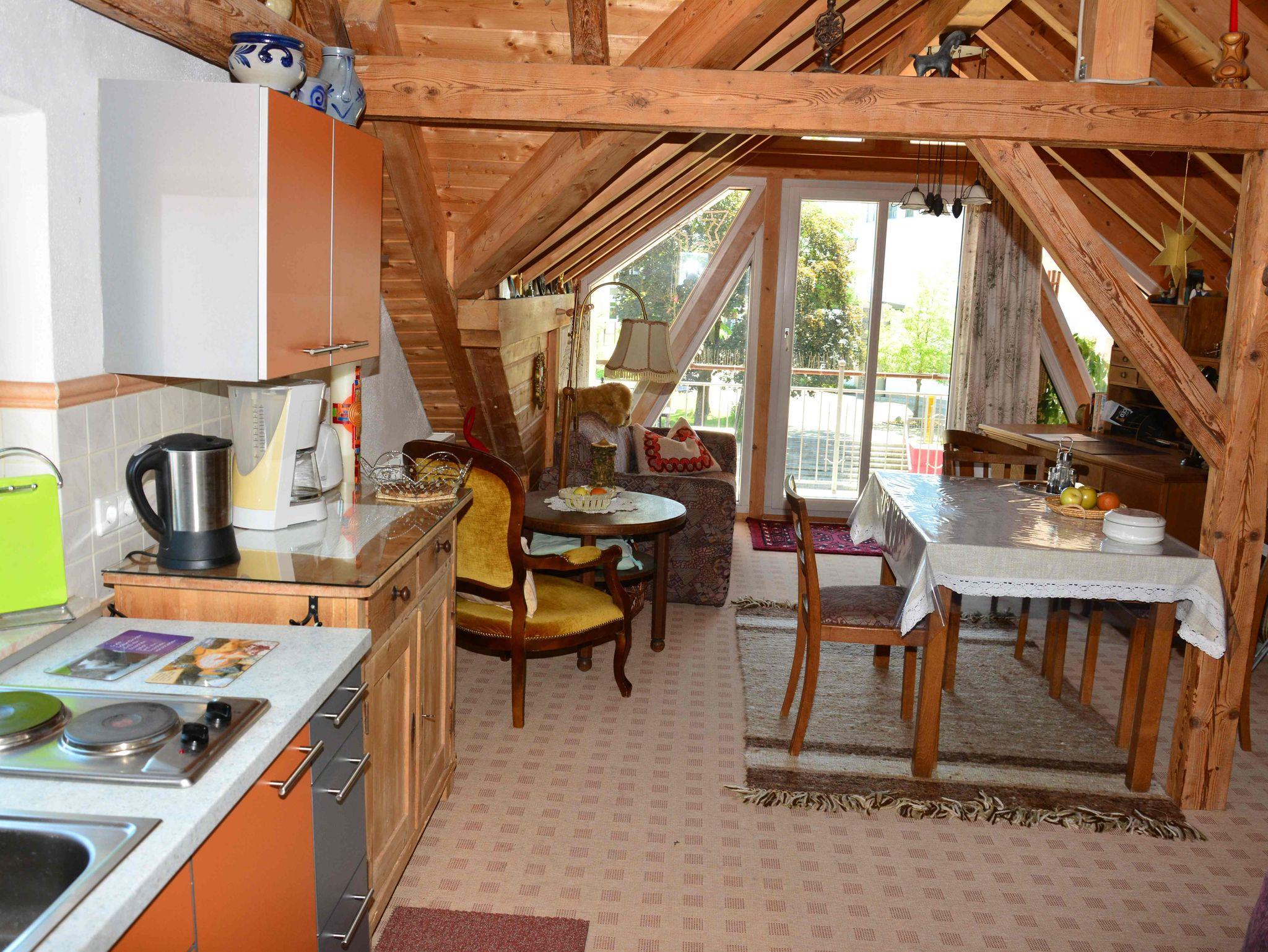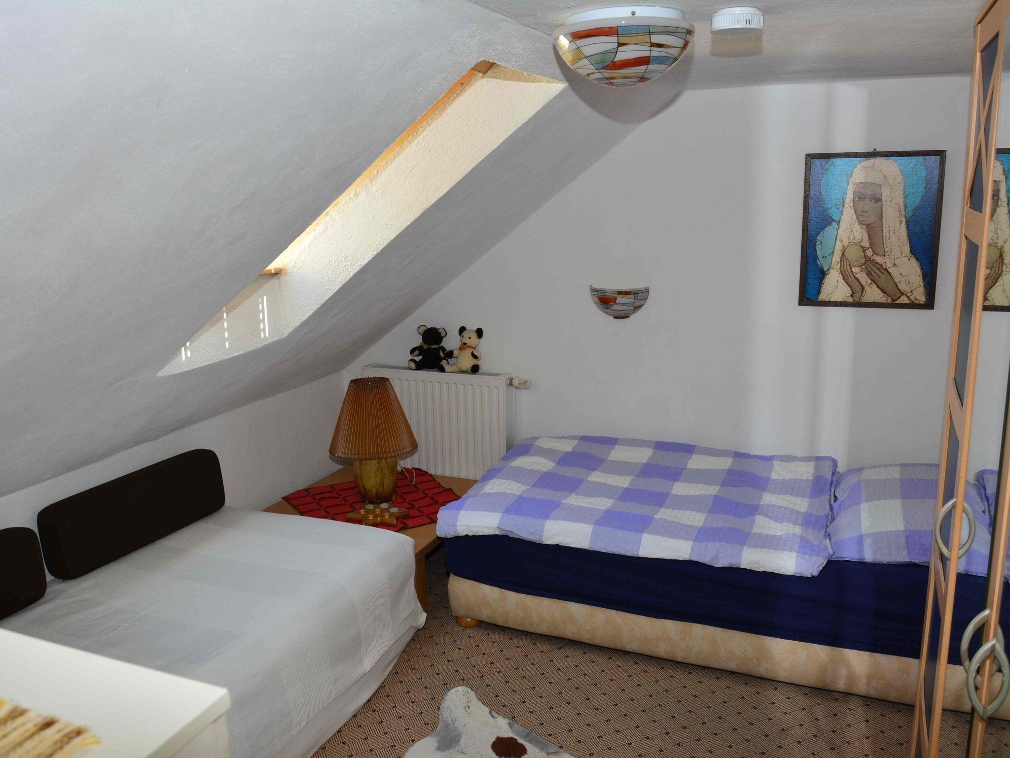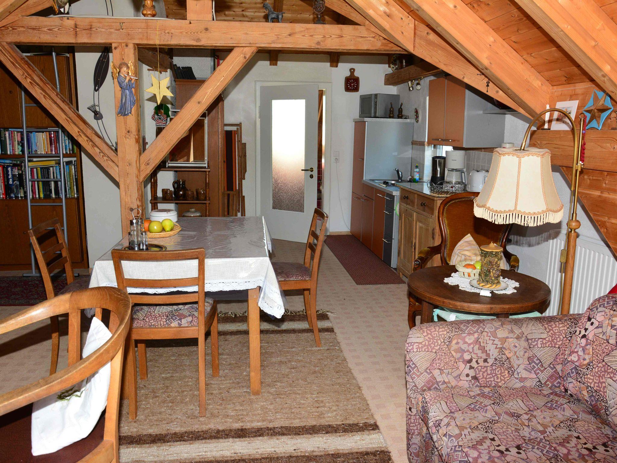 Die Ferienwohnung (ca. 75 qm) befindet sich im Dachgeschoß eines 2-Familienhauses. Sie besteht aus einem sehr großen, schön eingerichteten Wohn-/Arbeits- + Kochbereich. Der Kochbereich besteht aus einem 2 Plattenherd, Kühlschrank, Mikrowelle, Kaffeemaschine, Wasserkocher und Toaster. Im Wohn-Arbeitsbereich befinden sich eine Sitzecke mit Fernseher, eine weitere Sitzecke mit ausziehbarer Couch und einem Schreibtisch, 2 große Regale mit Büchern, die man auch lesen darf. Im Schlafzimmer befinden sich 2 Einzelbetten, Nachtkästchen und Kleiderschrank. Das Badezimmer verfügt über eine Badewanne, WC, Föhn und Waschbecken. Bettwäsche und Handtücher sind vorhanden. W-Lan und Parkplatz können kostenfrei genutzt werden.