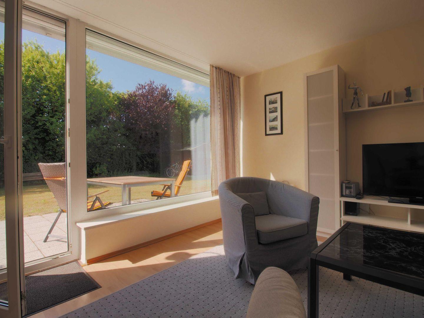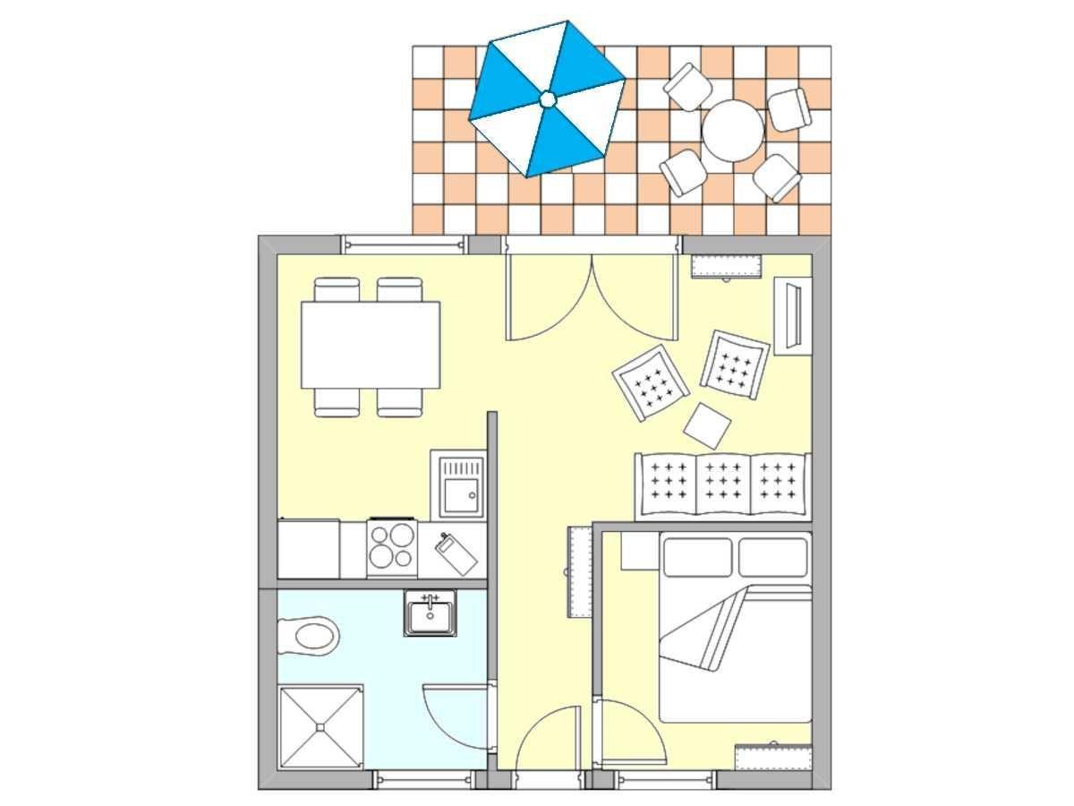 Freuen Sie sich auf ein gemütliches Schlafzimmer mit Doppelbett, ein modernes Badezimmer mit Dusche, WC, Waschtisch und Tageslicht sowie einen offenen Wohnbereich mit Sofa, TV und Esstisch. Die voll ausgestattete Küche lädt zum gemeinsamen Kochen ein – oder genießen Sie Ihr Frühstück einfach draußen: Auf der möblierten Terrasse können Sie wunderbar entspannen und die frische Seeluft genießen.