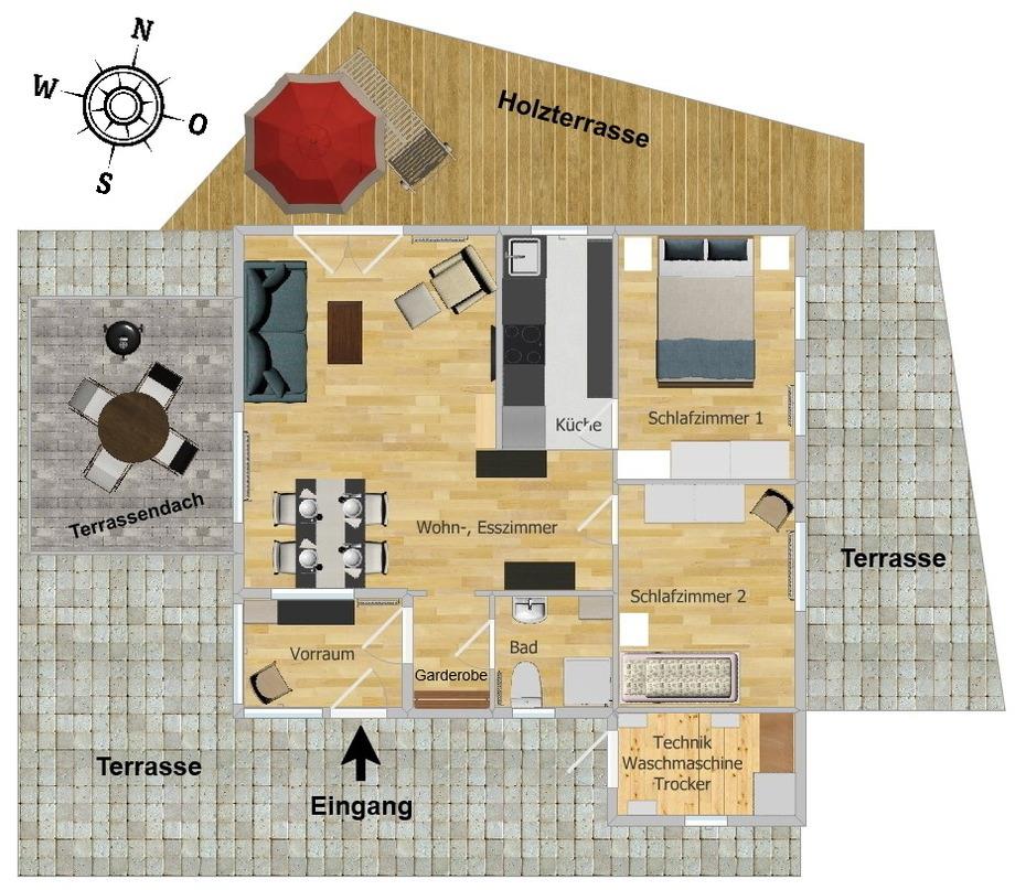 Egal, ob Sie alleine, als Paar oder mit Ihrer kleinen Familie reisen - in unserem Ferienhaus finden Sie ausreichend Platz zum Wohlfühlen. Ein behaglicher Wohnbereich, zwei Schlafzimmer, eine voll ausgestattete Küche, ein gepflegtes Badezimmer und drei einladende Terrassen bieten Komfort und Gemütlichkeit.