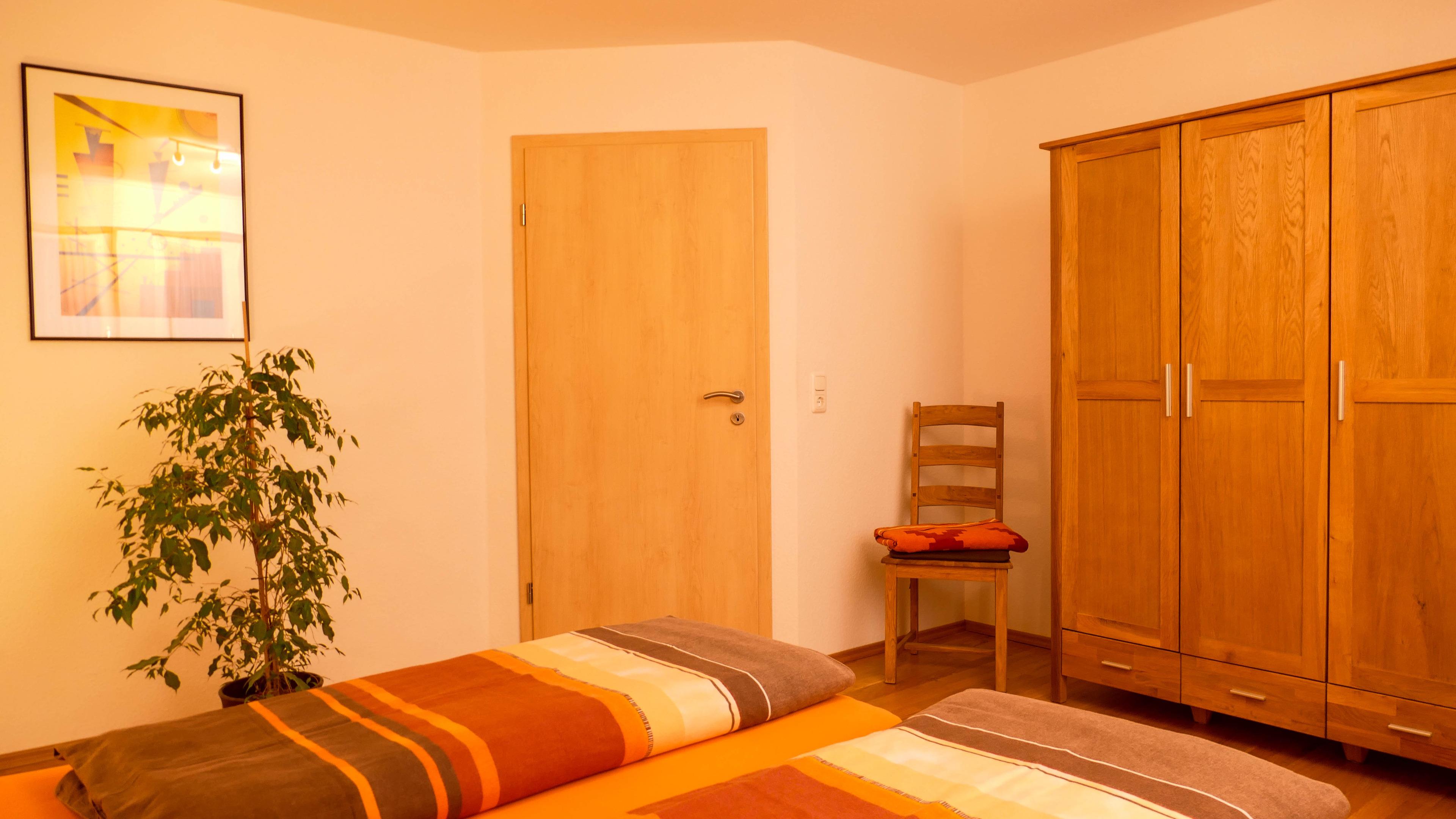 Kleiderschrank mit Möbel-Safe, 2 Stühle, 2 Nachttische und Doppelbett. Die indirekte Beleuchtung fällt erst später auf. Dimmbar und mit je nach Geschmack einstellbarer Licht-Farbe.