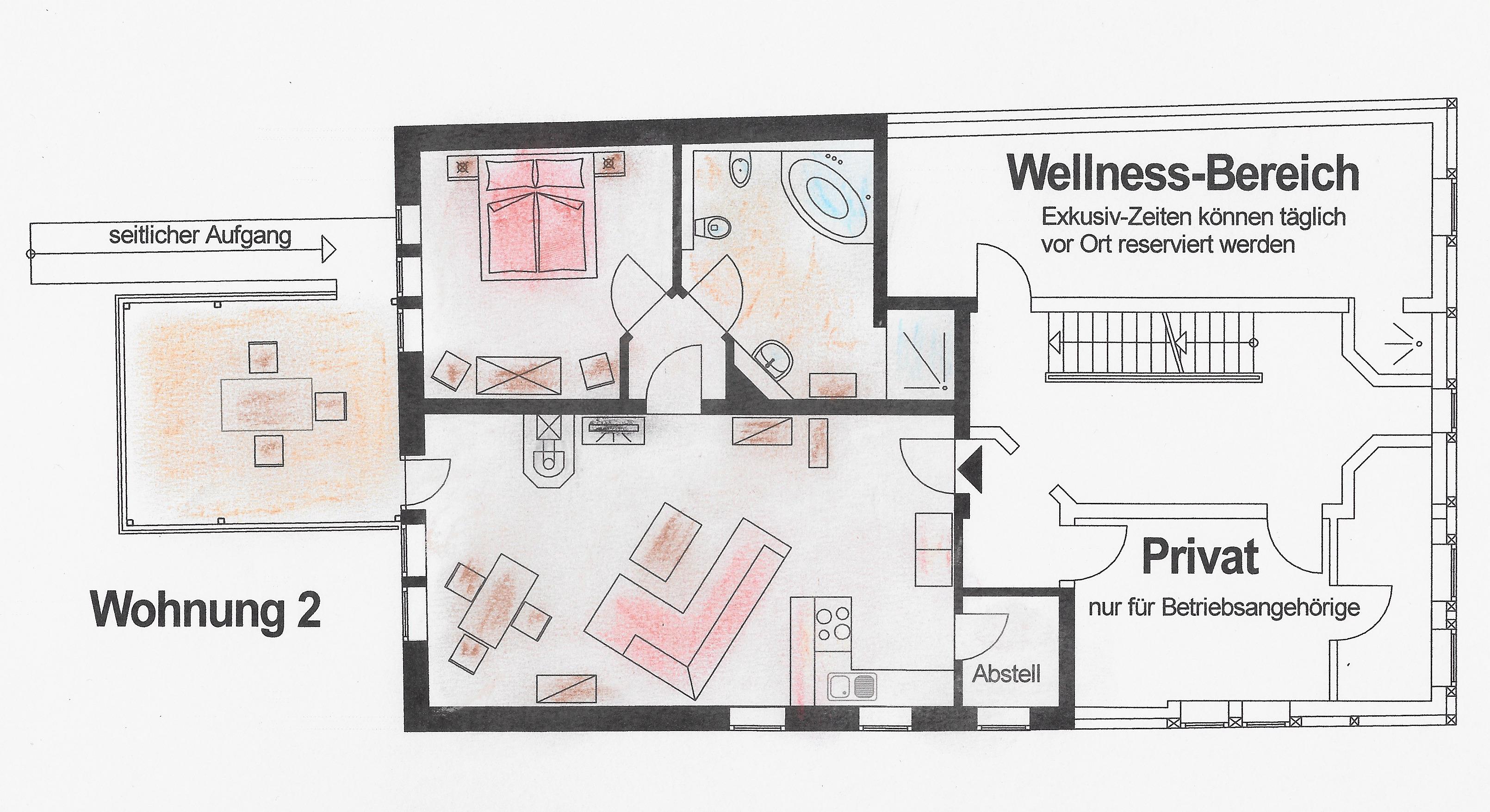 Unser Wellness-Center mit InfraRot-Wärmekabine (Niedertemperatur-Sauna) und hhp-Massageliegen steht den Gästen unserer Luxus-Ferienwohnungen (jede mit eigenem Whirlpool und Kamin) kostenfrei zur Verfügung.