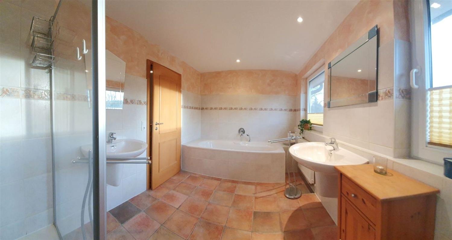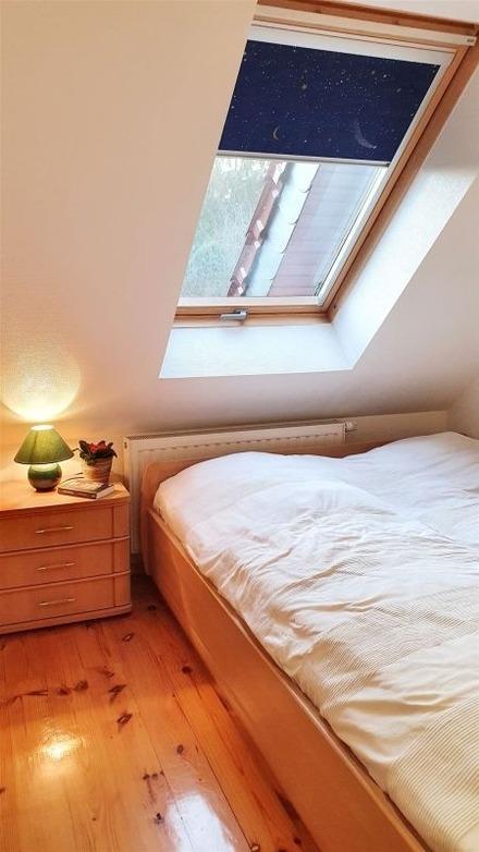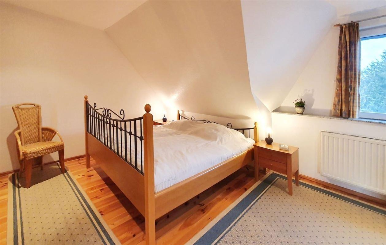 Vier Schlafzimmer und ein großes Bad mit Wanne und Dusche bilden das Obergeschoß. Drei Schlafzimmer verfügen über große Doppelbetten, eines über ein Bett mit 1,0 Metern Breite. In den Schränken ist viel Stauraum für Kleidung und Wäsche für 7 Personen vorhanden, auch für einen längeren Zeitraum.