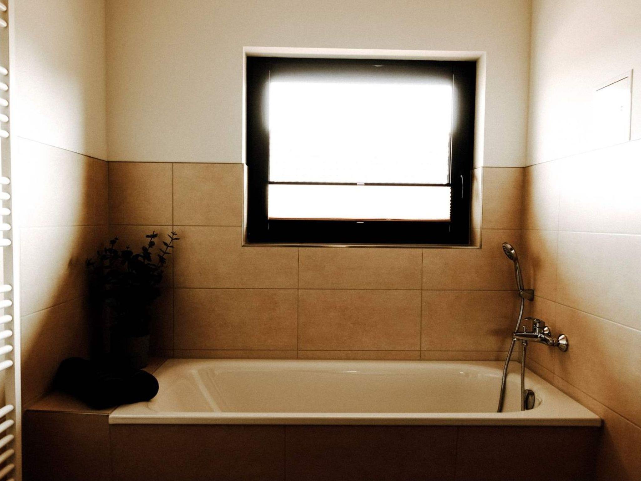Das Badezimmer ist stilvoll und funktional ausgestattet. Es bietet eine bodengleiche Dusche sowie eine separate Badewanne, ein WC und ein Waschbecken. Ein Fön steht Ihnen zur Verfügung, und durch das Fenster fällt Tageslicht in den Raum. Handtücher liegen für Sie bereit.
