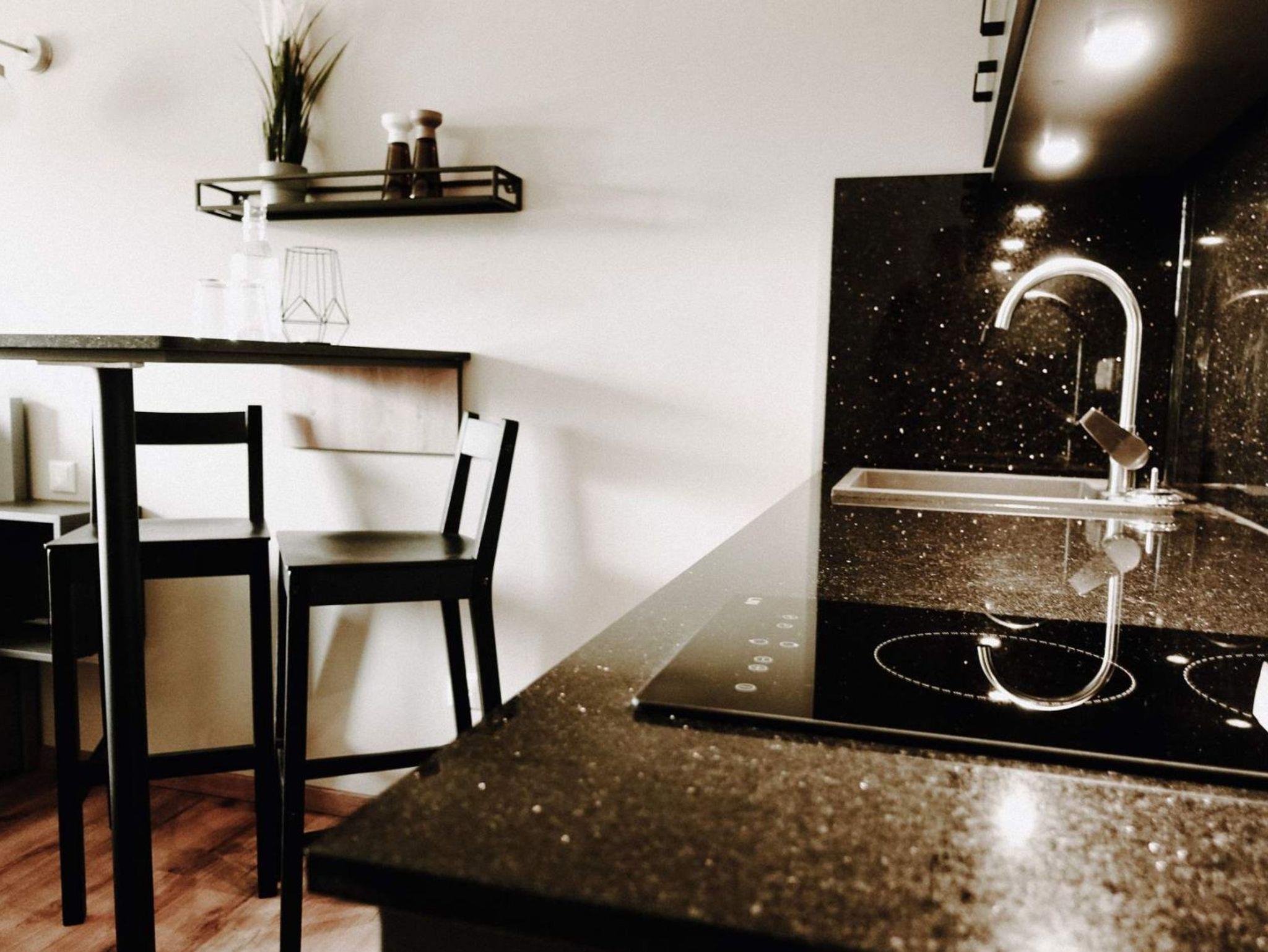 Der Schlaf- und Küchenbereich ist durchdacht gestaltet und verfügt über ein komfortables Bett (180×200 cm) sowie eine moderne Küchenzeile. Diese ist mit einem Bartisch und zwei Barhockern ausgestattet und bietet alle notwendigen Geräte, wie ein Ceran-Kochfeld mit zwei Platten, eine Mikrowelle, einen Kühlschrank mit kleinem Gefrierfach und eine Spülmaschine. Auch Geschirr, Besteck, Küchenutensilien und ein Geschirrhandtuch sind vorhanden, ebenso ein Abfalleimer, Wasserkocher, Toaster und eine French Press für den perfekten Start in den Tag.