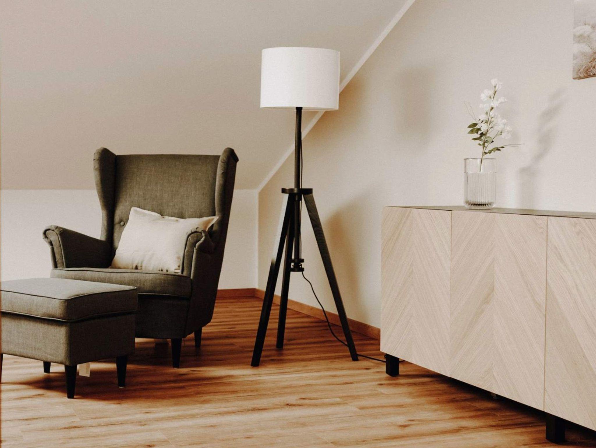 Die Wohnung verfügt über eine begehbare Garderobe und eine Fußbodenheizung, die in der kühleren Jahreszeit für ein angenehmes Raumklima sorgt. Zur Ausstattung gehören außerdem ein Ganzkörperspiegel und ein Besen. Im stilvollen Wohnbereich lädt eine gemütliche Sofaecke zum Entspannen ein, während der angrenzende Essbereich mit einem großen Esstisch genügend Platz für gemeinsame Mahlzeiten bietet. Ein schöner Balkon mit Sofa, kleinem Tisch, zwei Stühlen und einem Hocker bietet einen zusätzlichen Rückzugsort im Freien. Für Unterhaltung stehen Ihnen drei Fernseher (im Wohnzimmer, Schlafzimmer und im Dachgeschoss) sowie kostenfreies WLAN zur Verfügung.