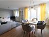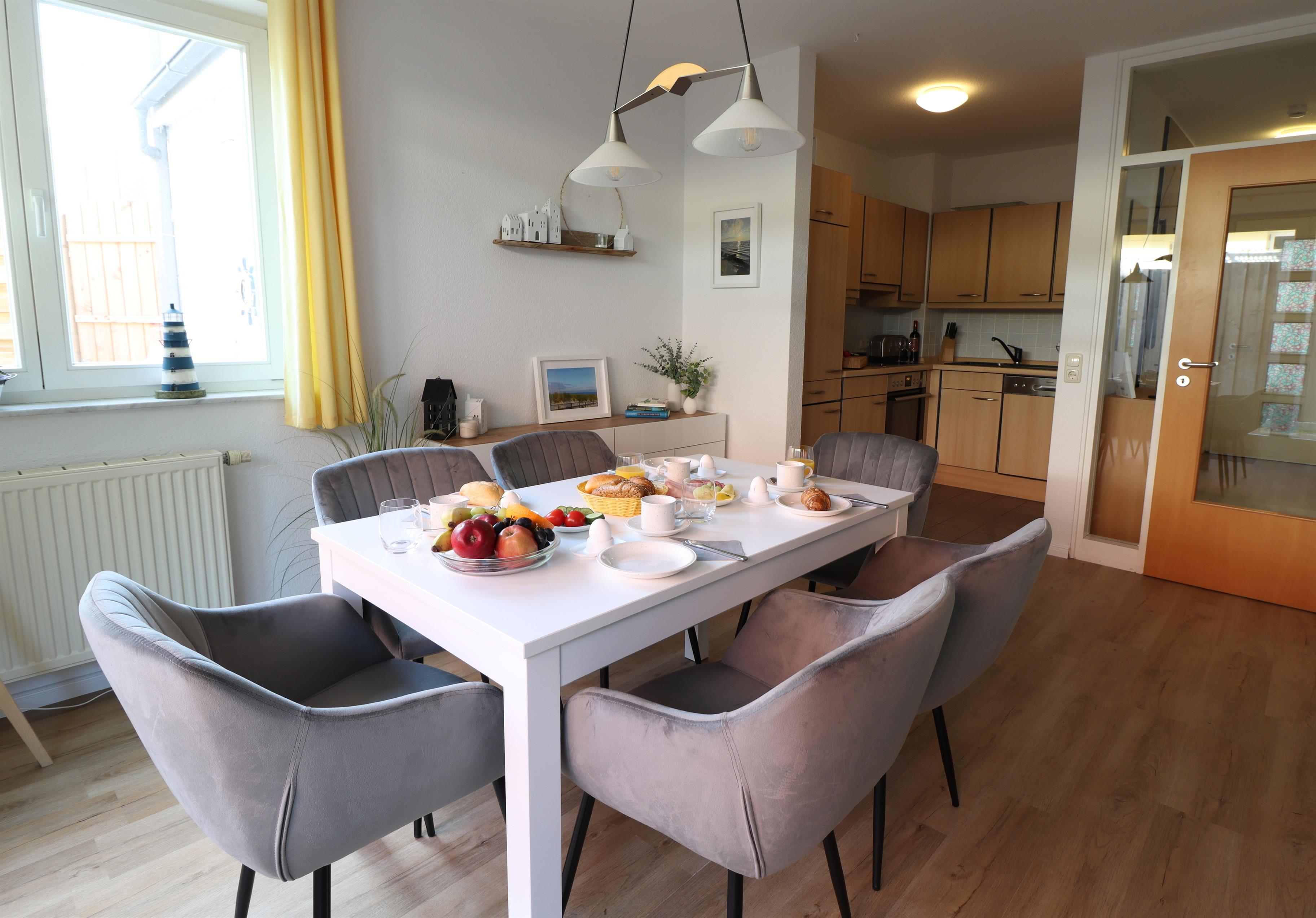 Im Wohn-/Esszimmer gibt es eine gemütliche Sitzecke mit einer 3-Sitzer-Couch, zwei bequemen Schwingsesseln, HD-Flachbild TV, HiFi Anlage sowie einen separaten Esstisch mit 6 Stühlen. Der WLAN Zugang kann genutzt werden.