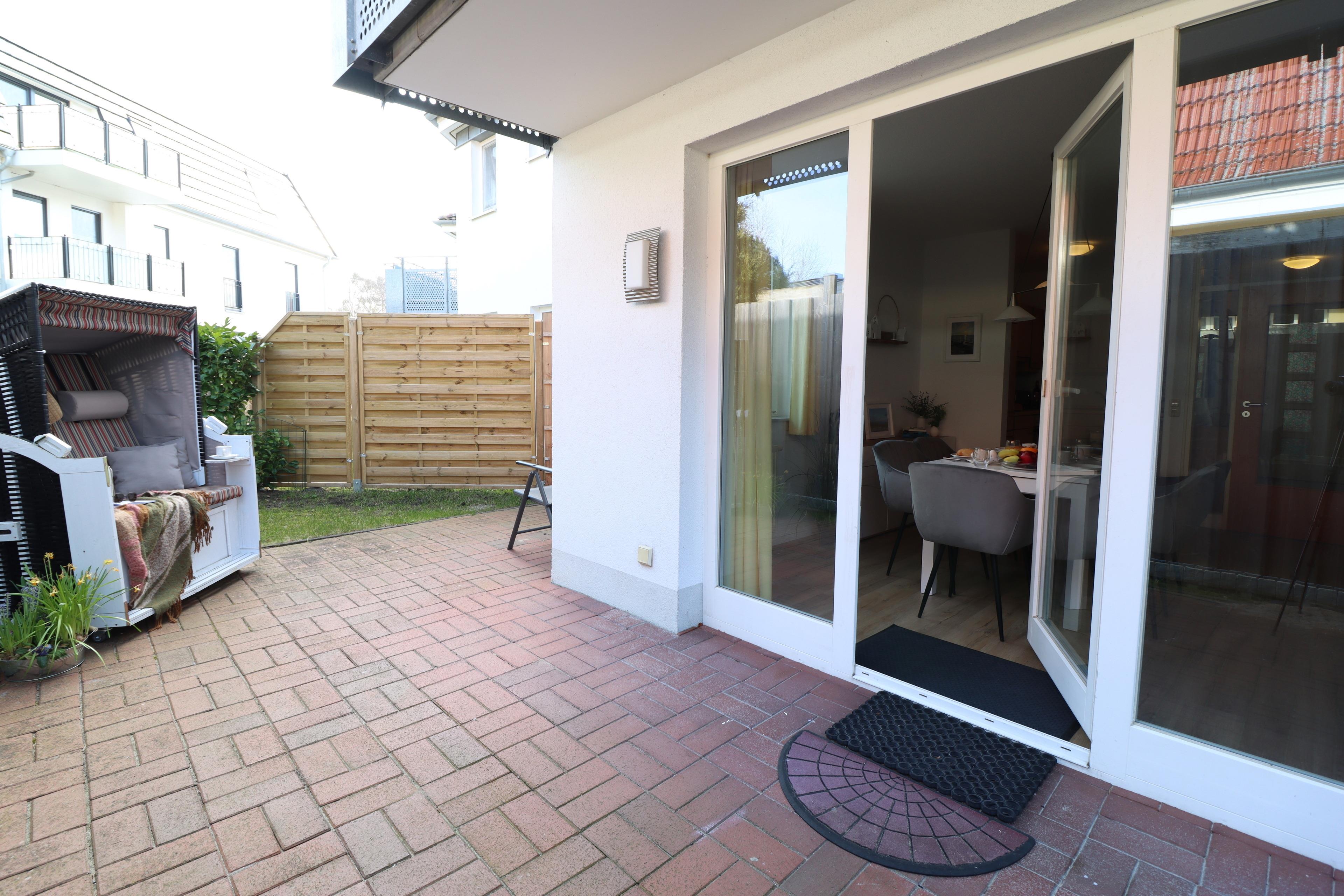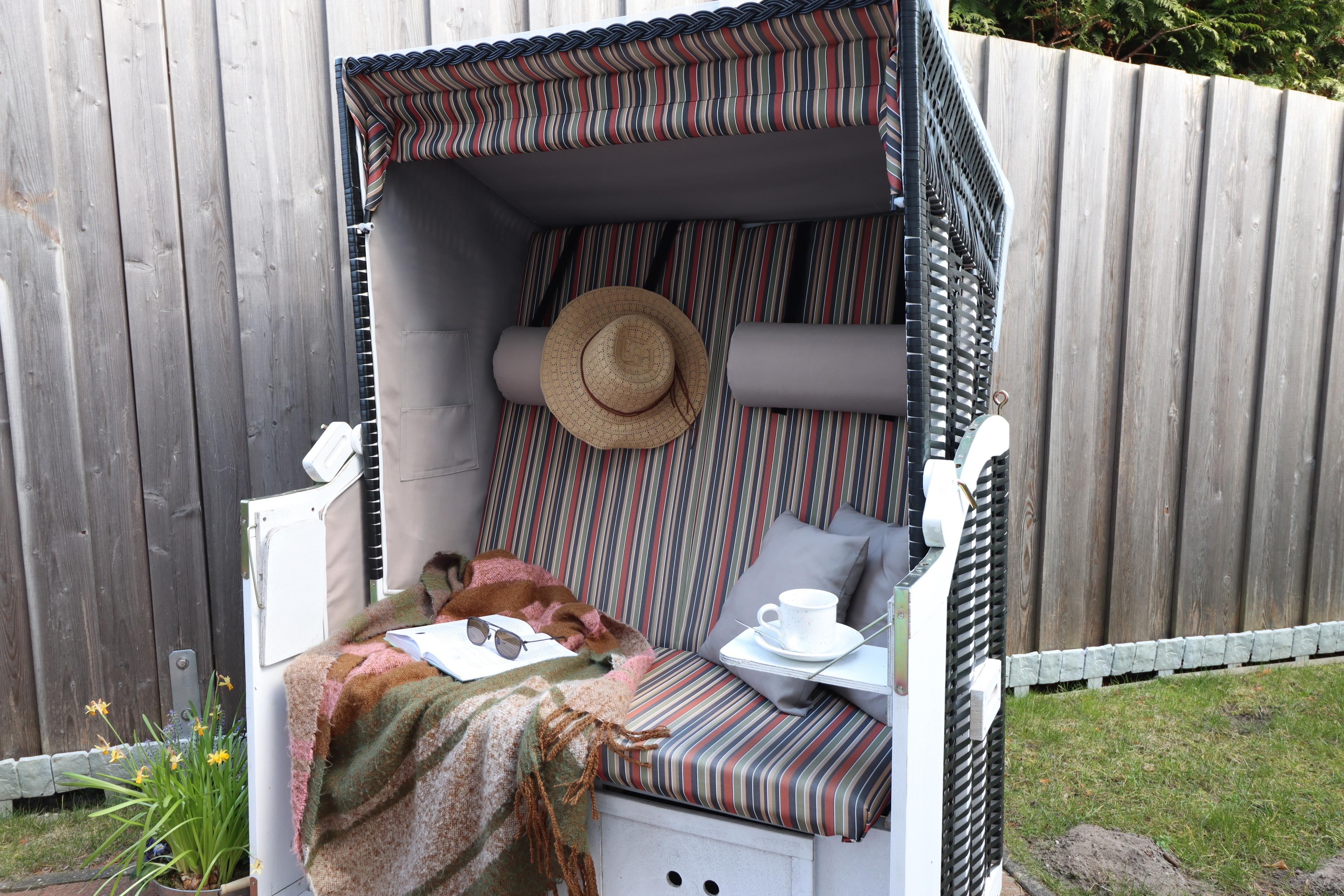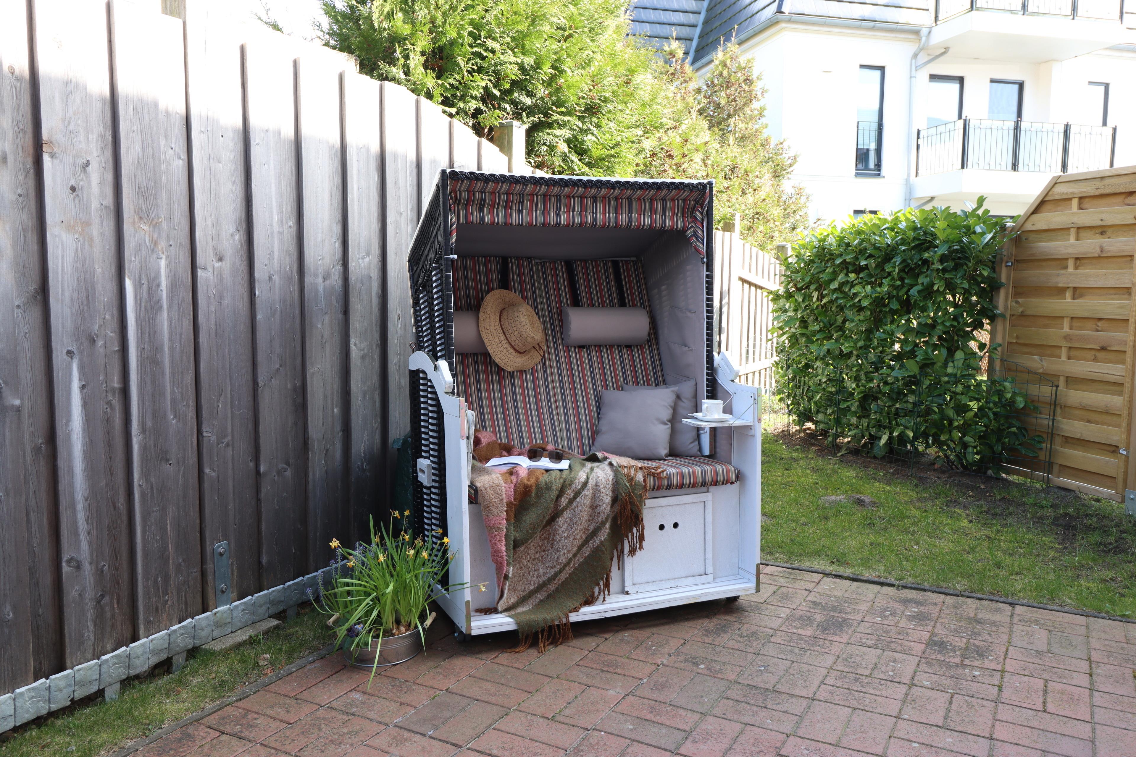 Für den Aufenthalt auf der eigenen Terrasse stehen ein Strandkorb sowie ein Tisch mit 4 verstellbaren Stühlen zur Verfügung.