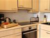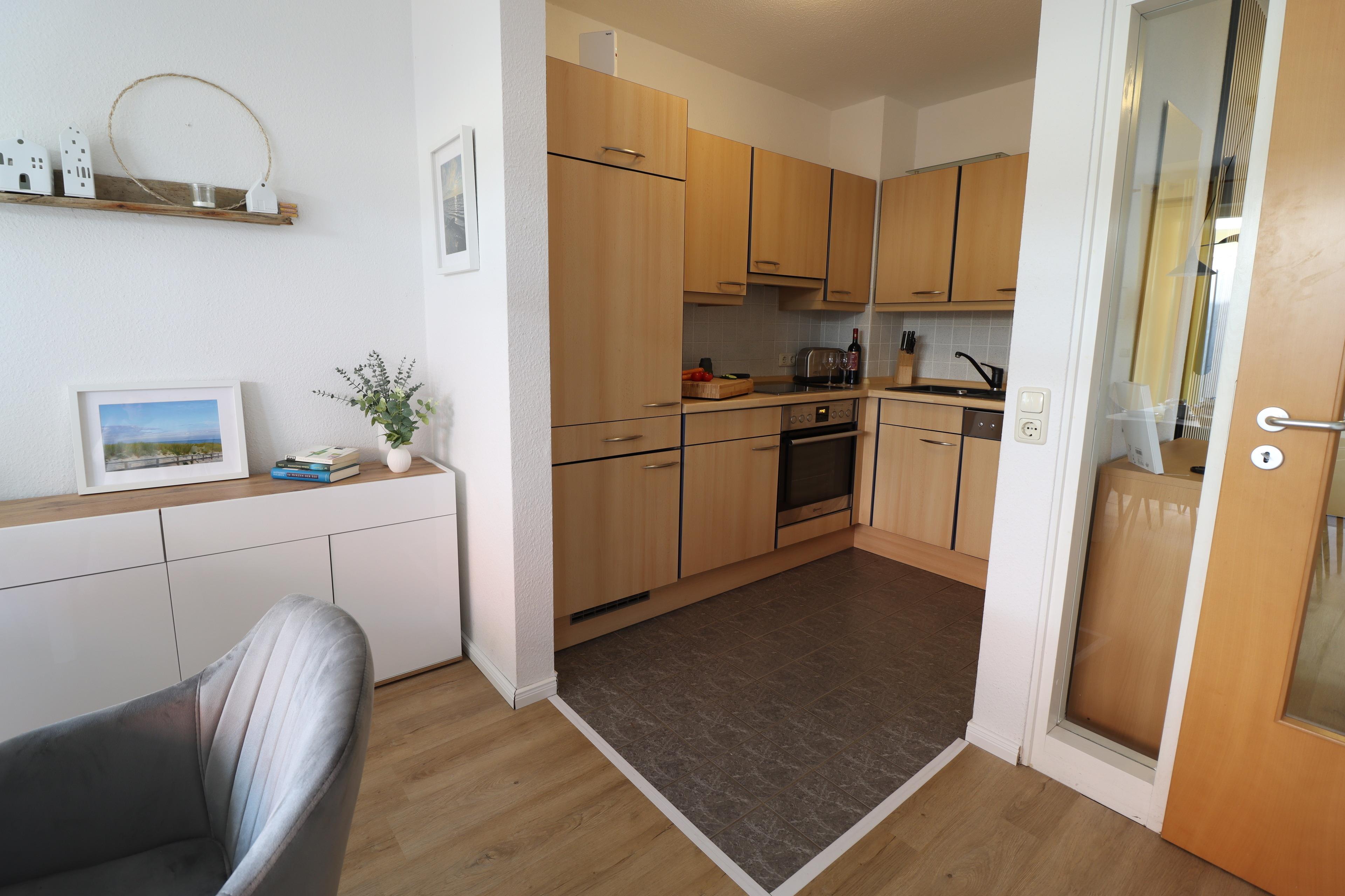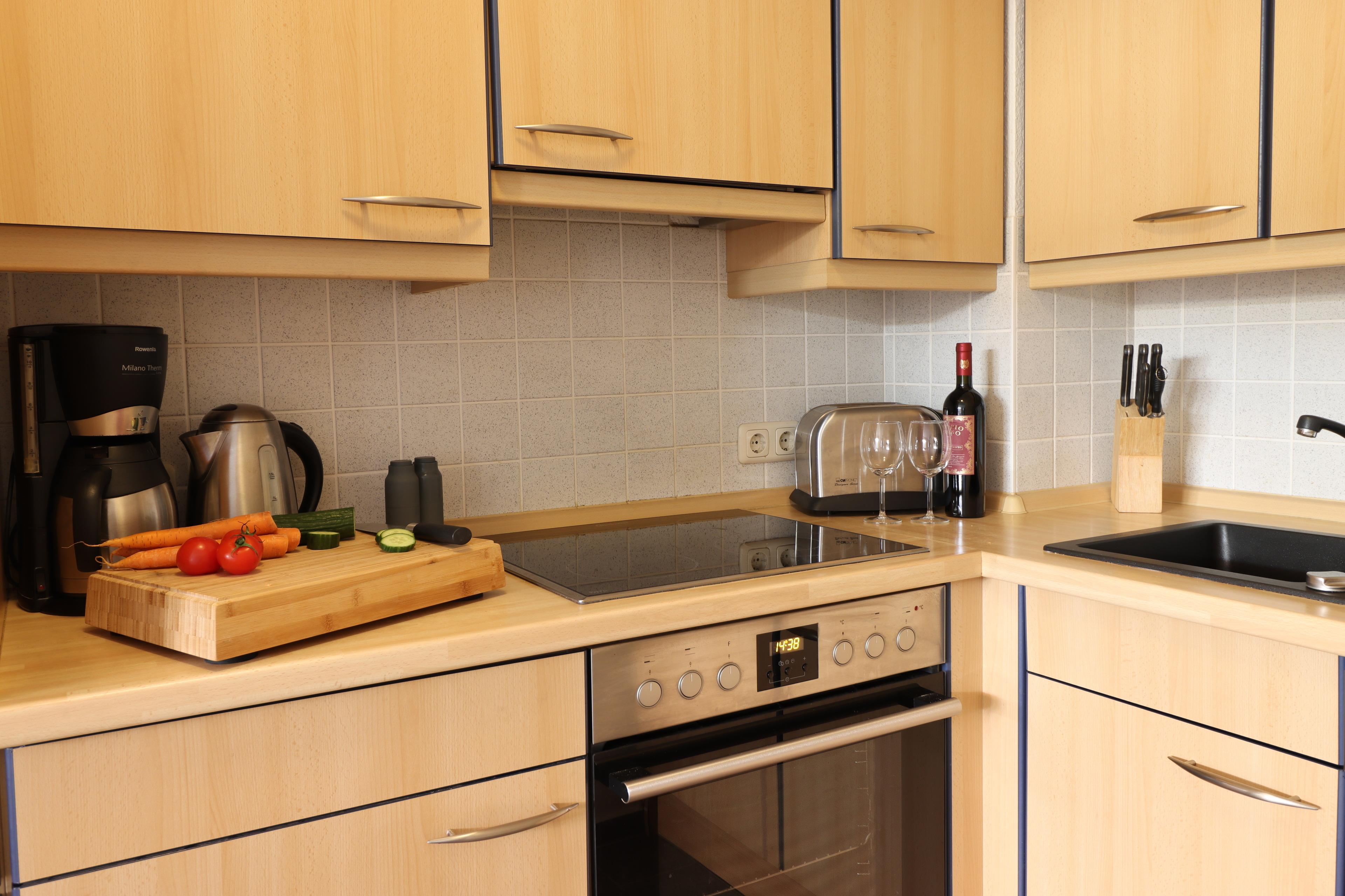 Integriert ist die komfortabel ausgestattete Küchenzeile mit E-Herd/Backofen, Dunstabzug, Geschirrspüler, Kühlschrank mit Gefrierfach, Kaffeemaschine, Toaster, und Wasserkocher. Vorhanden sind natürlich Utensilien, die man zum Kochen benötigt.
