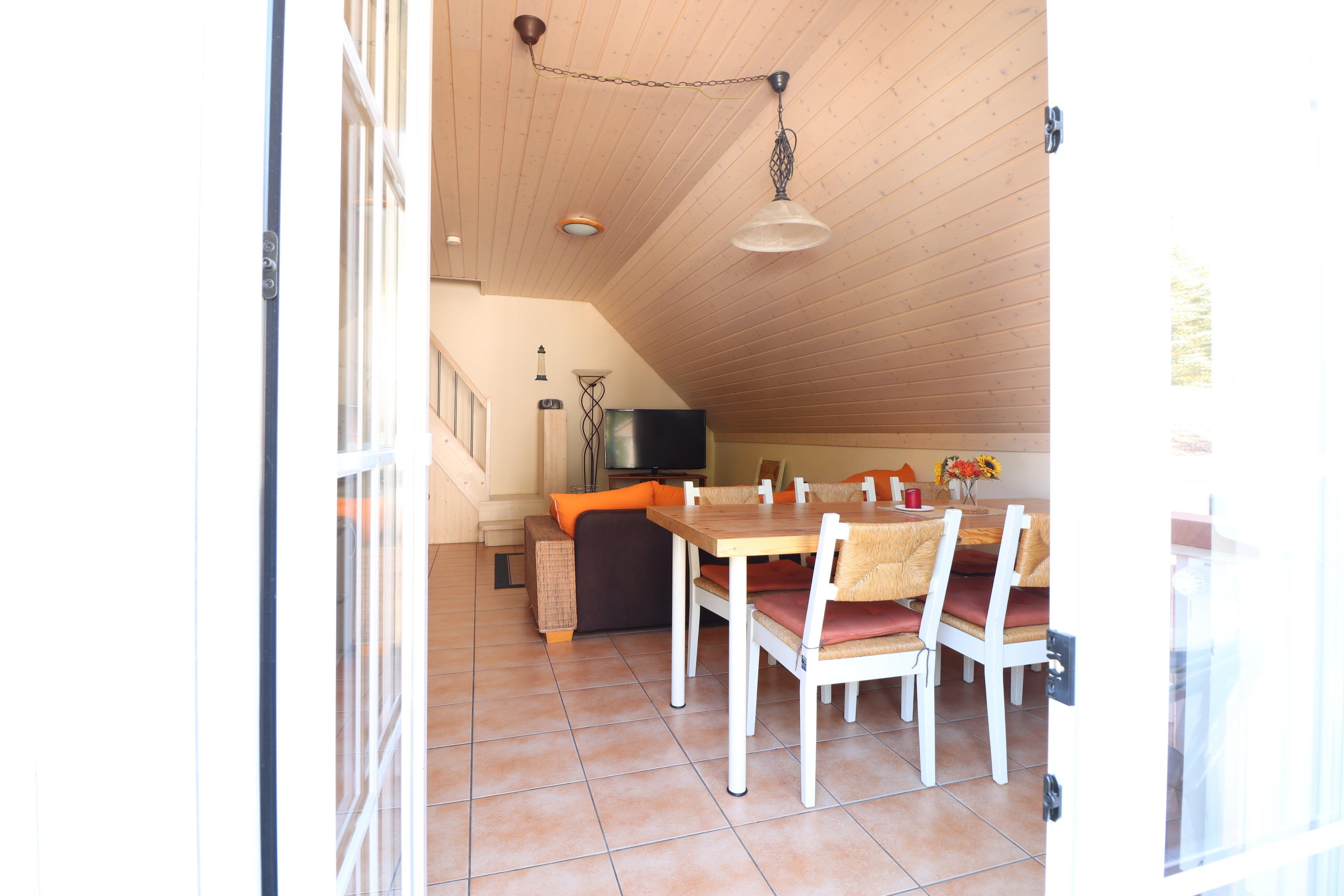 Das Maisonetteapartement für max. 5 Personen verfügt über 1 Wohnzimmer mit Küchenzeile, 1 Schlafzimmer mit Doppelbett, 1 Schlafzimmer mit 2 Tandembetten (im Spitzboden) und Kinderbett sowie Dusche/WC. Der PKW-Stellplatz befindet sich direkt am Haus. Im Haus stehen Ihnen eine Waschmaschine und ein Trockner gegen Gebühr zur Verfügung. Das Rauchen ist nicht erlaubt, Haustiere sind gestattet. Im Apartement steht Ihnen kostenfrei W-LAN zur Verfügung.