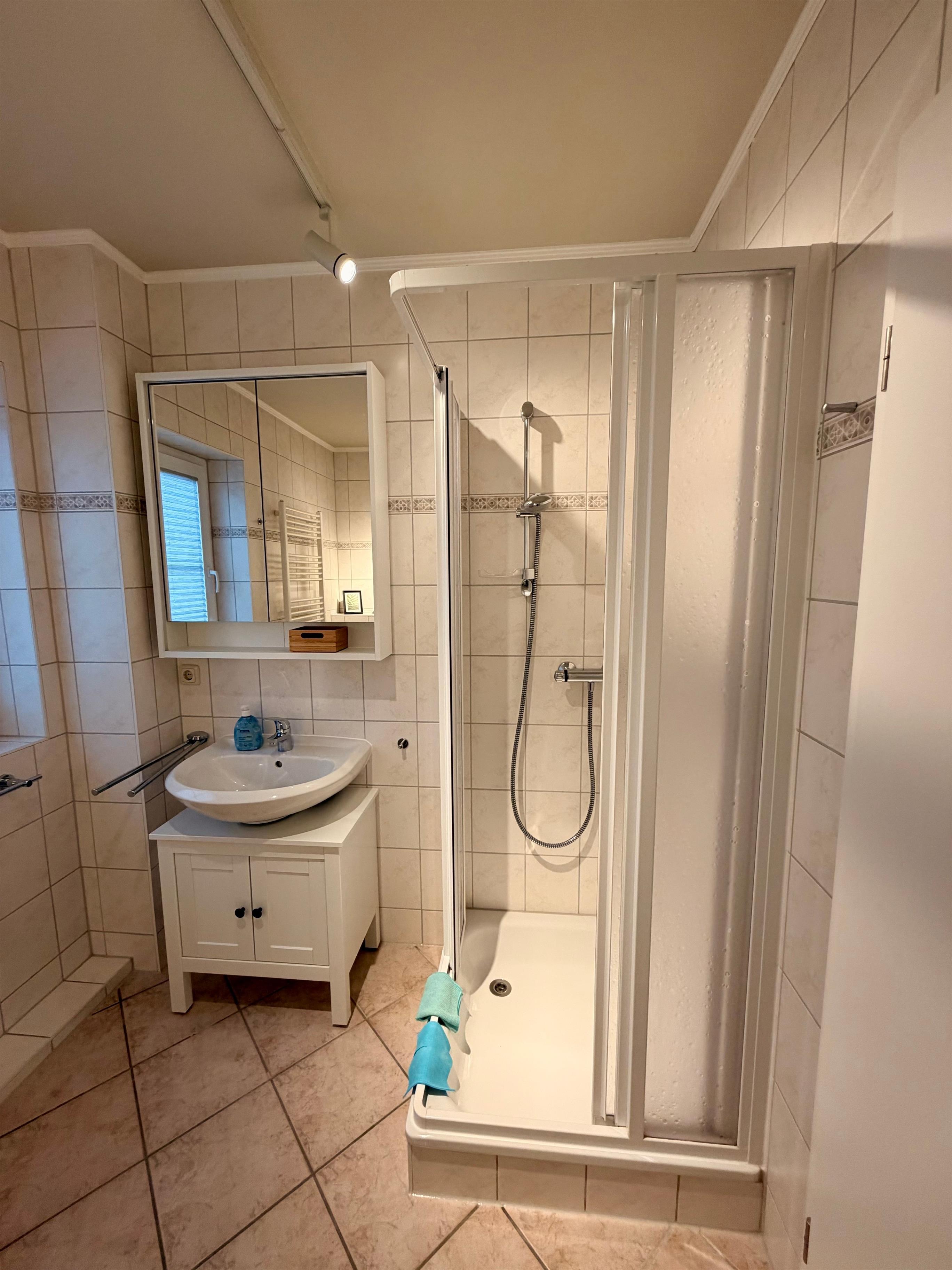 Das moderne Badezimmer ist mit einer komfortablen Dusche ausgestattet. In der unteren Etage befindet sich ein ruhiges Schlafzimmer, während ein weiteres, separates Schlafzimmer im oberen Bereich der Maisonette liegt und zusätzliche Privatsphäre bietet – perfekt für Familien oder kleine Gruppen.