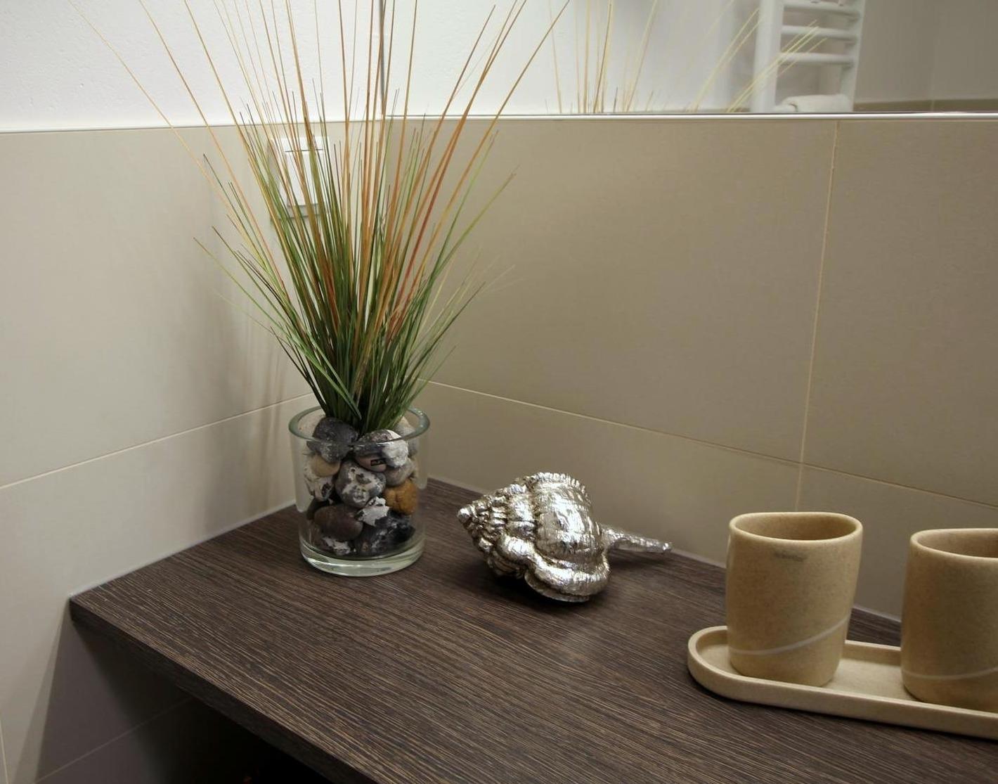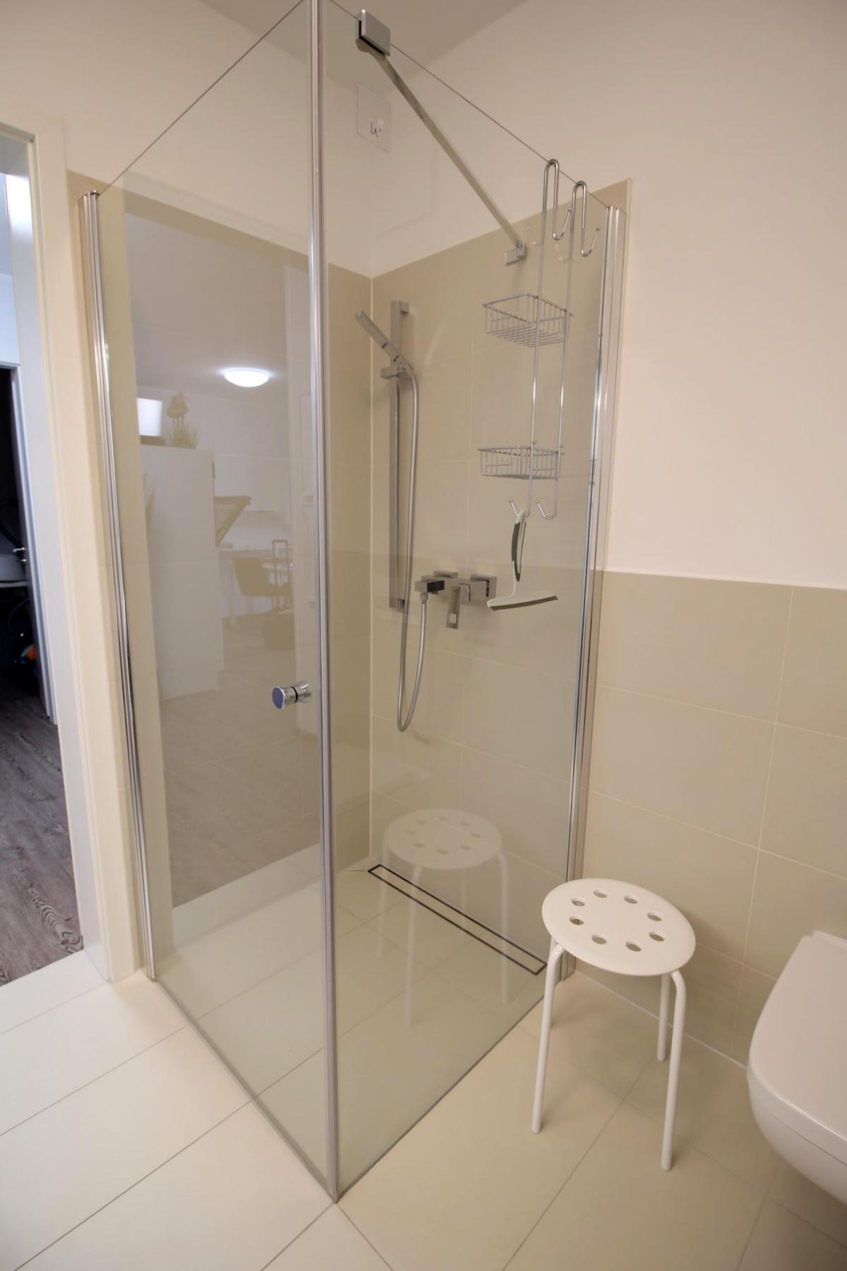 Das modern eingerichtete Bad verfügt über eine große ebenerdige Dusche, einen Handtuchheizkörper, viel Stauraum, einen großen Wandspiegel und einen beleuchteten Kosmetikspiegel.